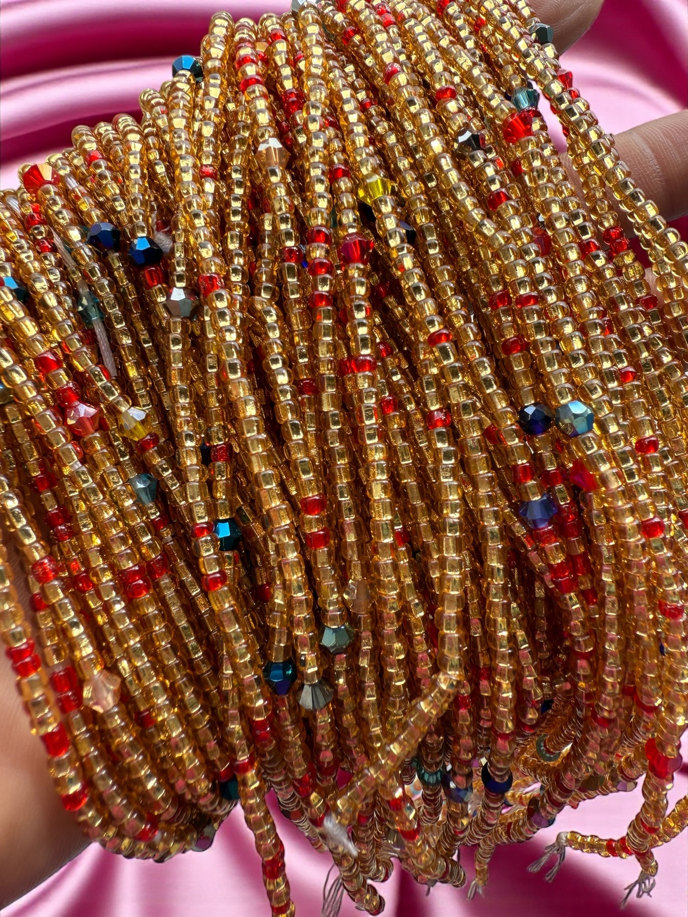 Saramani “Zuri Fire” Waist Beads – Gold with Red & Multicolor Accents | 44” Handmade Tie-On