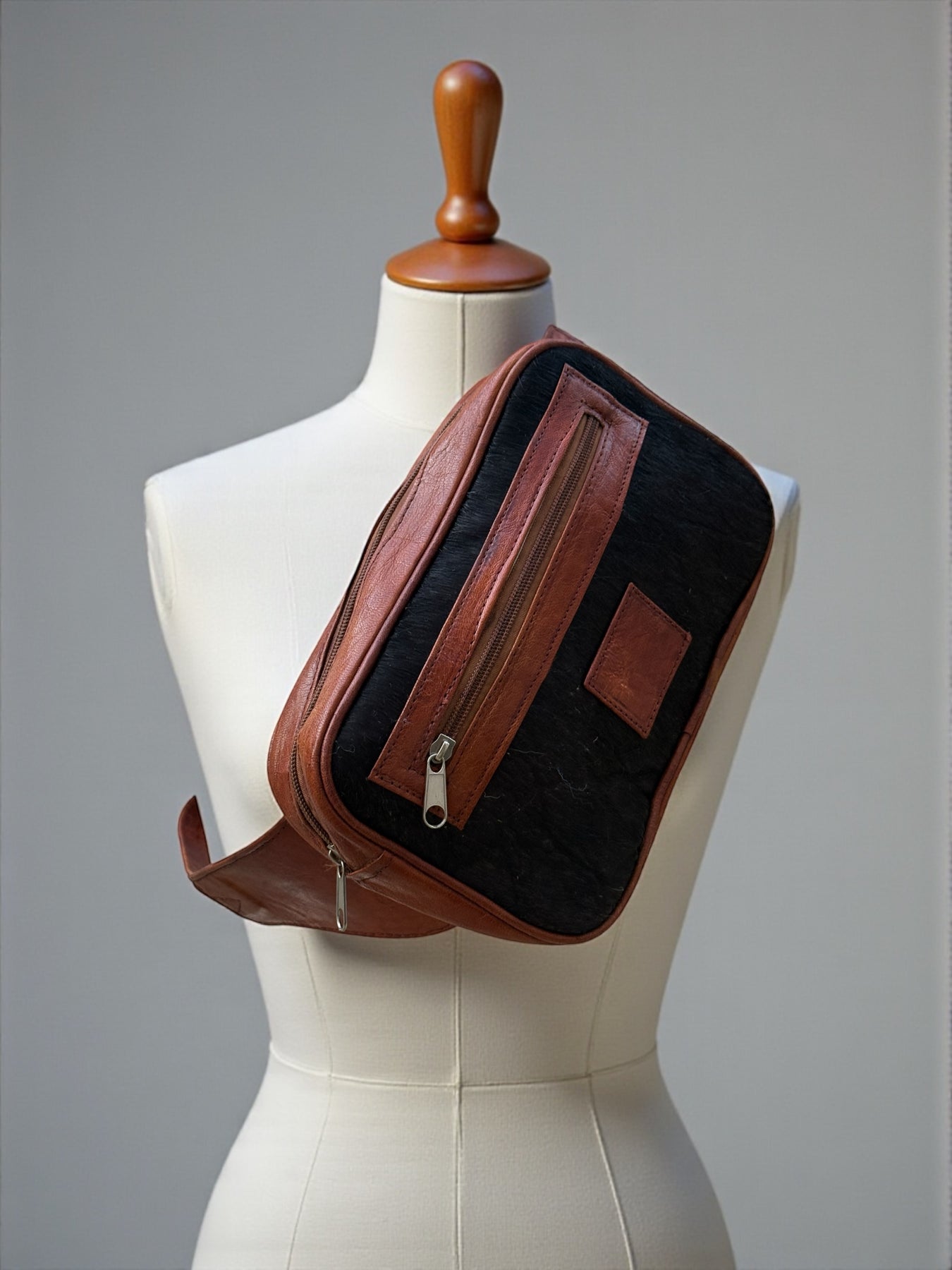 A sophisticated everyday piece crafted for style, durability, and hands-free convenience. This artisan fanny pack features chestnut brown genuine leather paired with a bold black hair-on hide front panel, giving it a striking two-tone look. Designed for both fashion and function, it can be worn across the chest or around the waist, making it ideal for travel, errands, festivals, markets, and daily wear.