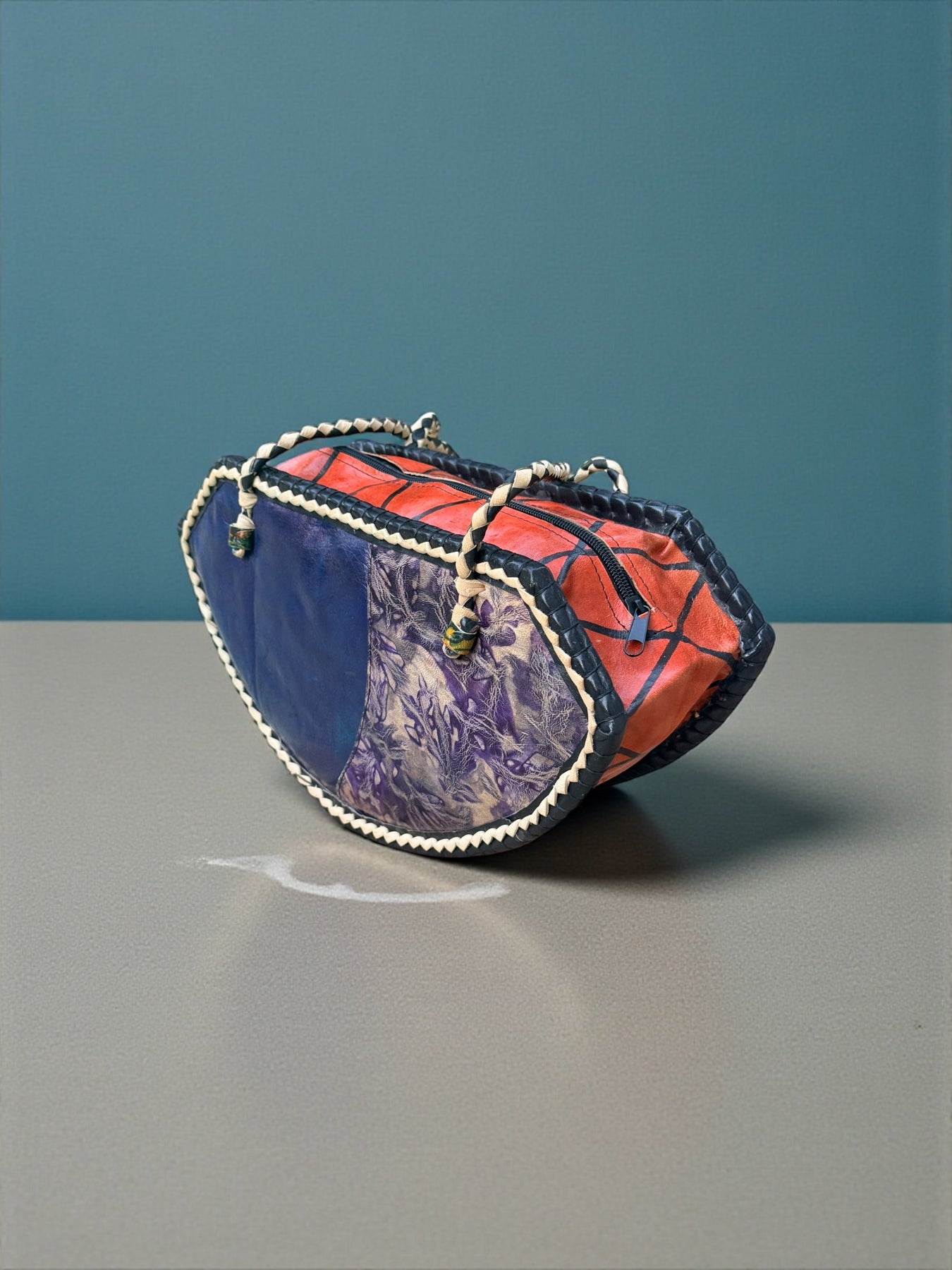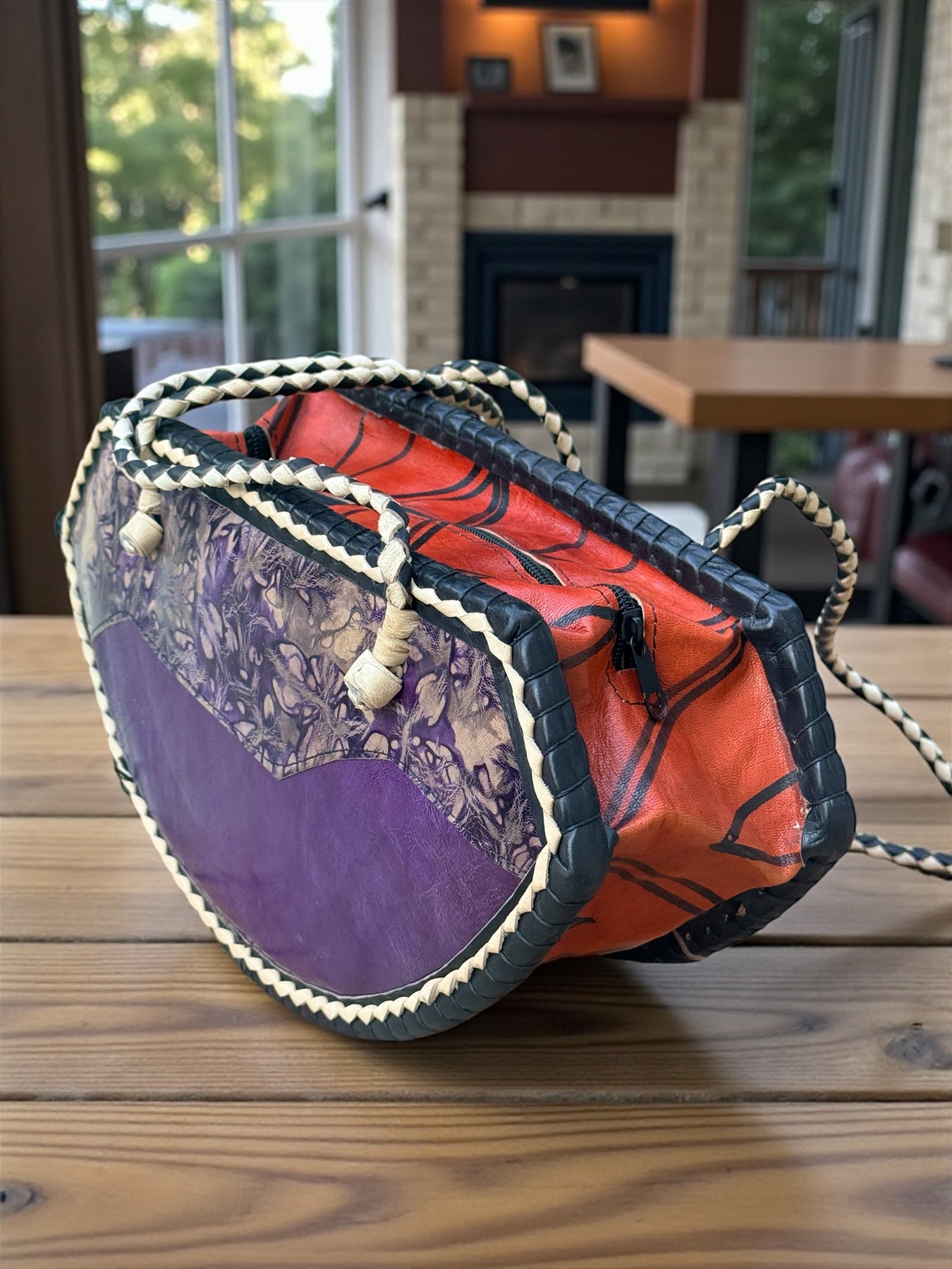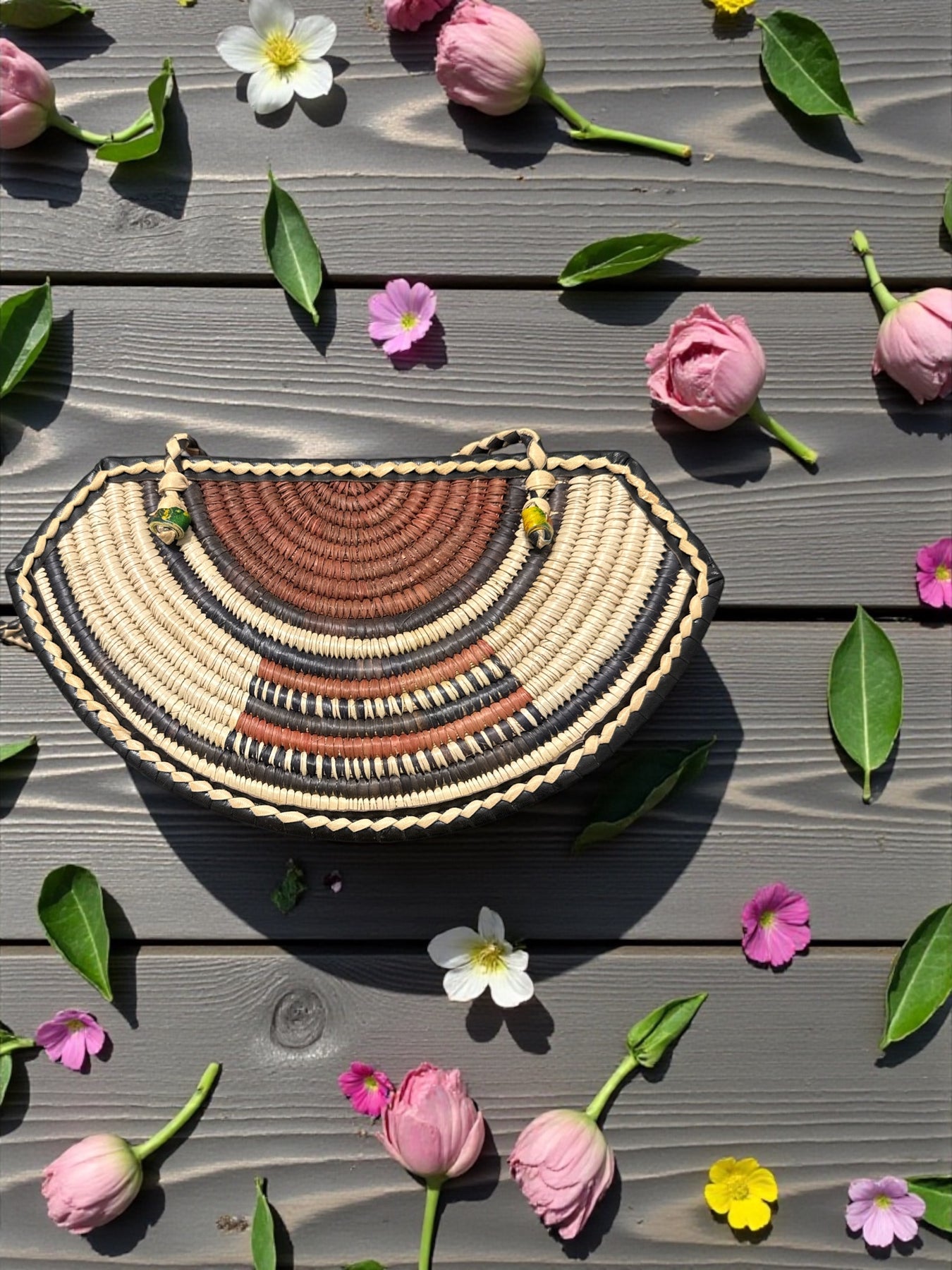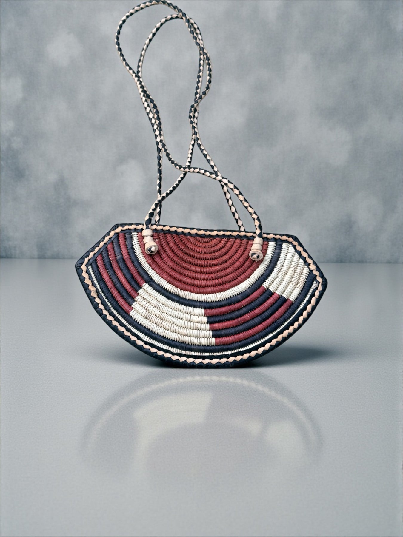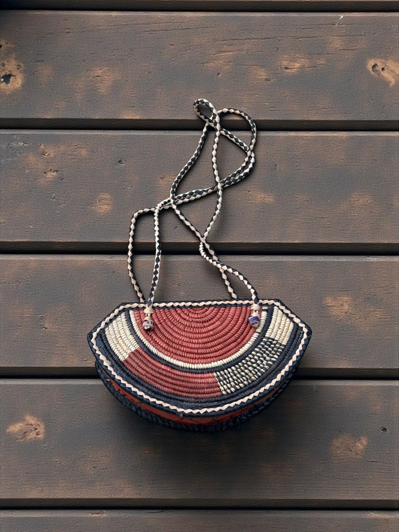 Bring home a statement accessory crafted with tradition, artistry, and culture. This unique crescent-shaped bag is handmade in Burkina Faso using a striking blend of natural rafia straw and vibrant tie-dye leather. Every piece is carefully woven and hand-stitched by skilled artisans, making each bag a one-of-a-kind work of art.