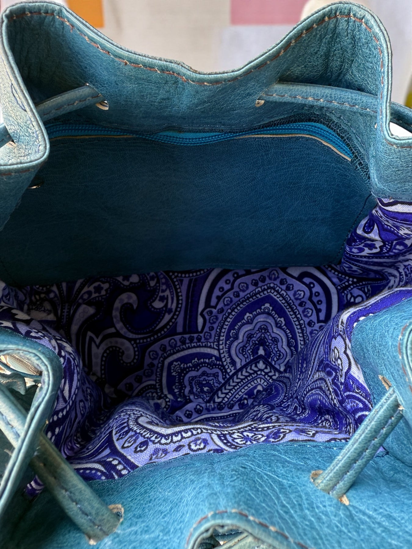 Inside, a beautifully printed fabric lining adds personality and function, with an interior zip pocket for secure storage. The tassel drawstring closure and adjustable shoulder strap make it as practical as it is striking — perfect for elevating both casual and dressy looks.