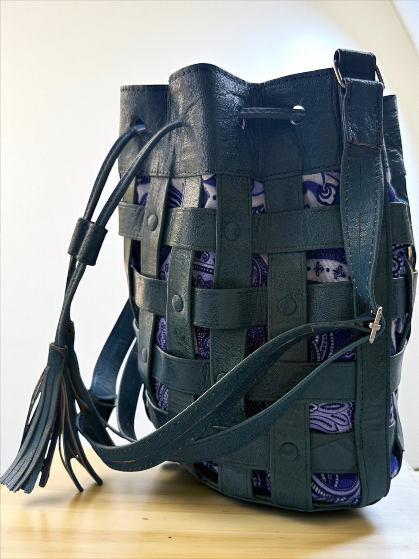 Add a cool touch of sophistication with the Teal Waffle Weave Bucket Bag, a handcrafted masterpiece that combines modern artistry with traditional craftsmanship. Made in Mali, this bag showcases genuine leather in a stunning teal hue, intricately woven into a waffle-style pattern over richly patterned African Mudcloth.