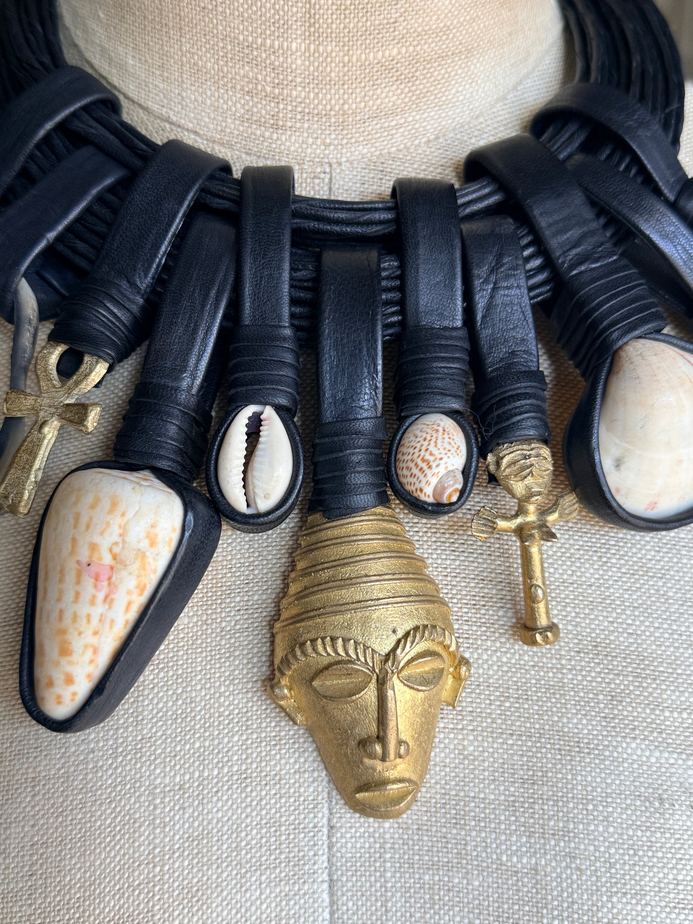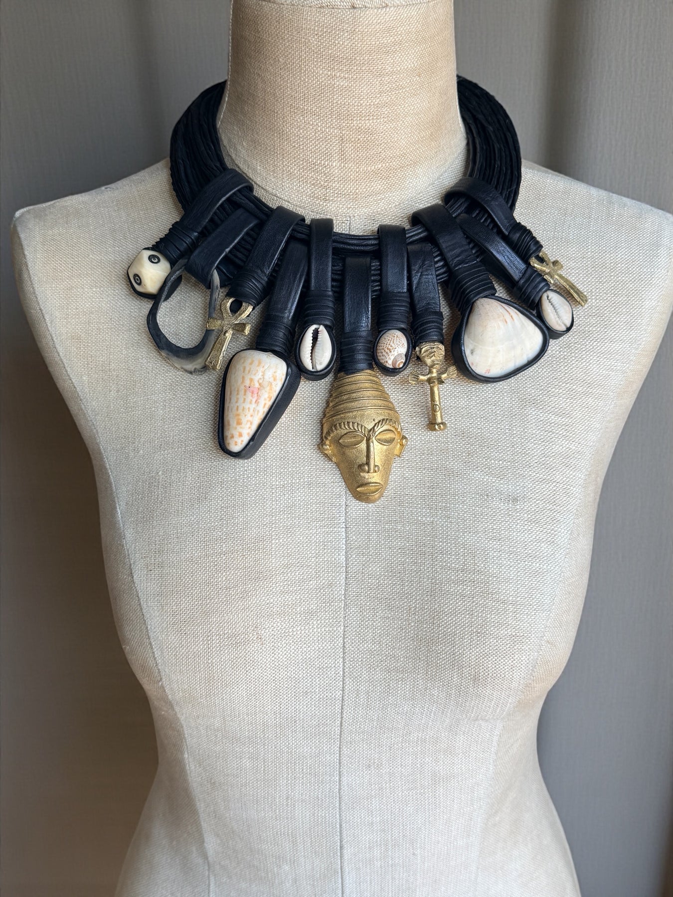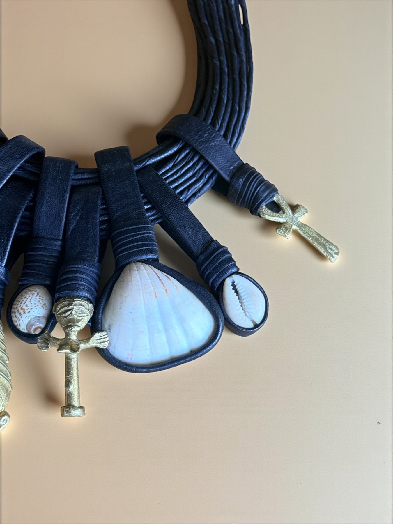 Handcrafted by skilled artisans in Mali, West Africa, this statement necklace brings together symbolism, texture, and ancestral expression. Designed as a bold collar-style piece, it features layered leather strands adorned with natural shells, sculpted brass elements, and ethically sourced bone details, each chosen for its cultural and visual significance.