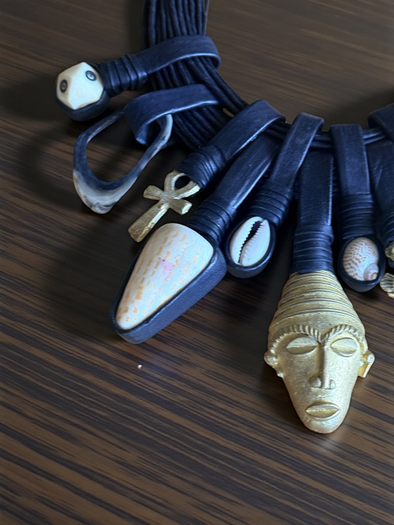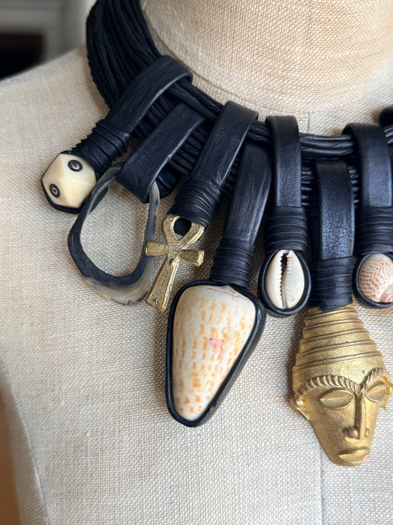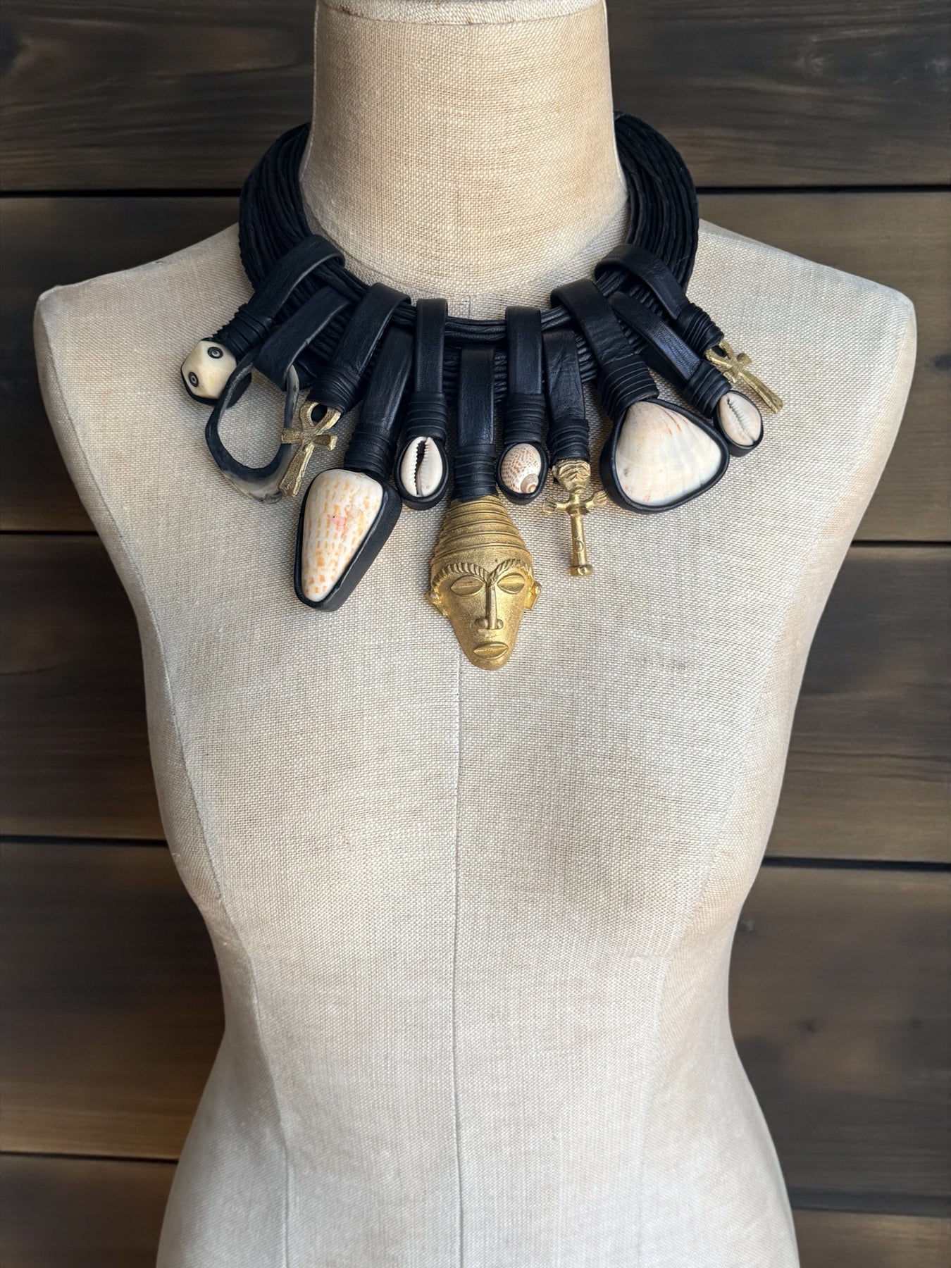 Handcrafted by skilled artisans in Mali, West Africa, this statement necklace brings together symbolism, texture, and ancestral expression. Designed as a bold collar-style piece, it features layered leather strands adorned with natural shells, sculpted brass elements, and ethically sourced bone details, each chosen for its cultural and visual significance.
