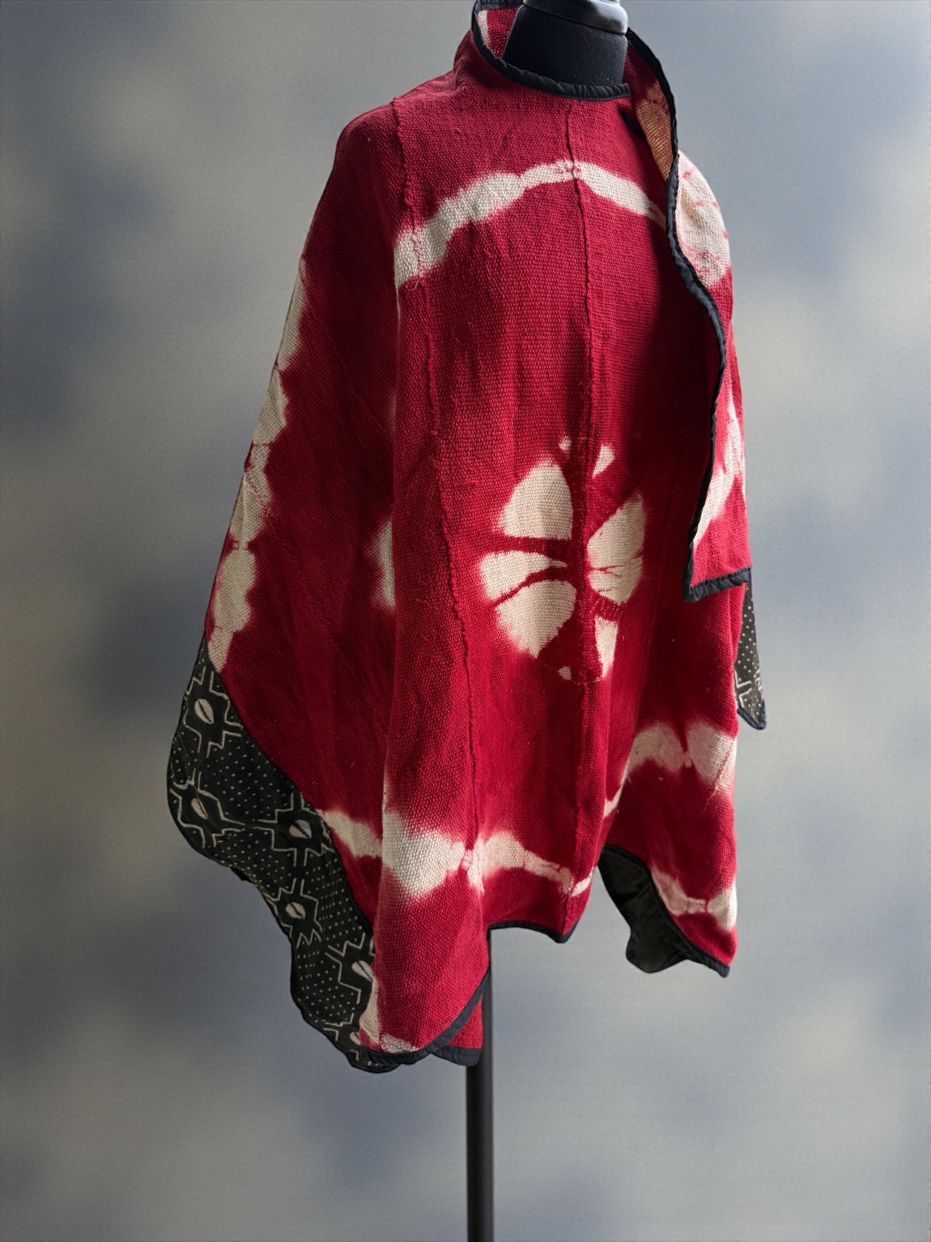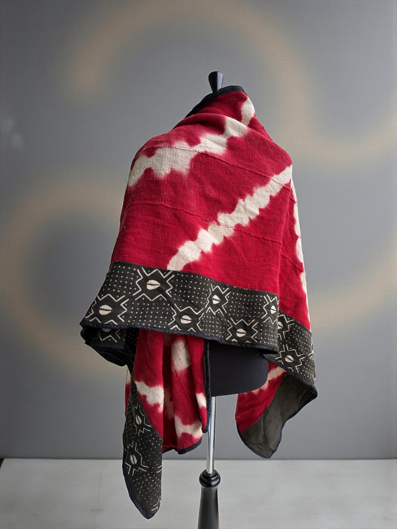 A rich crimson red shawl with organic circular and wave-like patterns created through traditional resist-dye techniques. The deep red tone adds warmth and drama, while the contrasting patterned trim grounds the piece with visual depth.