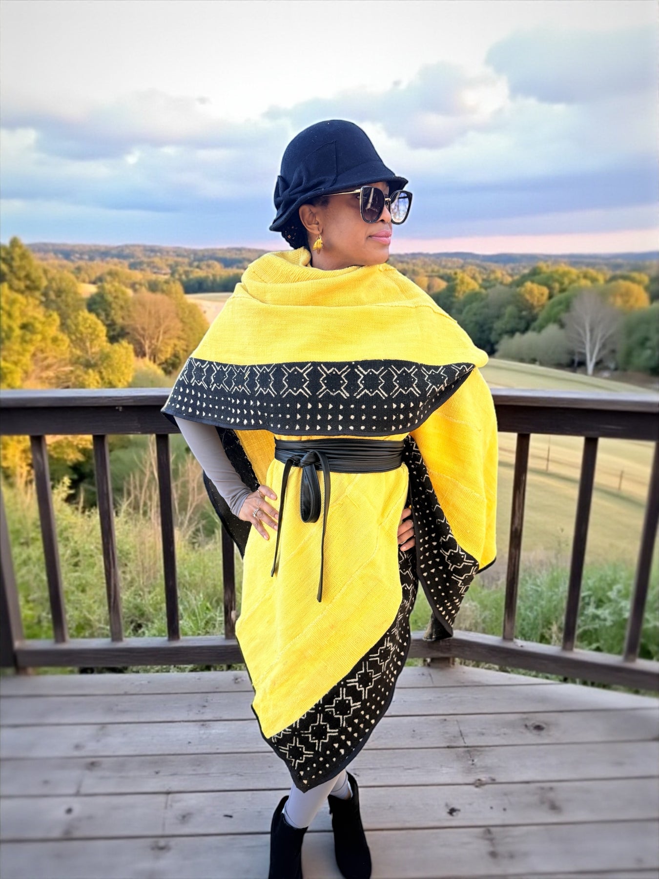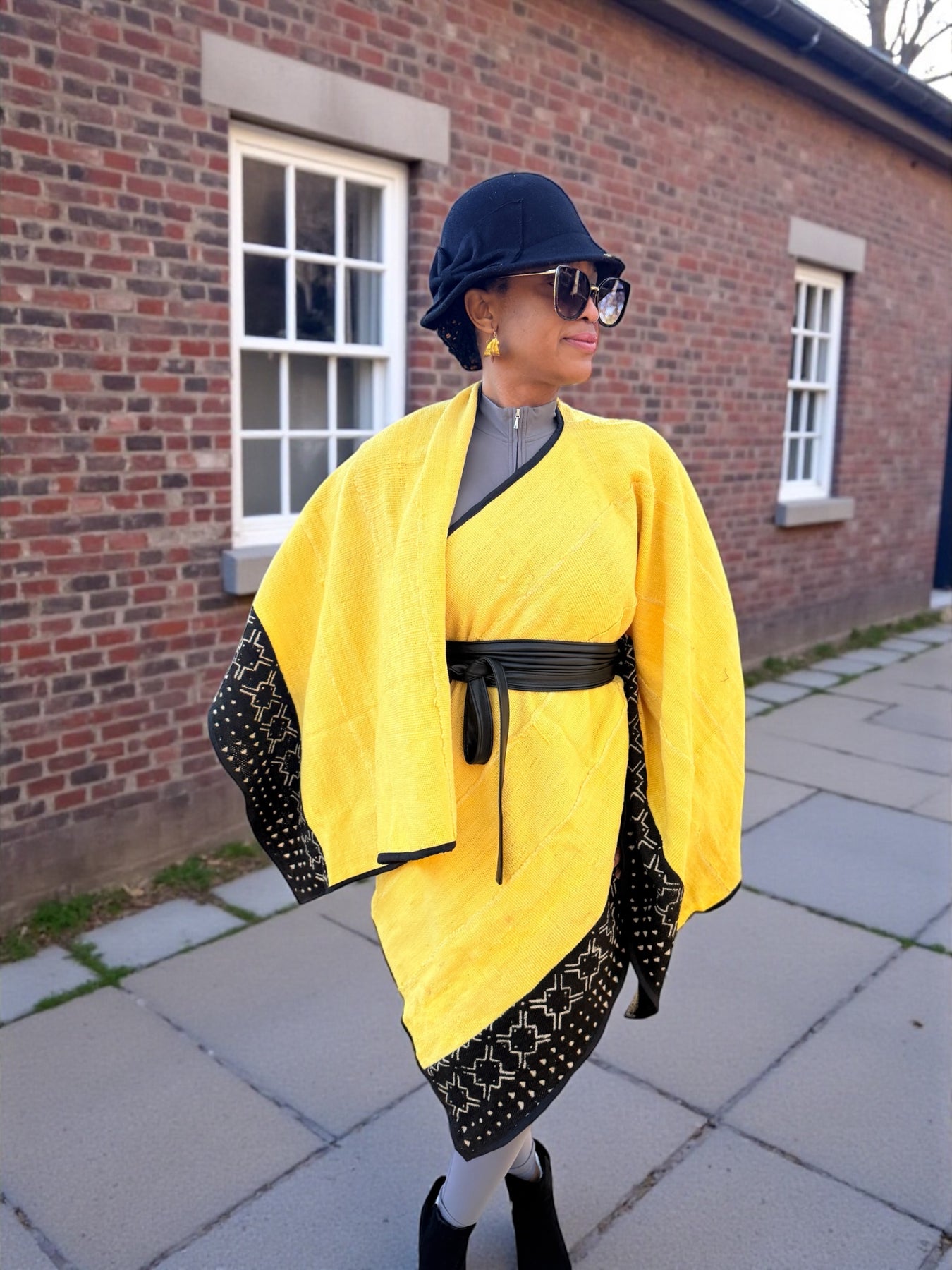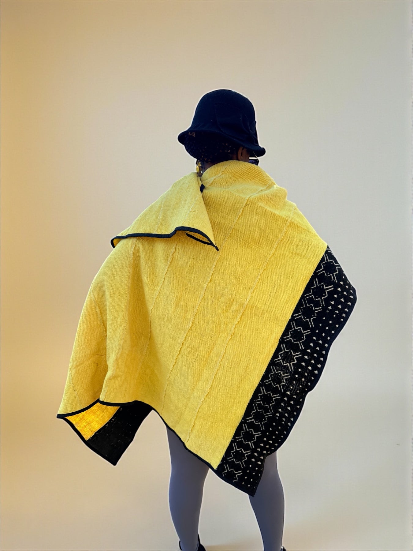 Bright, bold, and deeply rooted in tradition—this yellow mudcloth shawl is a statement piece that elevates any outfit. Handwoven by Malian artisans and finished with a striking black bogolan border, it blends cultural artistry with modern style.