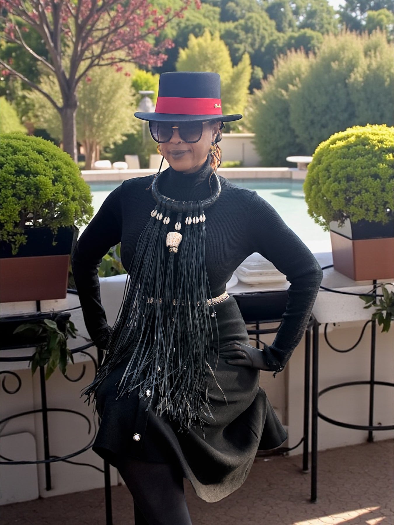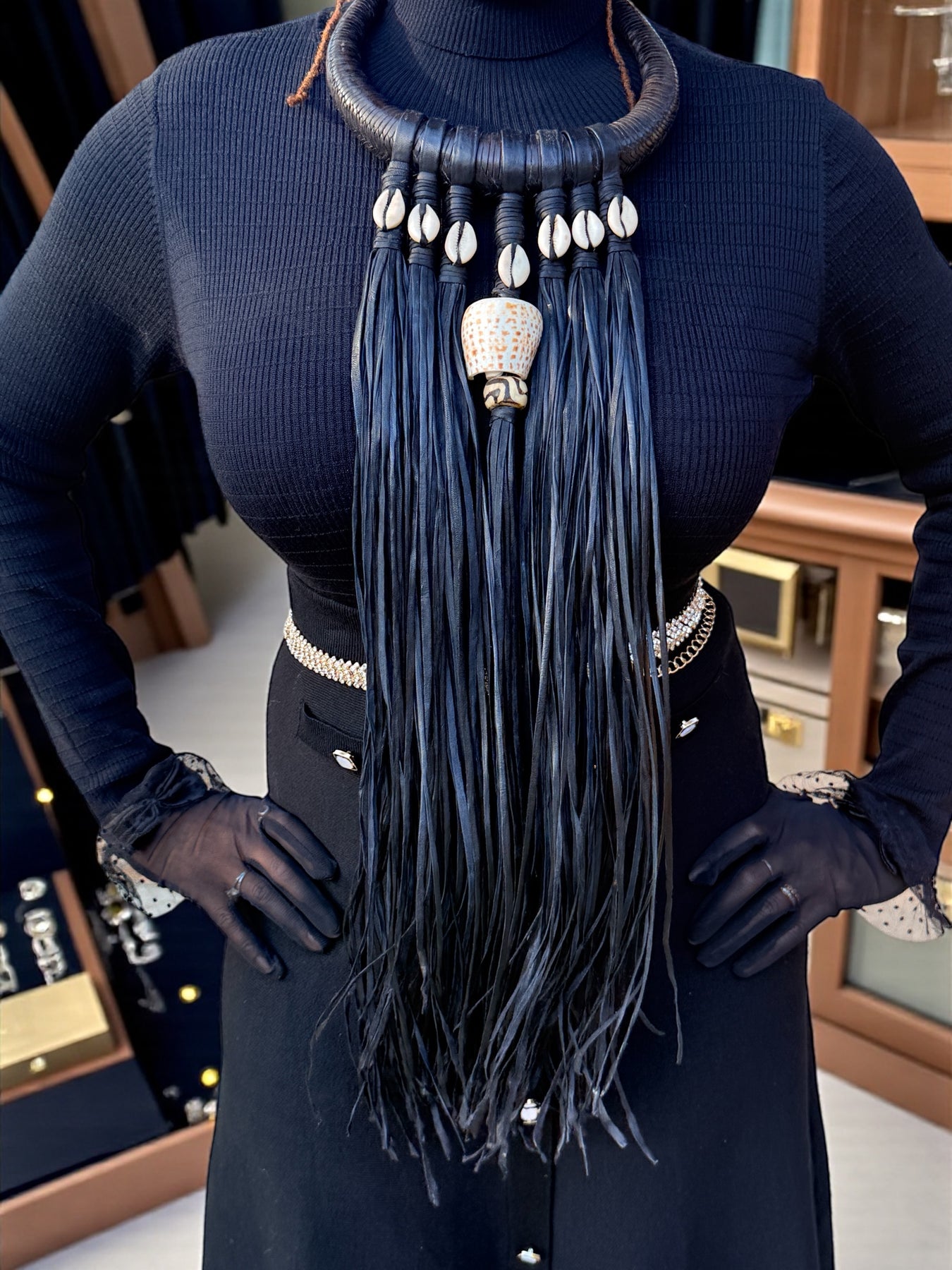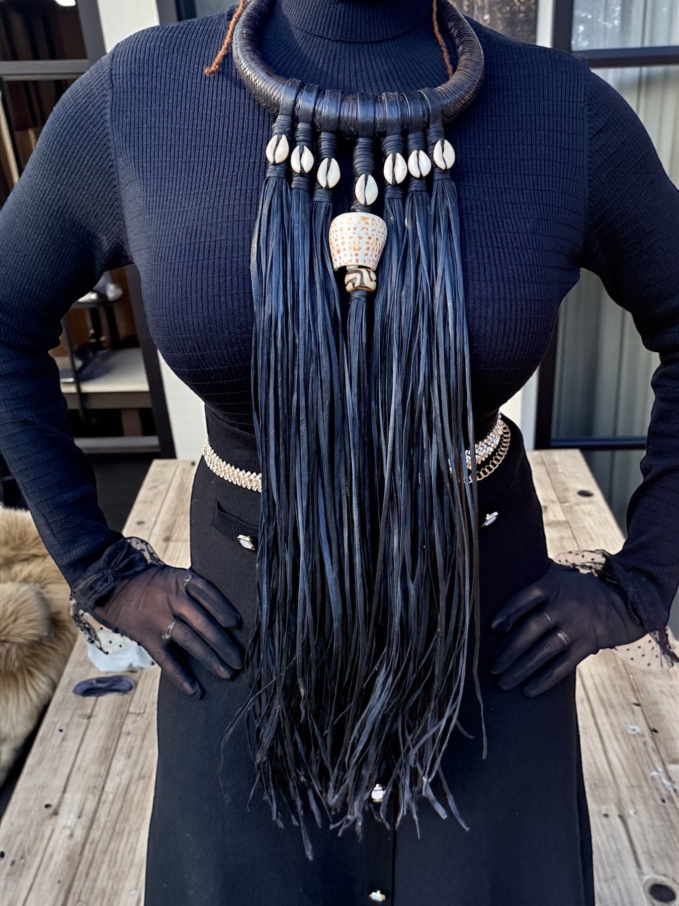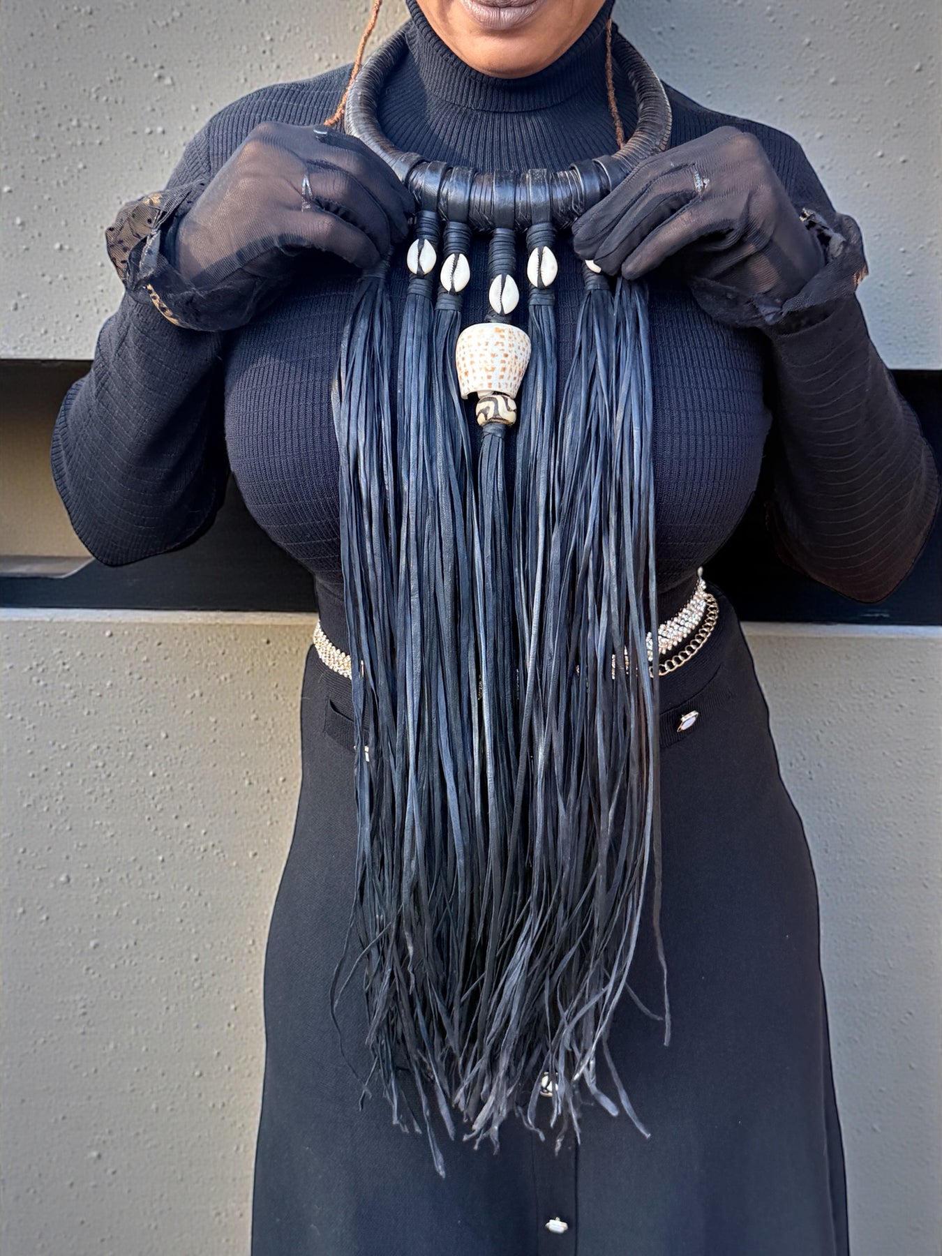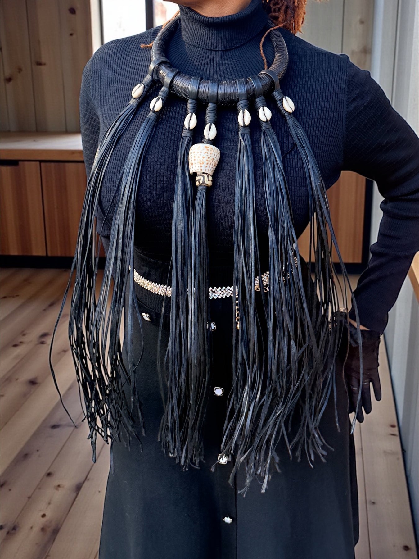 Crafted with layered black leather fringe, this piece moves fluidly while maintaining a bold, structured silhouette. Cowrie shell accents—long regarded across African cultures as symbols of protection, prosperity, and spiritual authority—anchor the design, while the central focal bead serves as a visual and energetic centerpiece.
