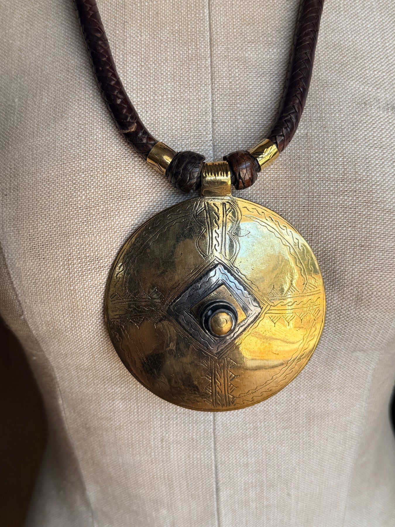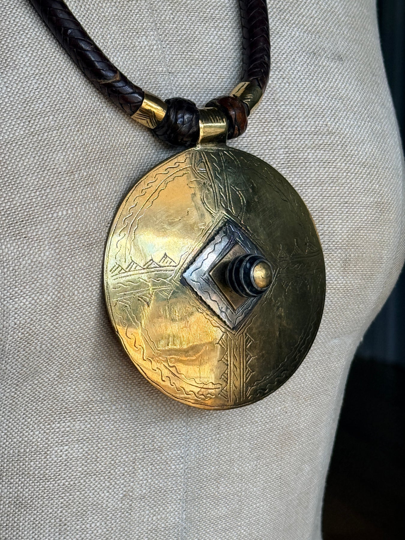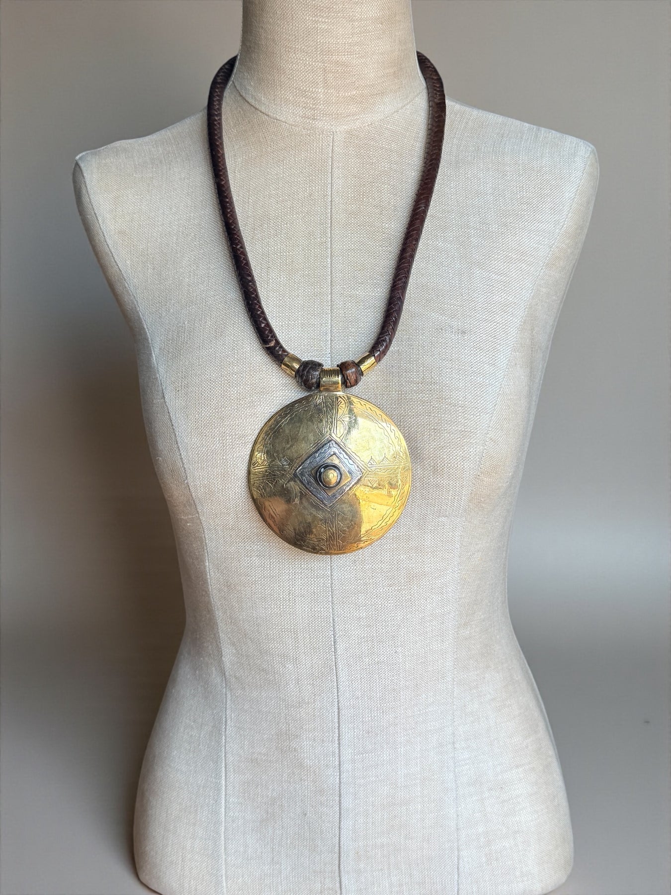 Ancestral Compass Medallion Necklace – Hand-Engraved Brass & Leather Statement