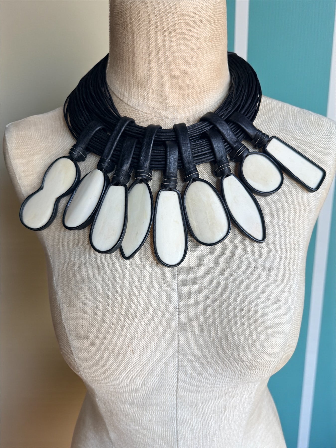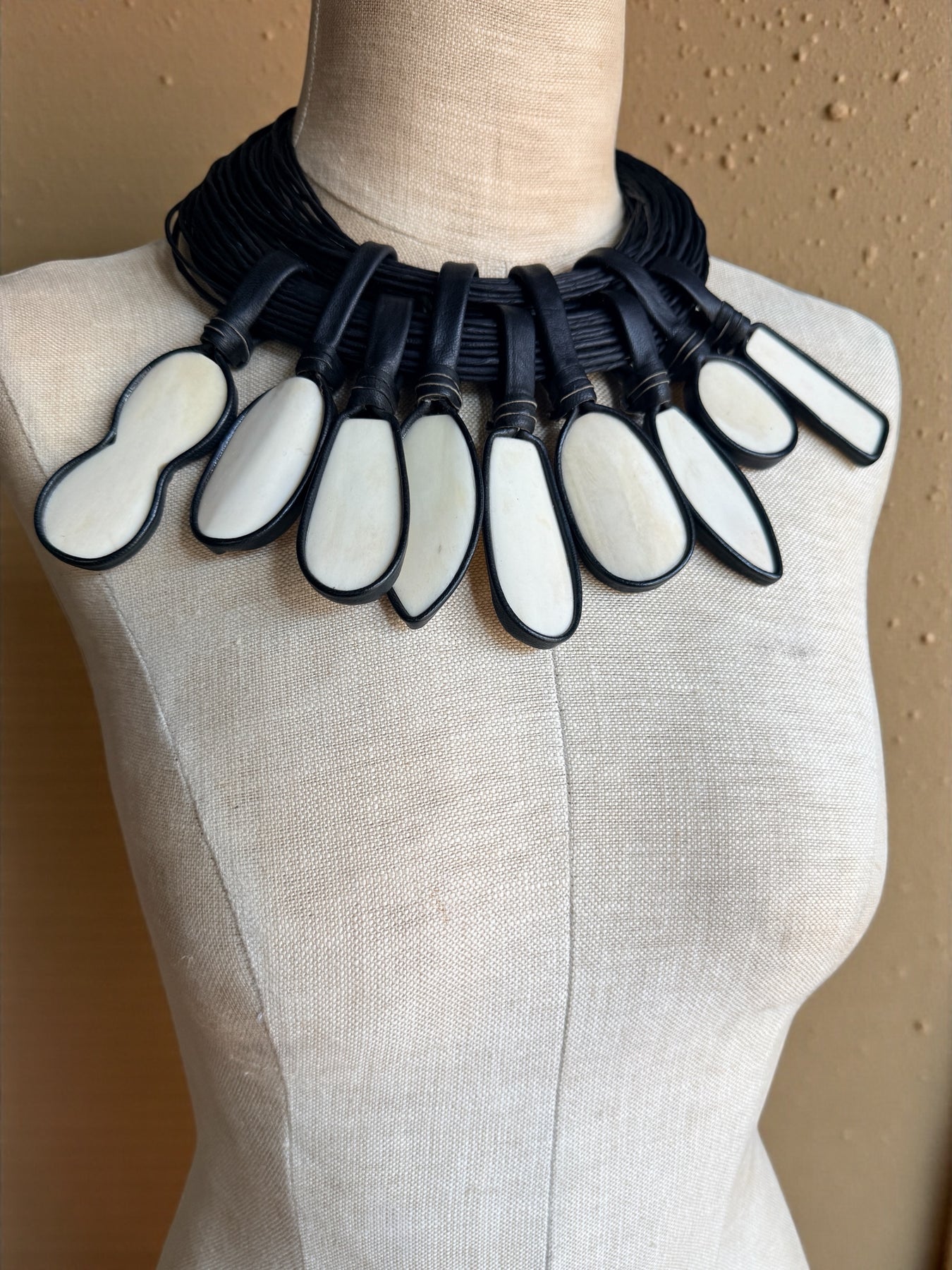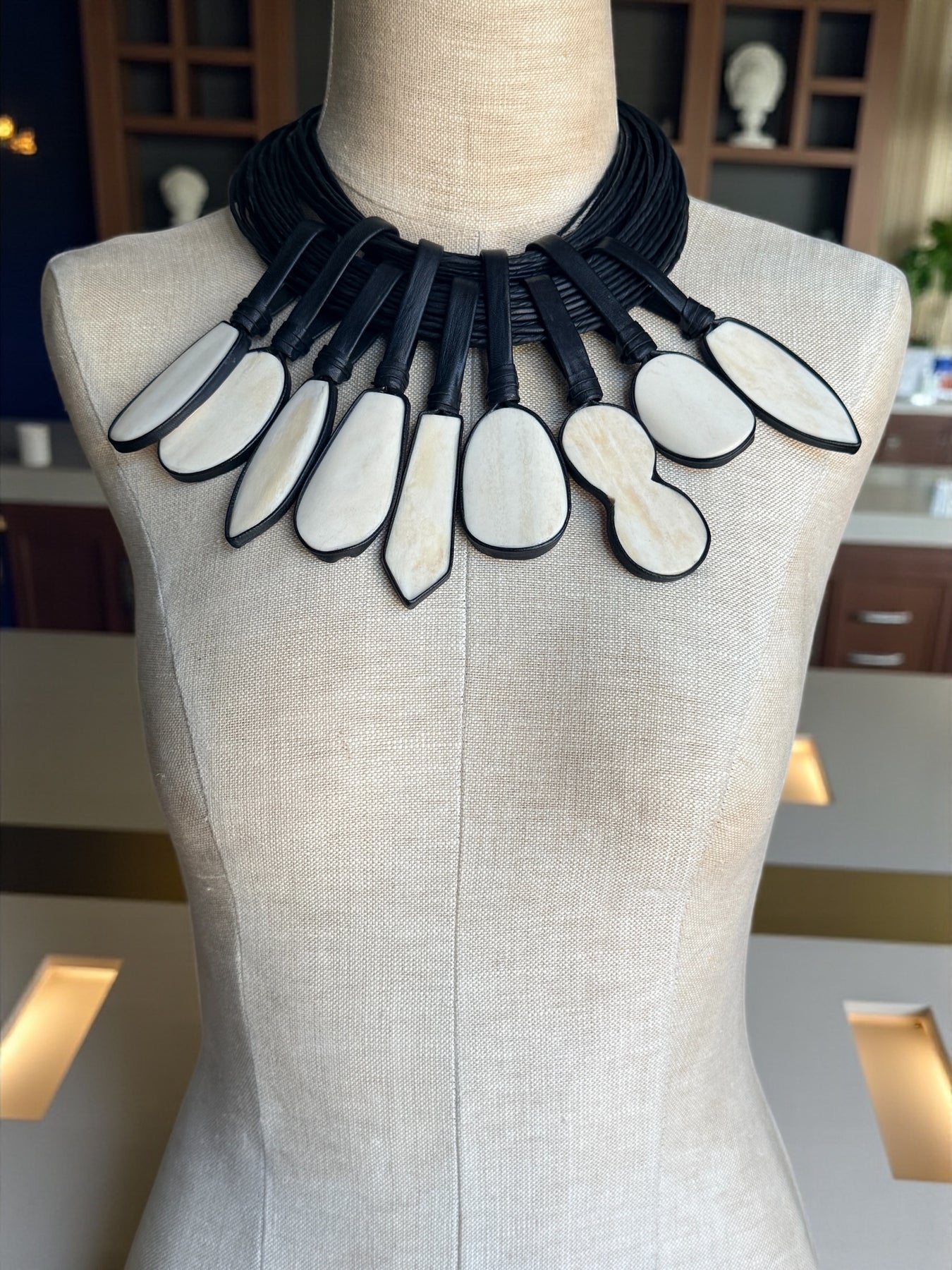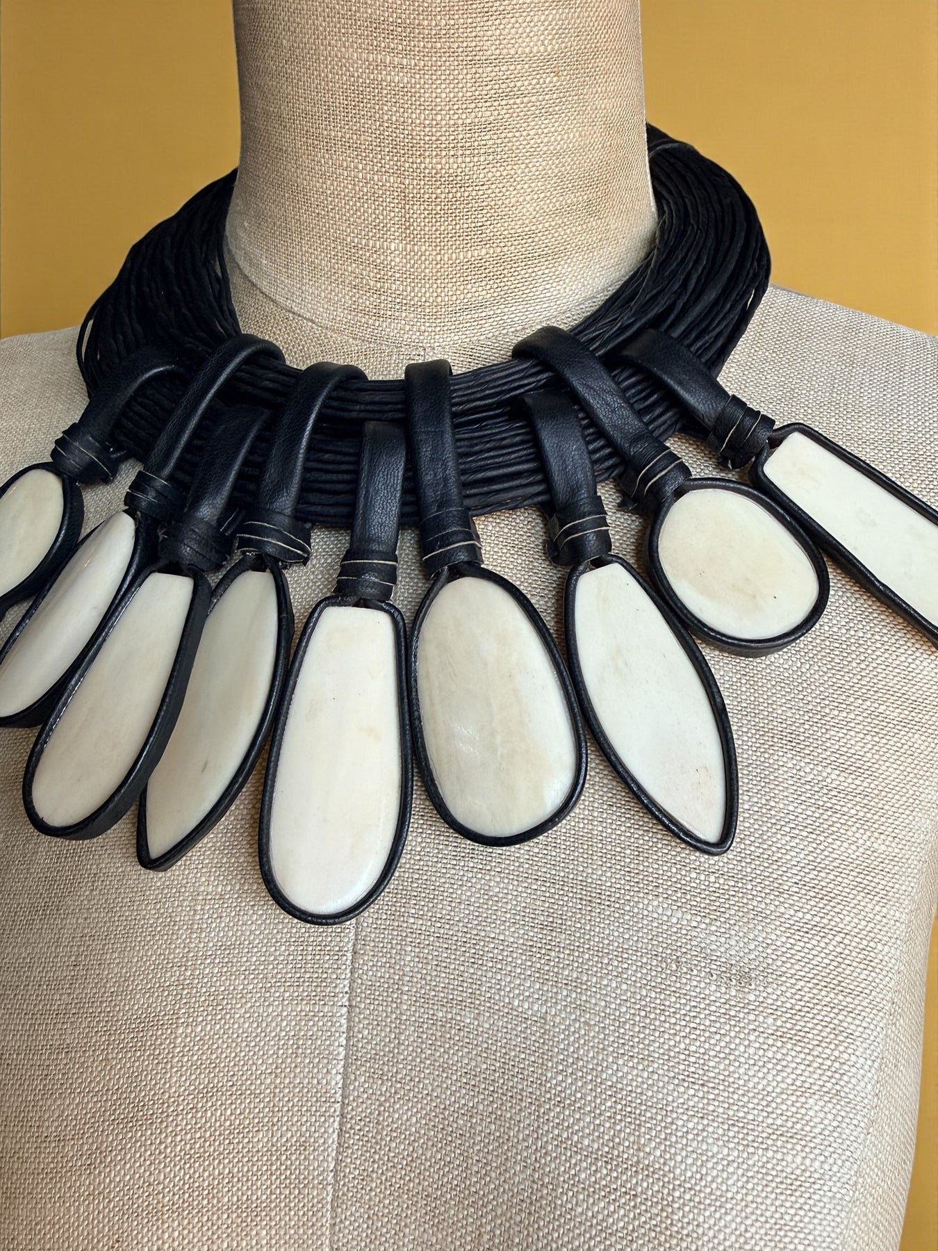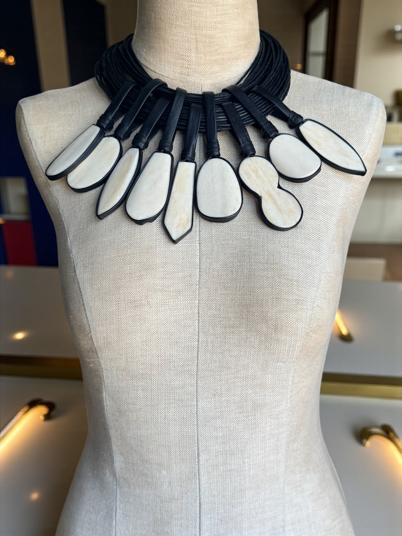 Handcrafted by skilled artisans in Mali, West Africa, the Ayo Statement Collar Necklace is a sculptural, wearable art piece. Built on a layered black leather base, it features ethically sourced bone elements individually framed and hand-set to create rhythm, balance, and movement across the neckline.