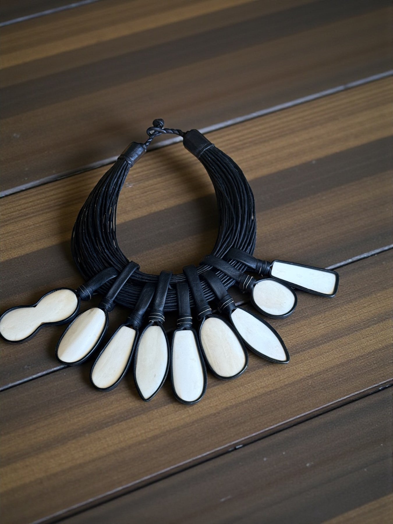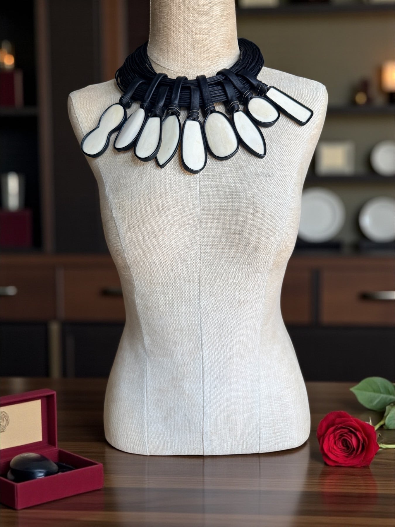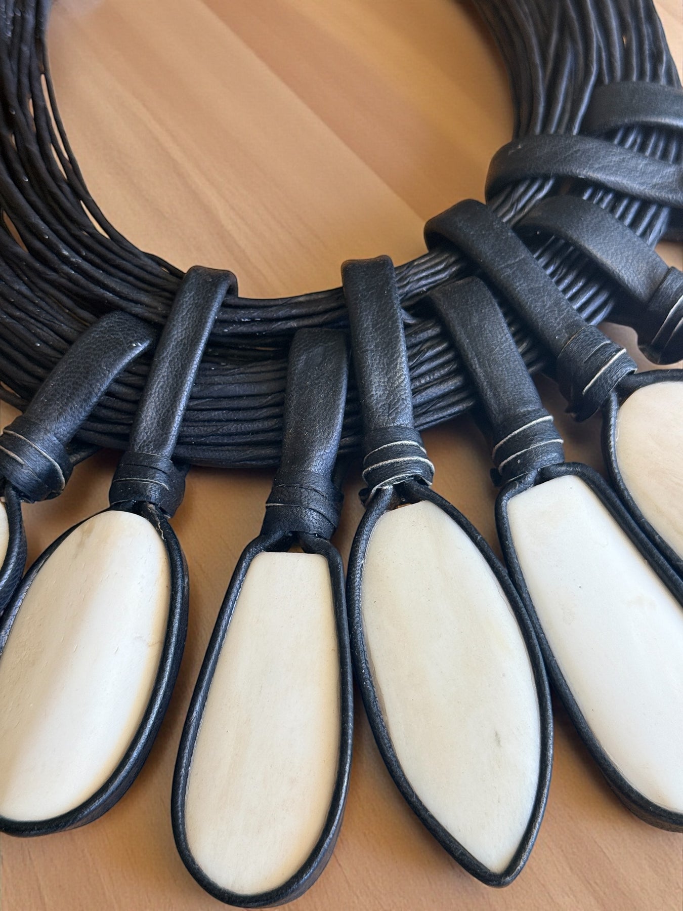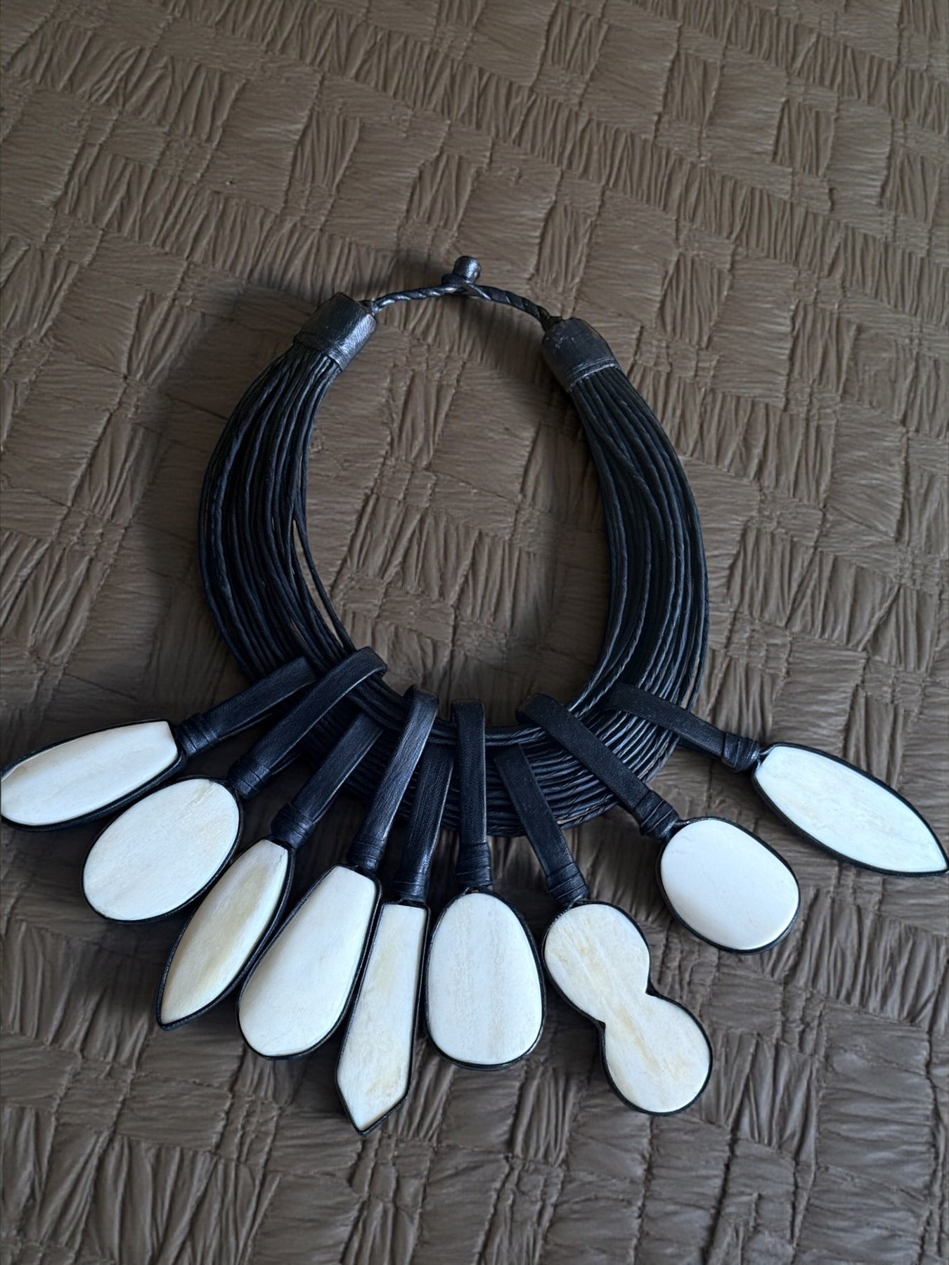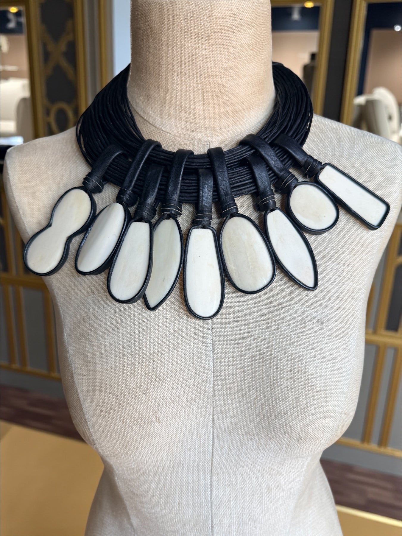 Handcrafted by skilled artisans in Mali, West Africa, the Ayo Statement Collar Necklace is a sculptural, wearable art piece. Built on a layered black leather base, it features ethically sourced bone elements individually framed and hand-set to create rhythm, balance, and movement across the neckline.