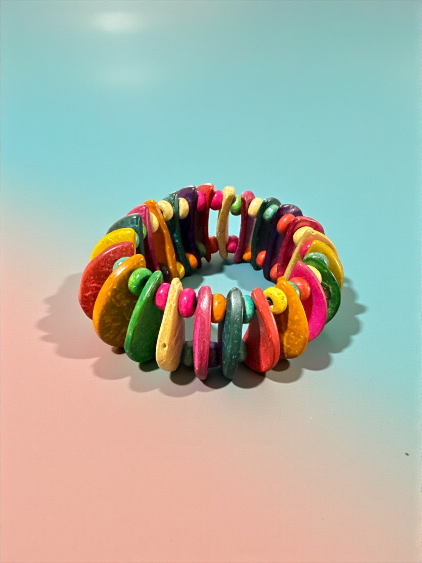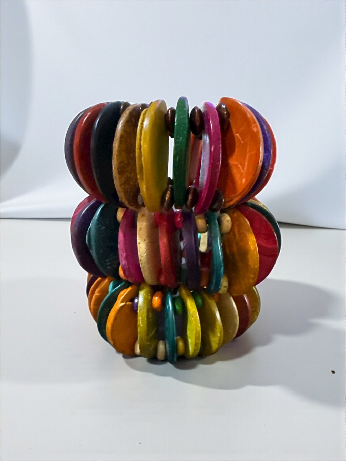 This bracelet is made of individual coconut shell pieces in rich multicolor tones, strung on stretch cord for a comfortable and flexible fit. Every bangle is one-of-a-kind with its own natural texture, grain, and color variations.