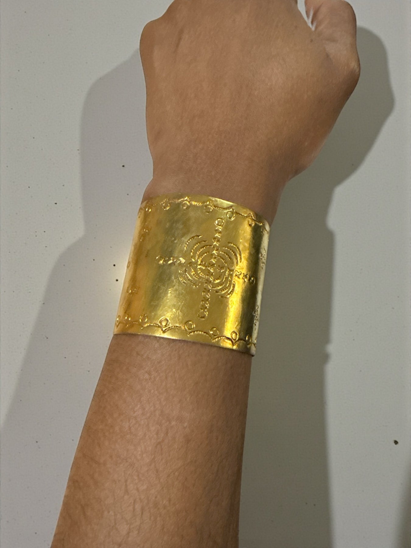 Striking, bold, and full of culture — this brass cuff is a wearable piece of art. Handmade with intricate embossing, it brings elegance and strength to any outfit. The metal has a soft golden tone and a slightly rustic finish that gives it character and authenticity.