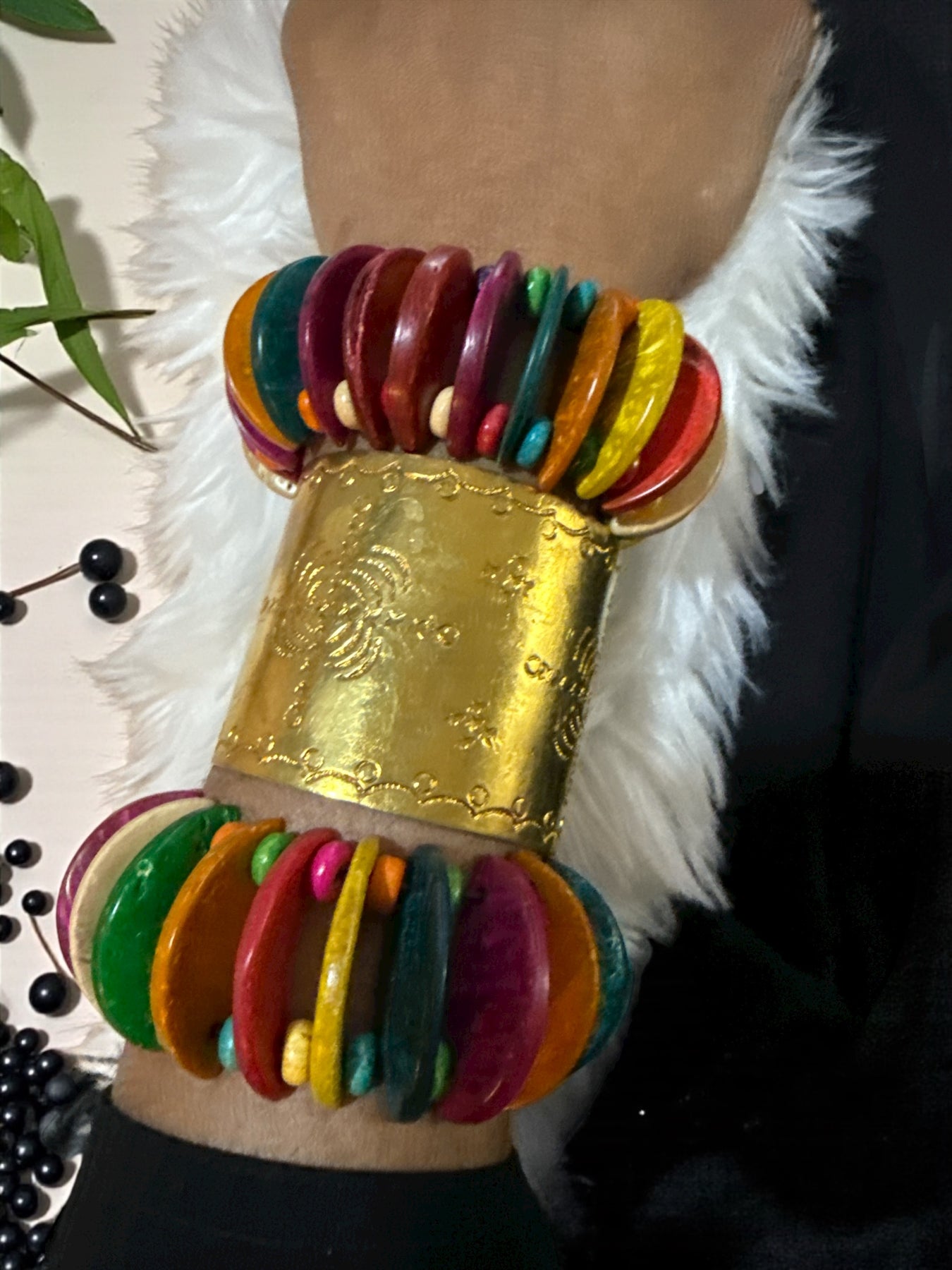 This cuff is crafted from brass and decorated with embossed details that catch the light beautifully. It can be worn alone as a statement piece, or layered with beaded or coconut shell bangles for a dramatic stacked look.