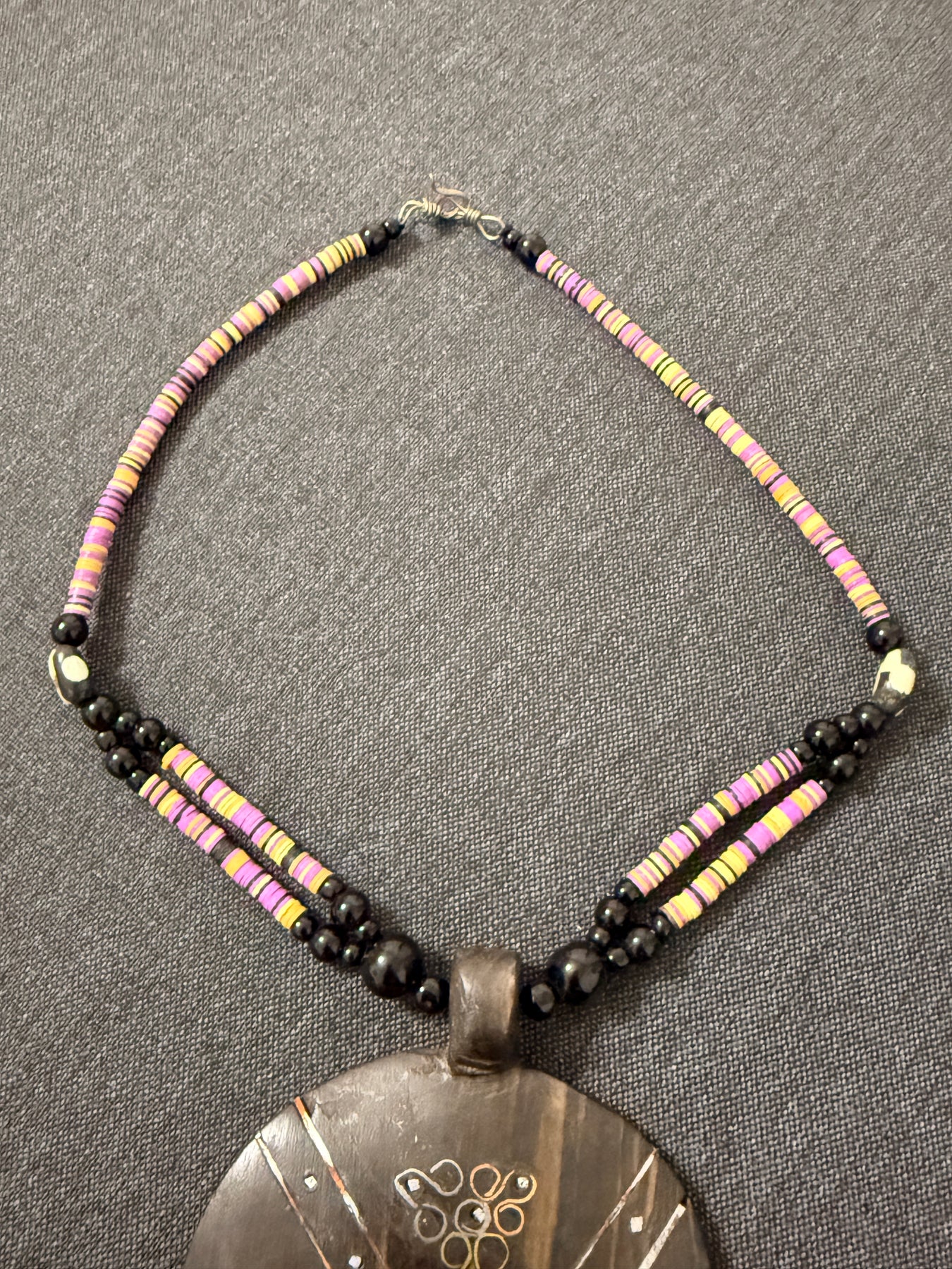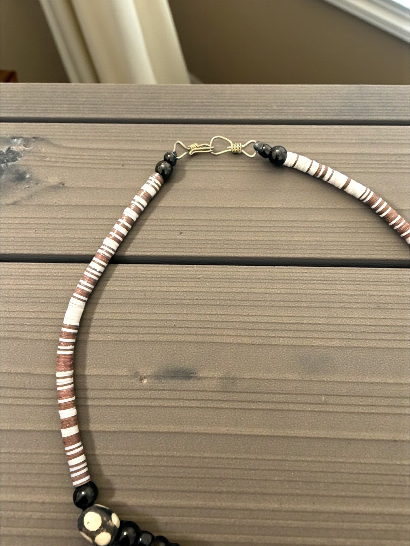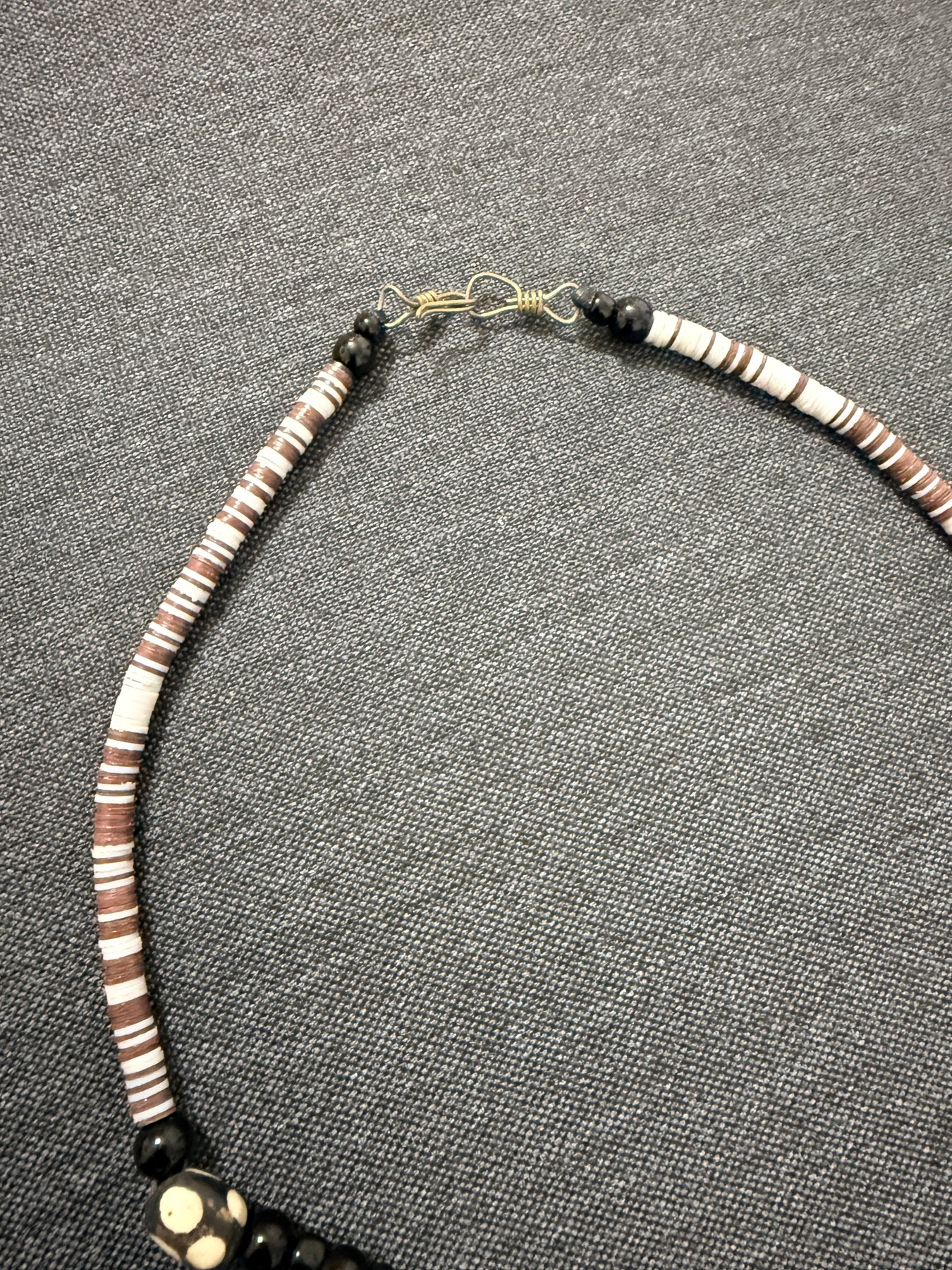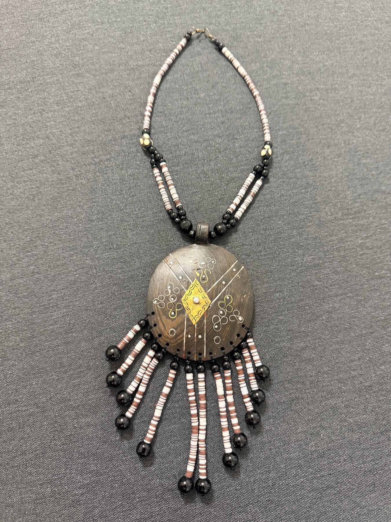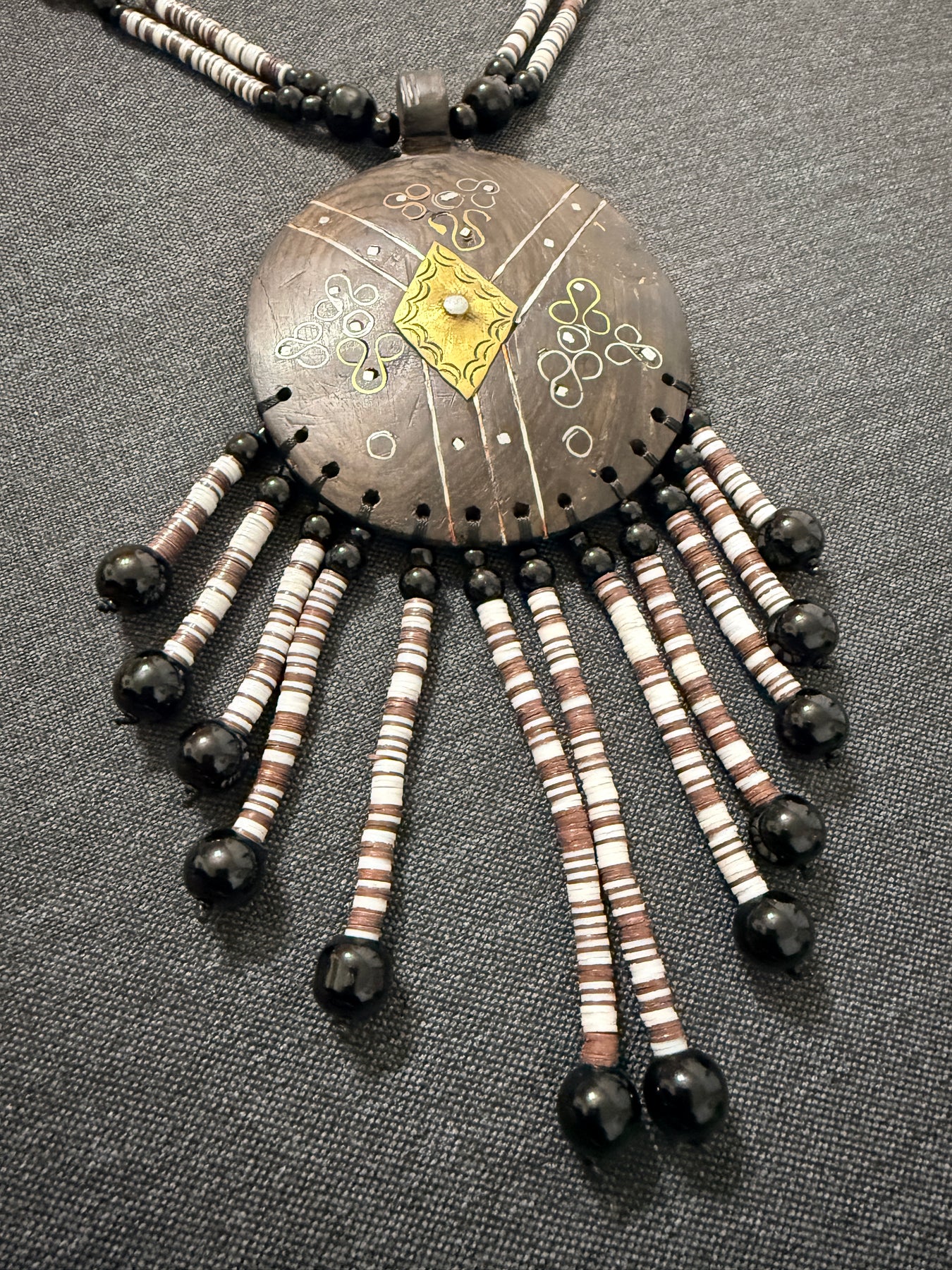 - Materials: Ebony wood, small heishi beads, brass accents
