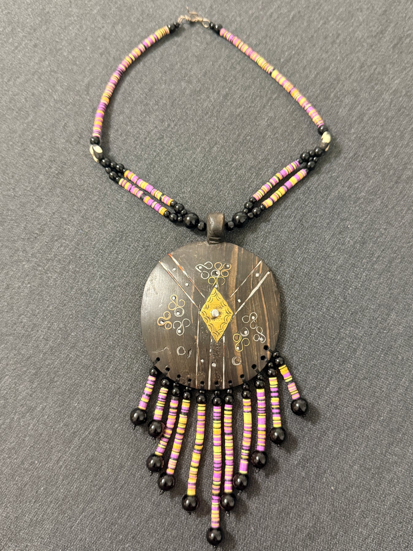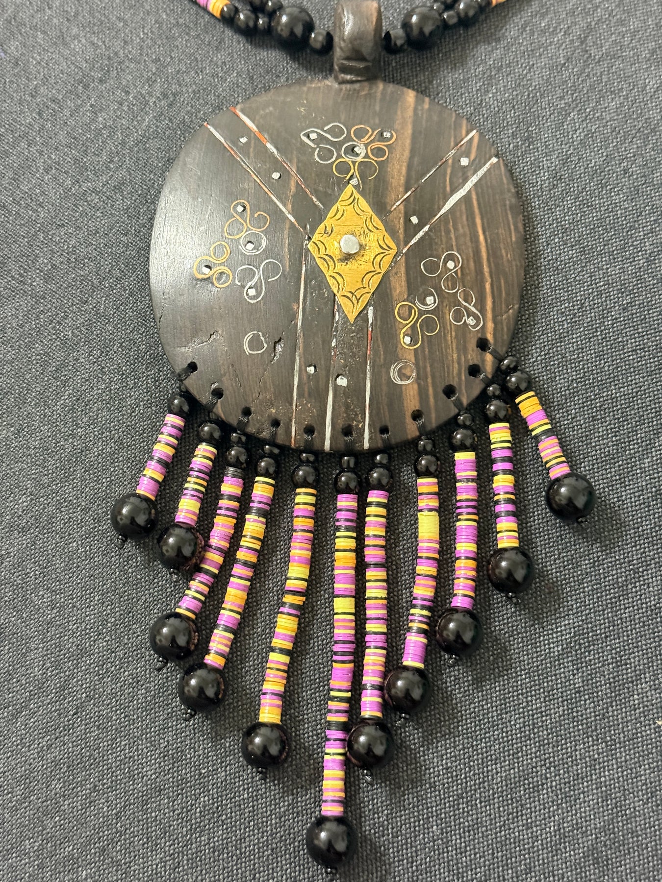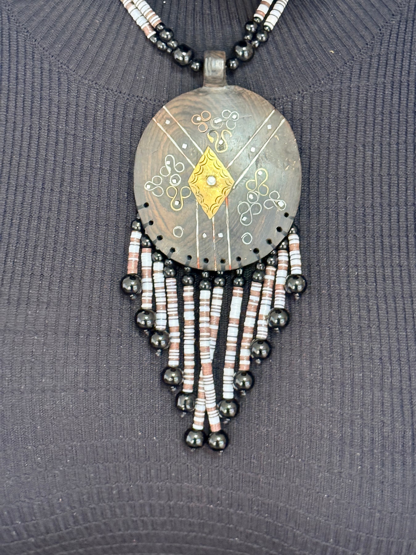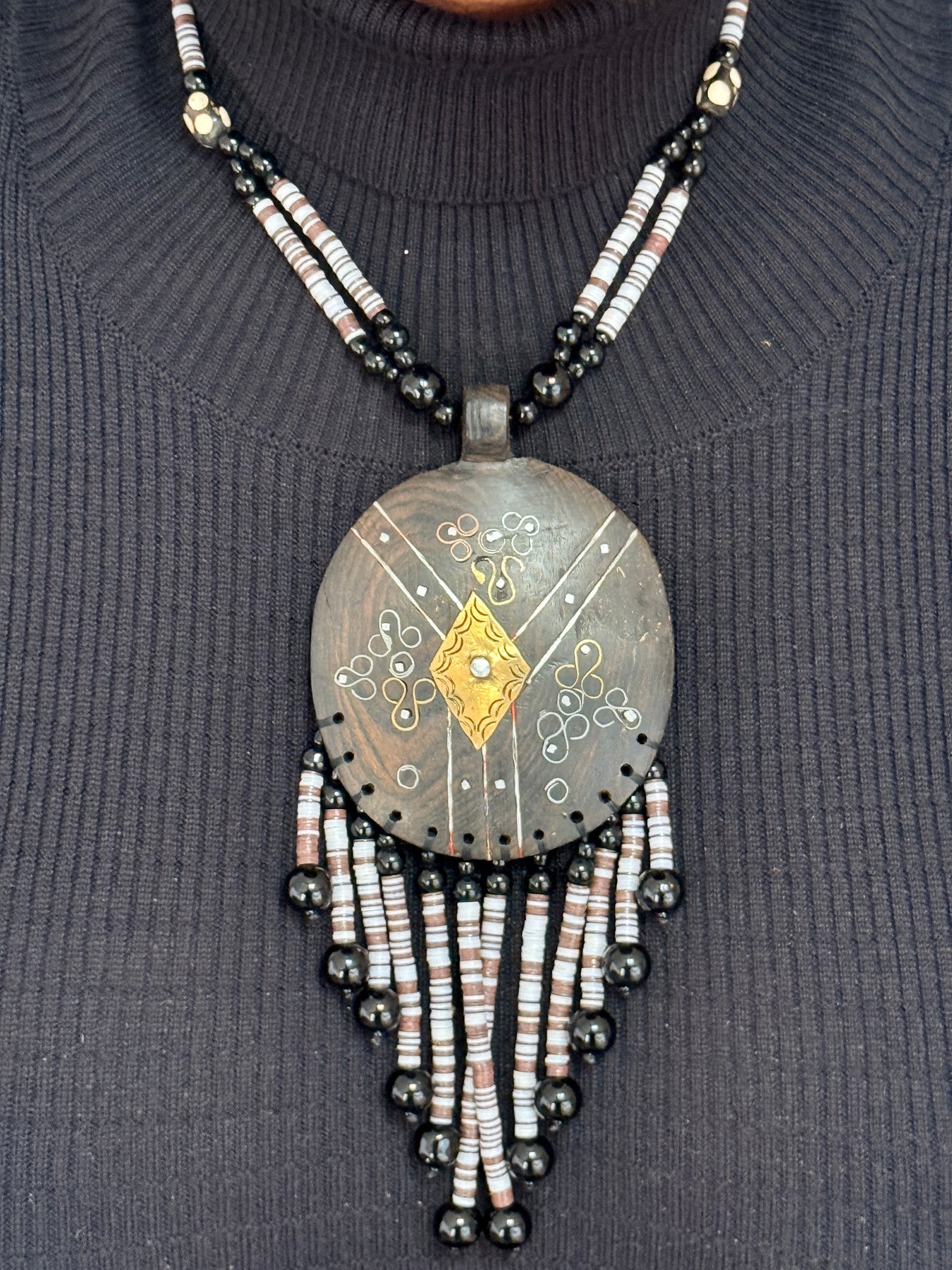 Make a powerful statement with this one-of-a-kind handcrafted necklace designed to command attention. Featuring a bold ebony wood shield pendant, this piece is richly detailed with hand-etched brass accents and finished with cascading fringe made from small heishi beads. Every element is carefully assembled, resulting in a necklace that feels both ancestral and contemporary.