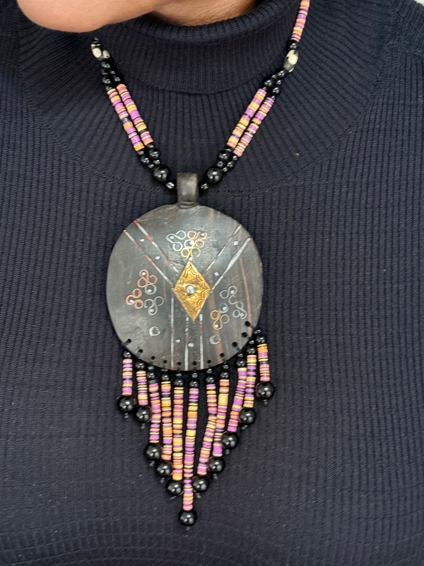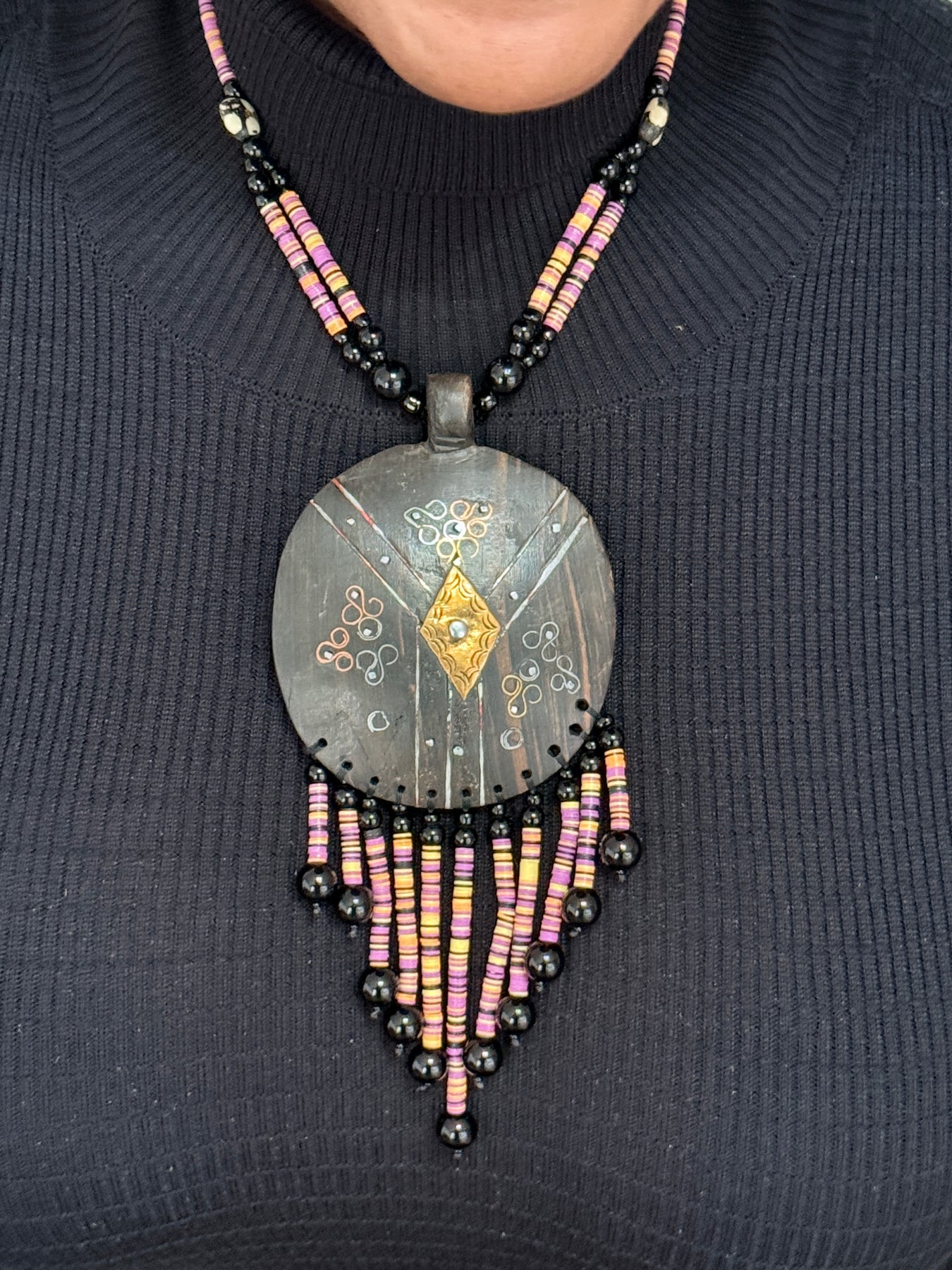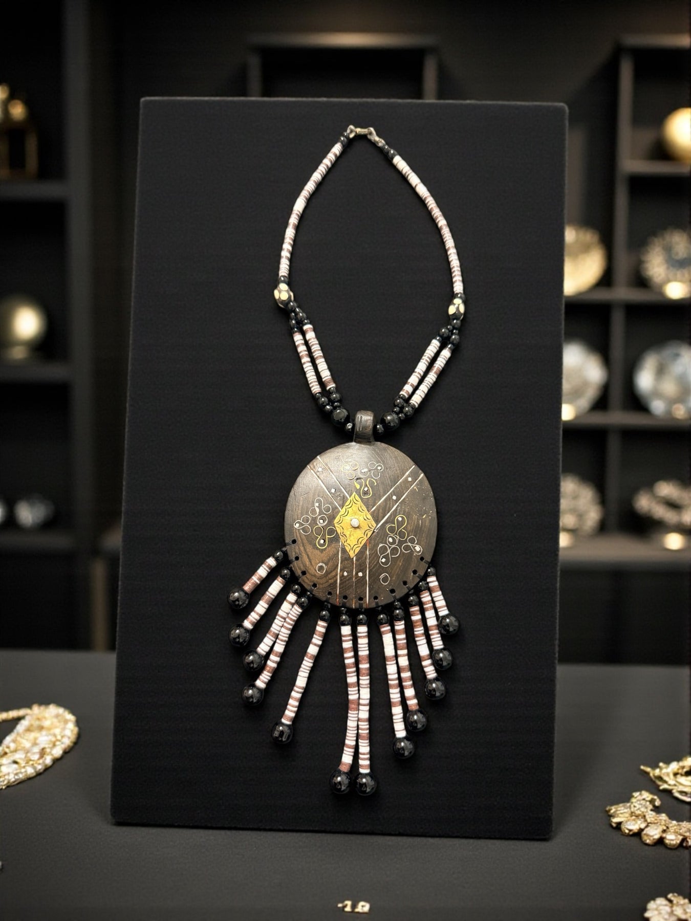 - Pendant Style: Large shield-shaped statement pendant with fringe