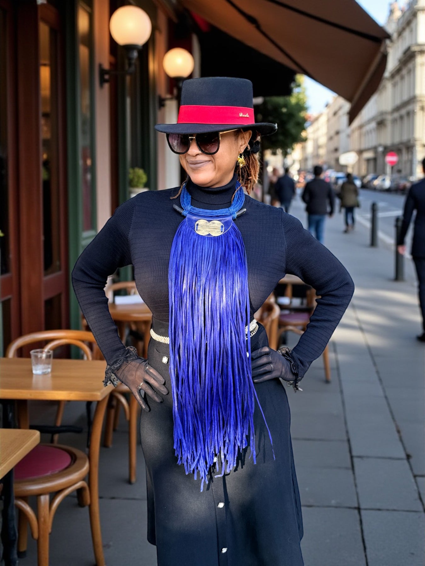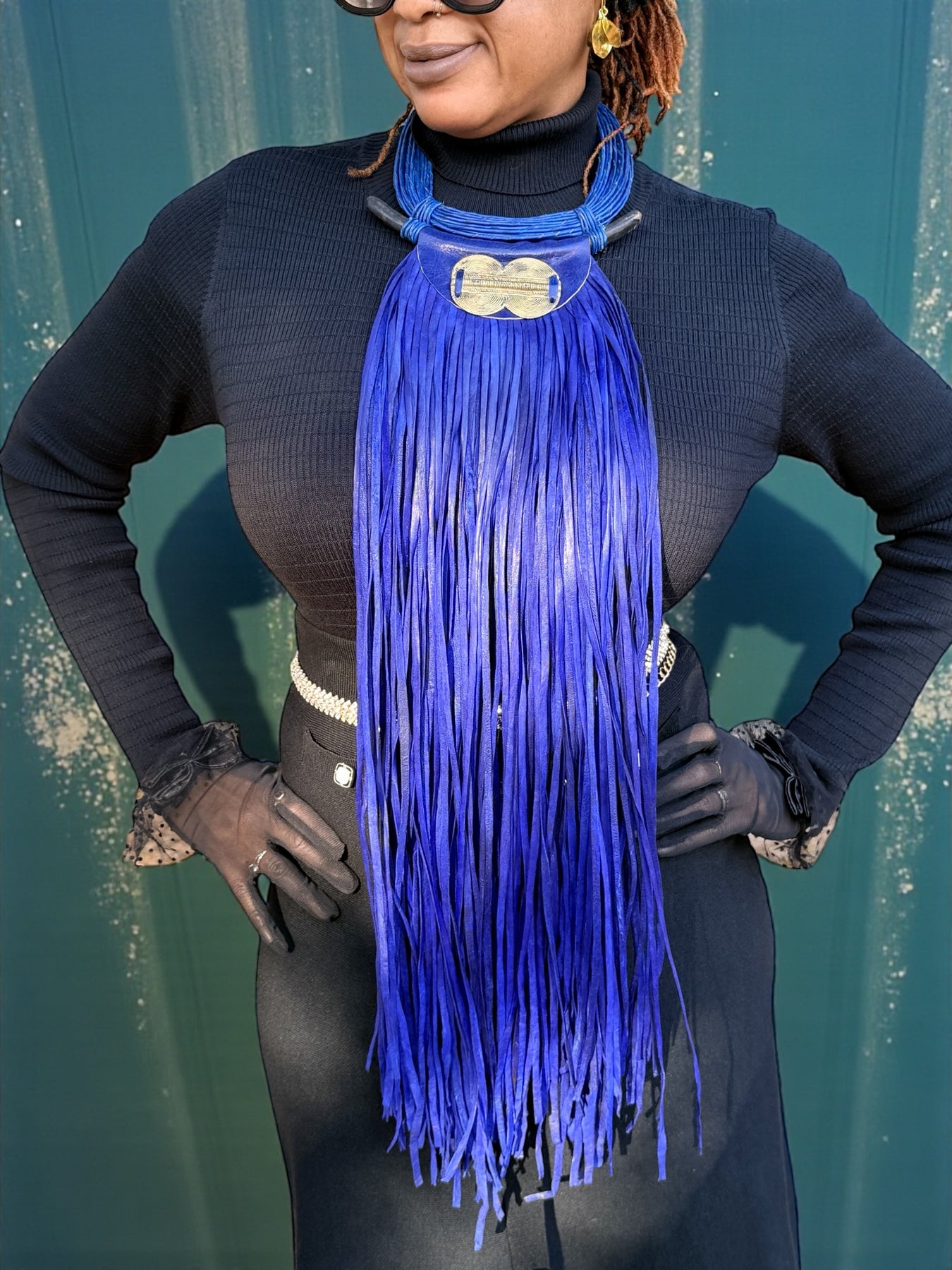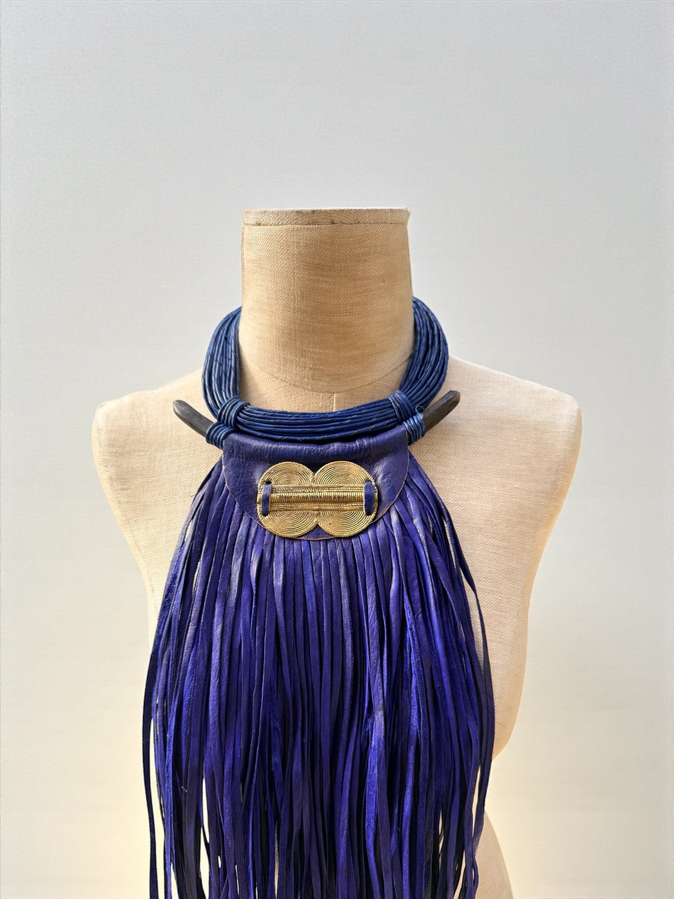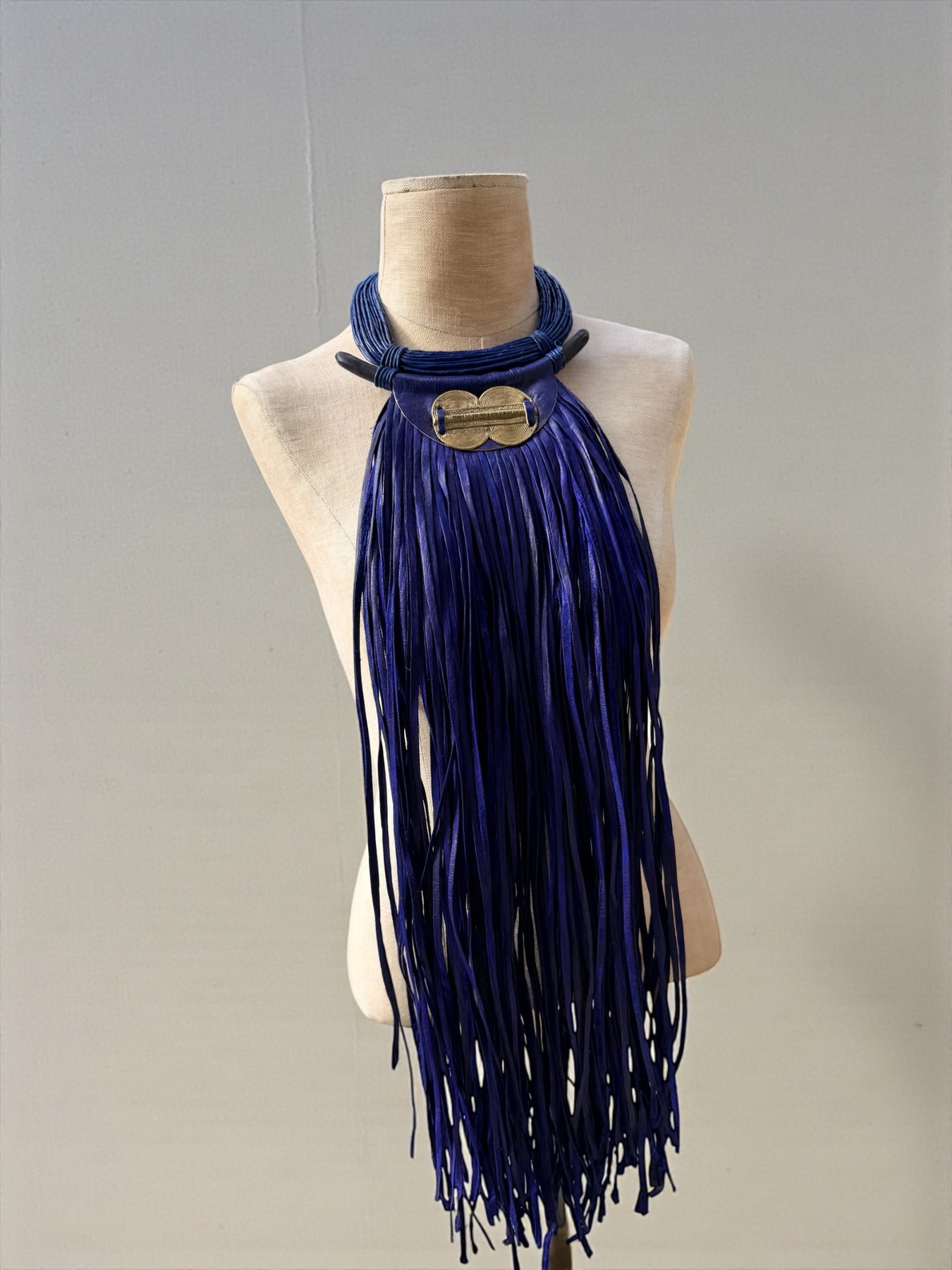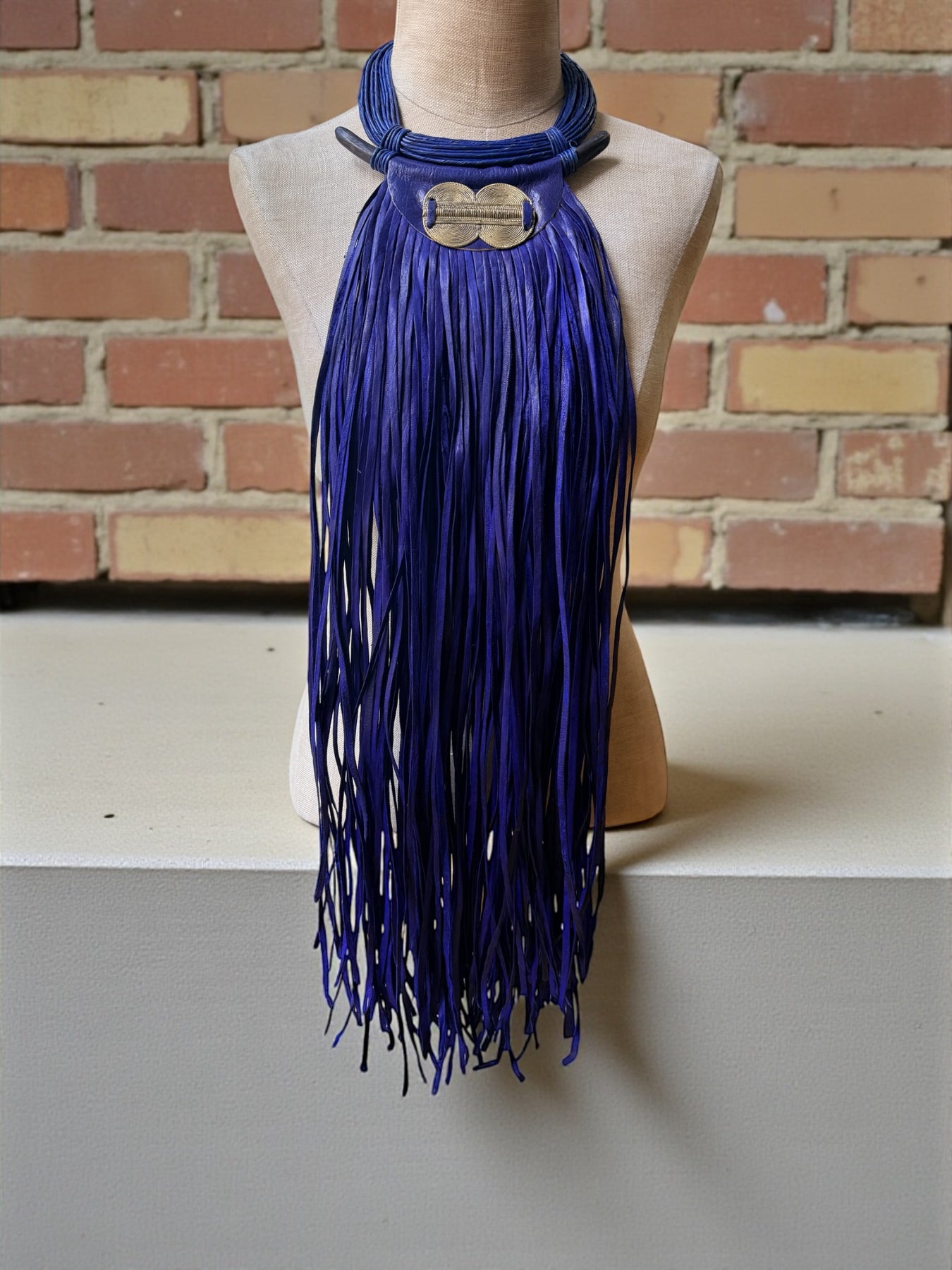 A bold expression of wearable art, this large statement necklace is handcrafted to command presence. Designed with rich indigo leather fringe, sculptural brass detailing, and smooth ebony wood accents, this piece blends strength, movement, and refined craftsmanship.