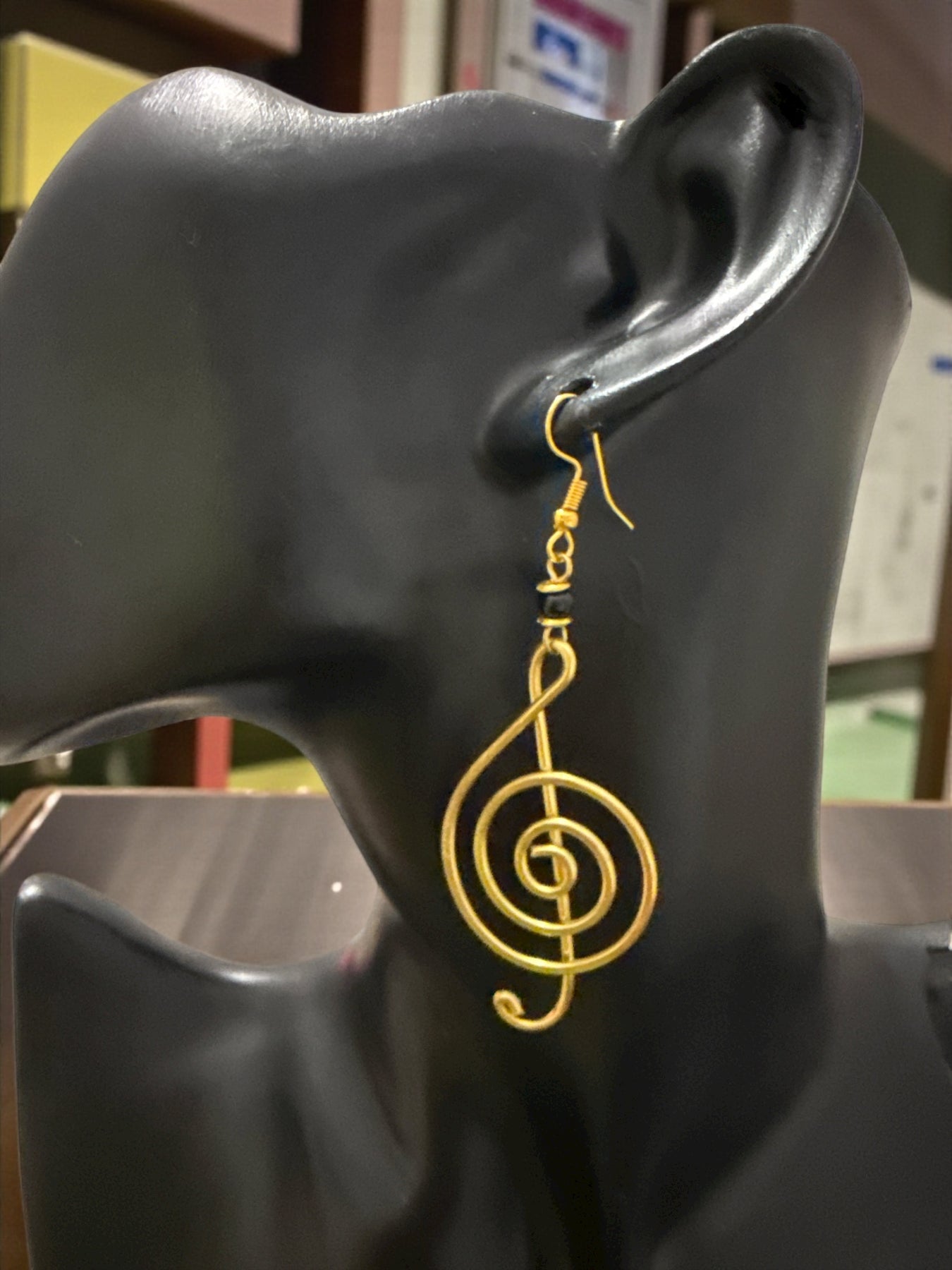 These handcrafted brass earrings bring rhythm, culture, and artistry together in a bold musical silhouette. Shaped into an elegant treble–inspired spiral, each pair showcases the skill of African wire artisans who hand-form every curve and loop. Lightweight yet striking, these earrings express creativity, movement, and individuality.