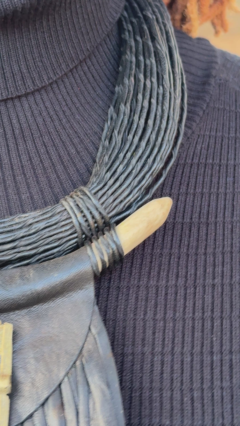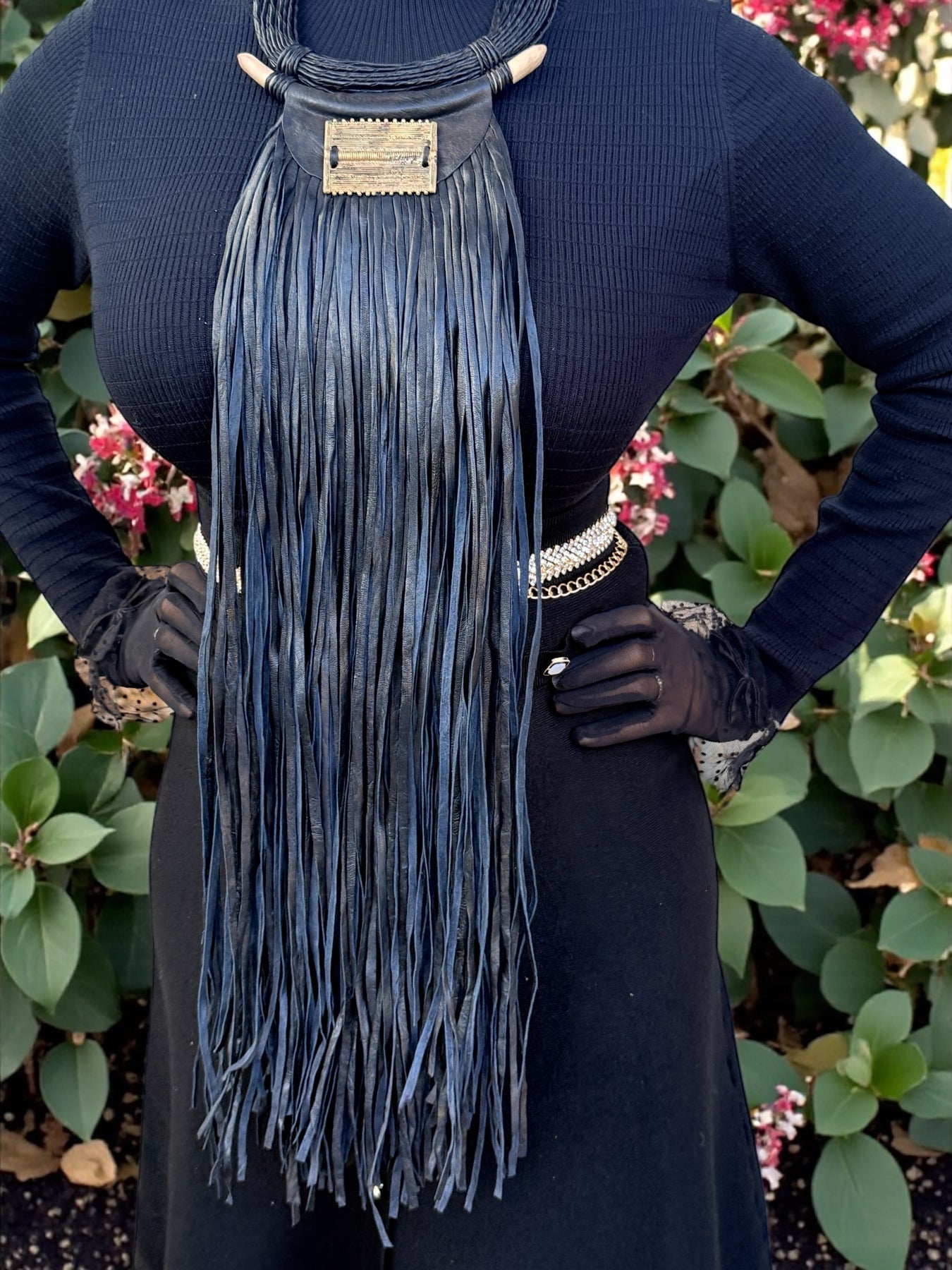 Sleek, commanding, and effortlessly powerful, this large statement necklace is a study in refined drama. Handcrafted with deep black leather fringe, sculptural brass detailing, and ebony wood accents, this piece delivers bold elegance with unmistakable presence.