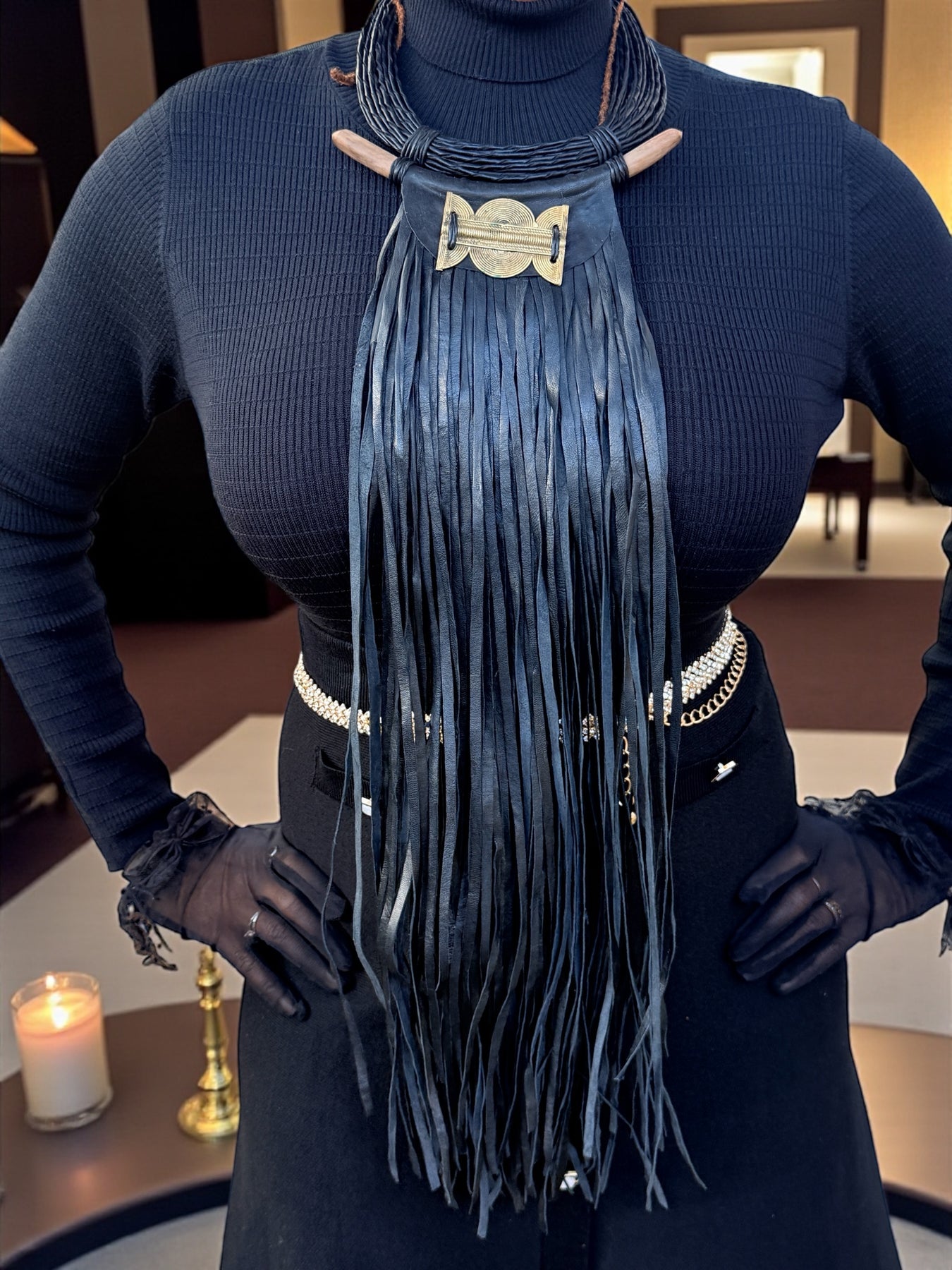 The structured layered leather collar frames the neckline comfortably, while the long flowing fringe creates movement, texture, and visual impact. A handcrafted brass centerpiece anchors the design, adding contrast and warmth against the rich black leather.