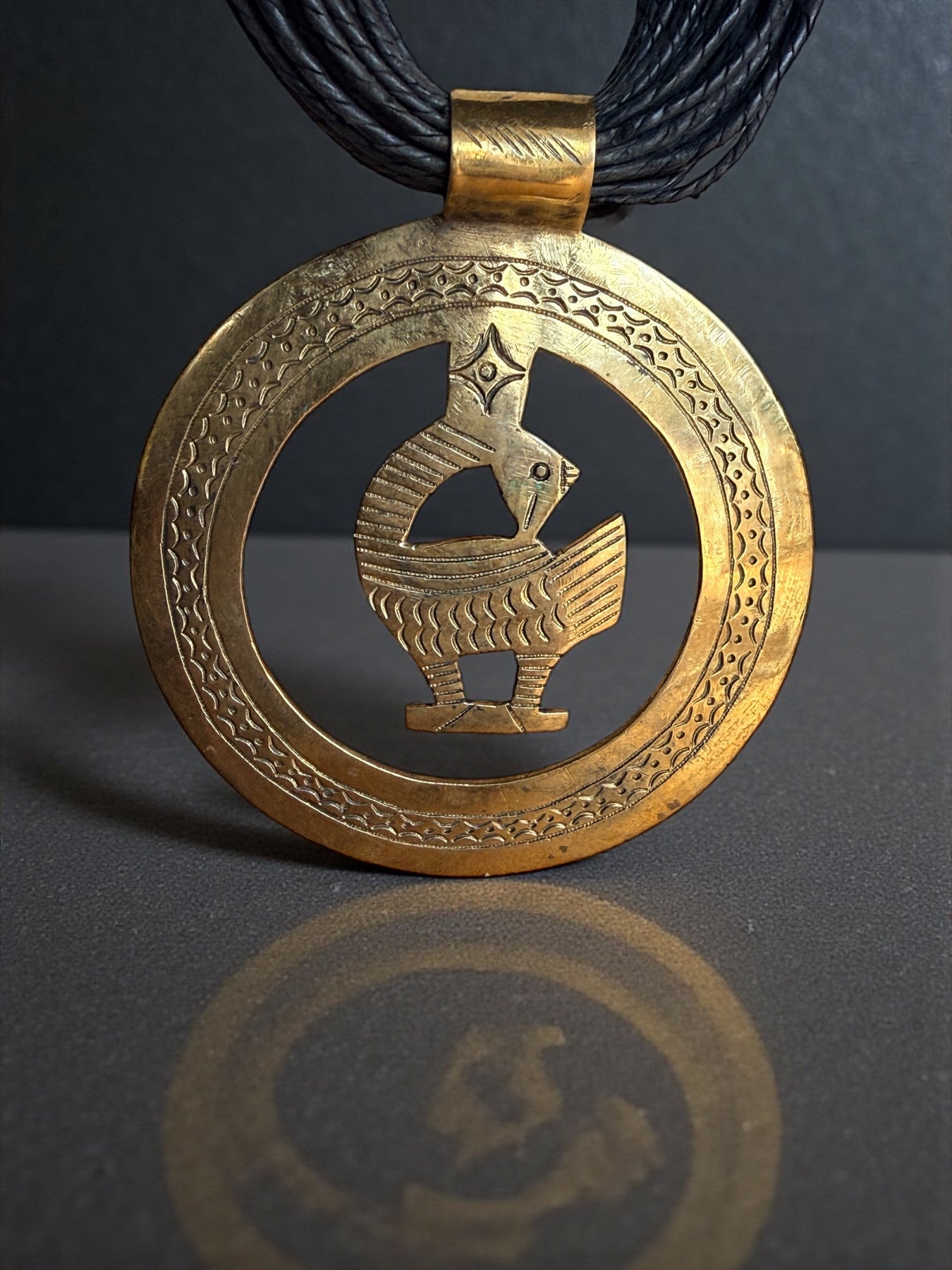 • Sankofa bird brass medallion with hand-etched detailing