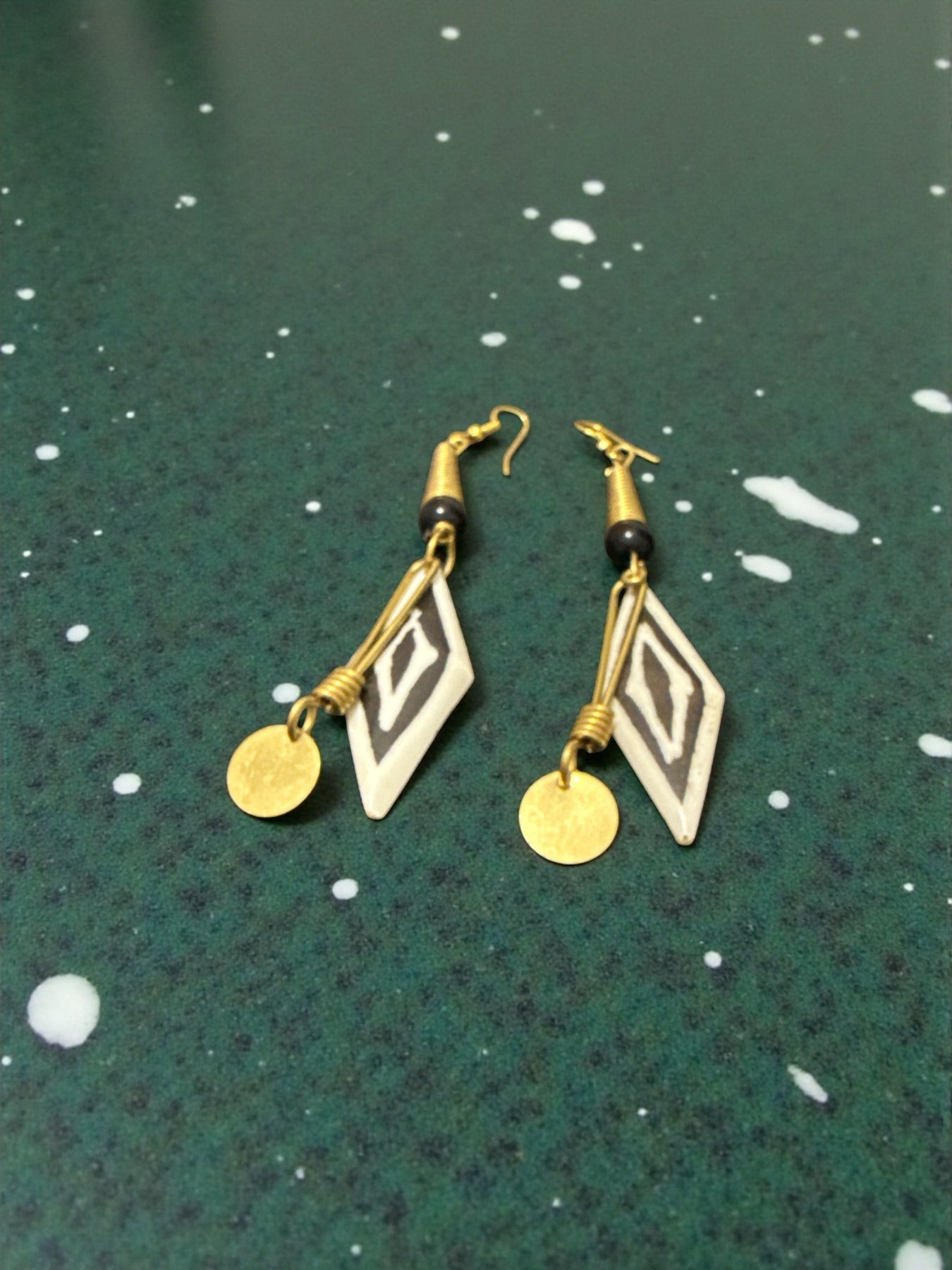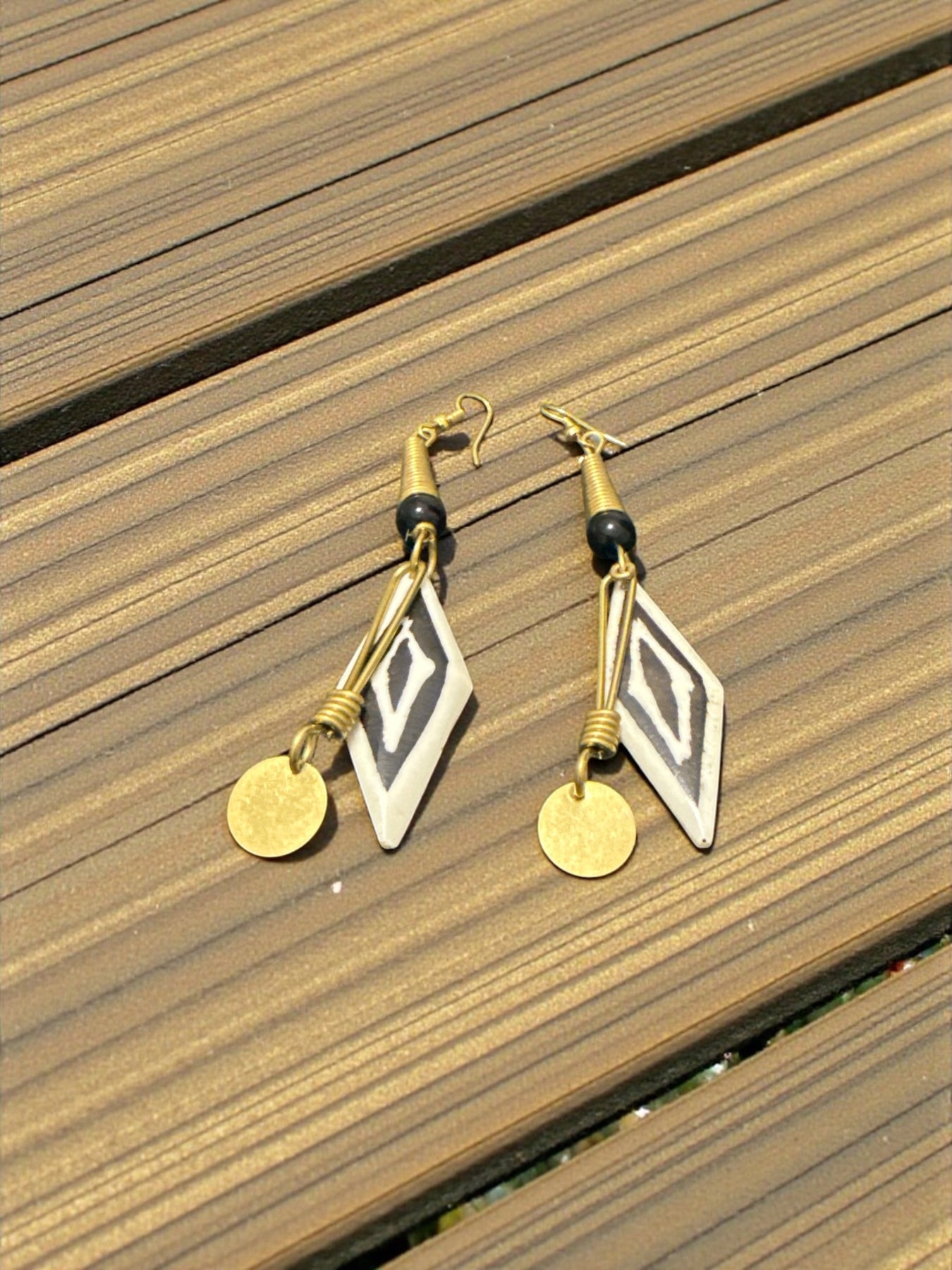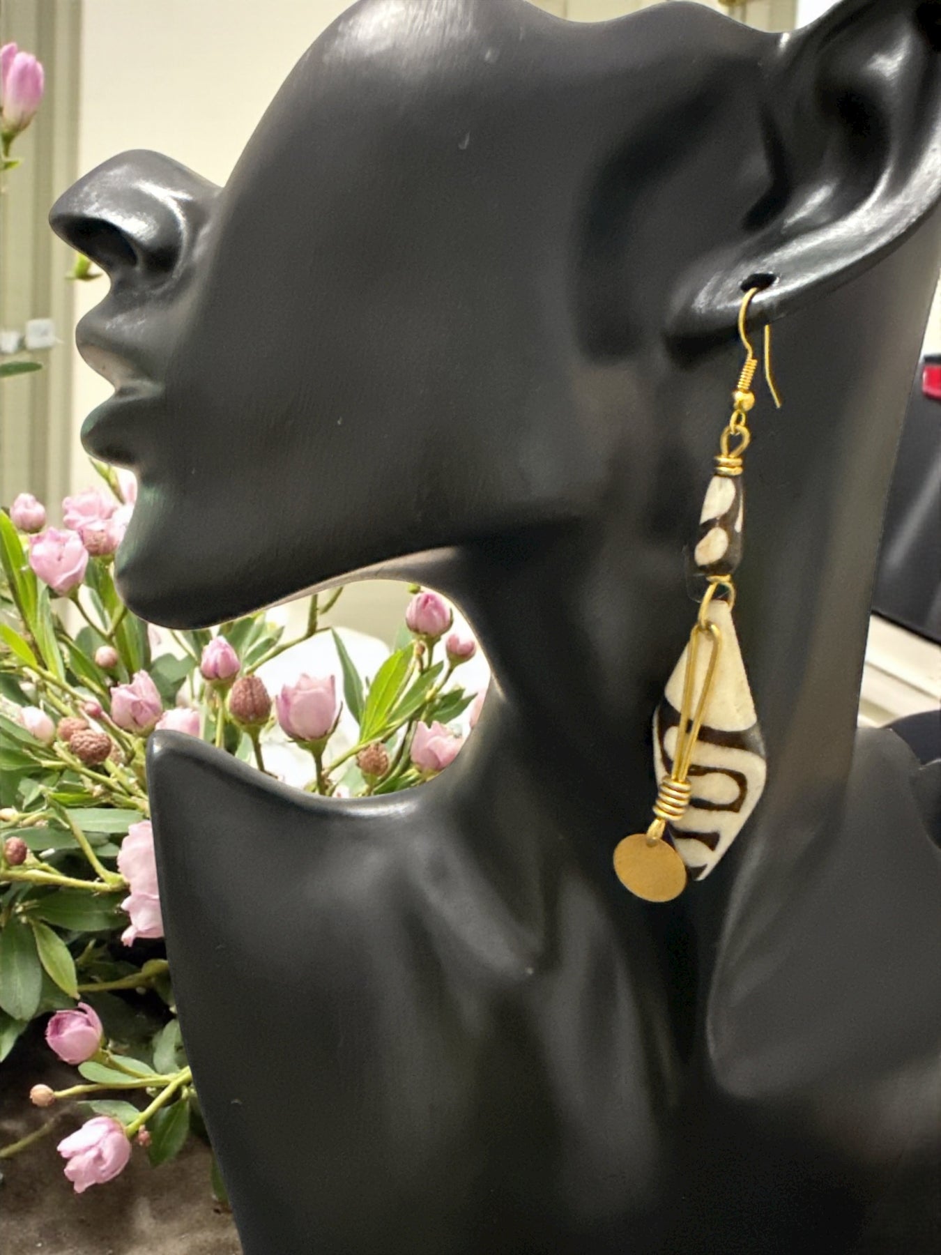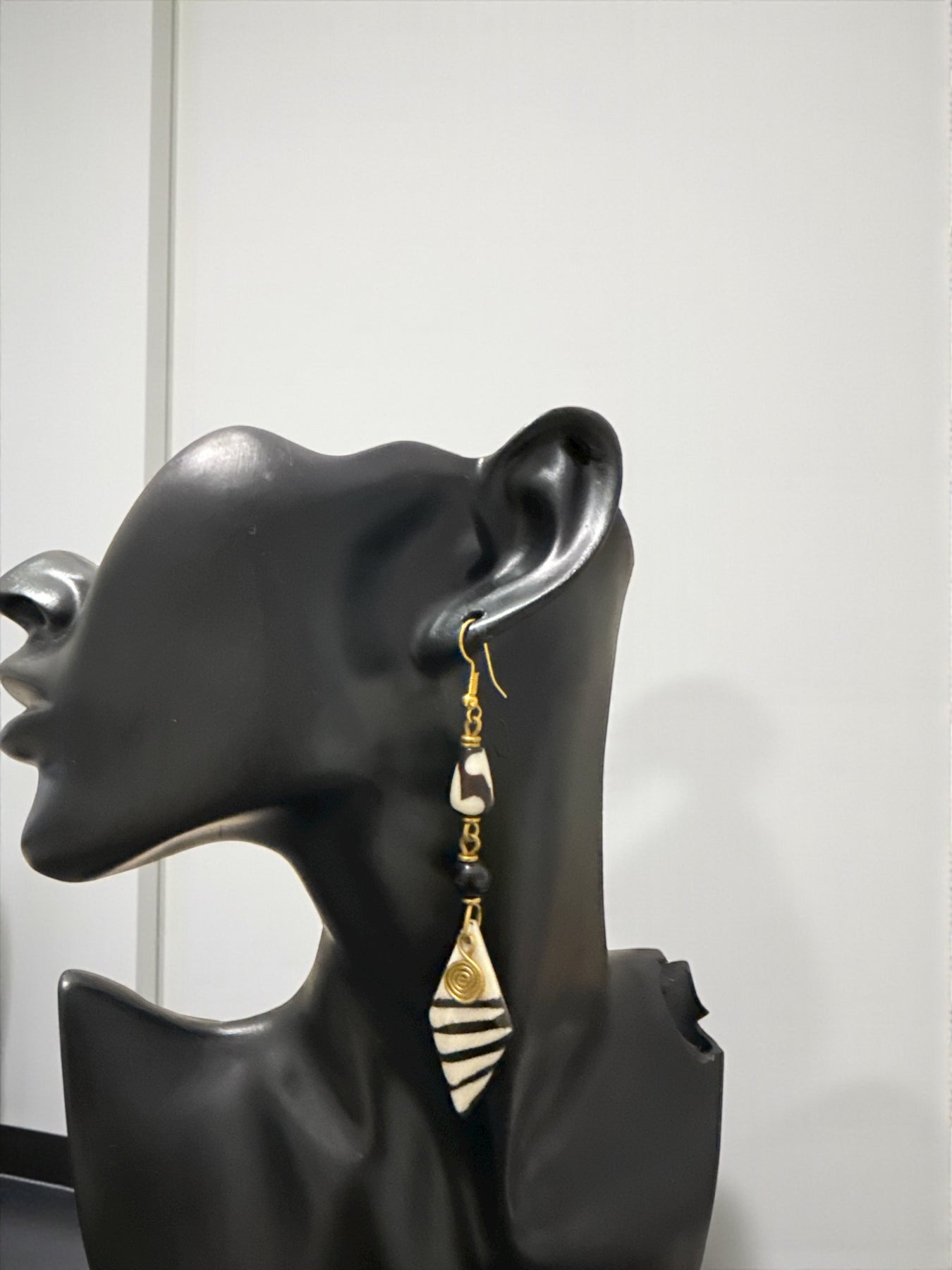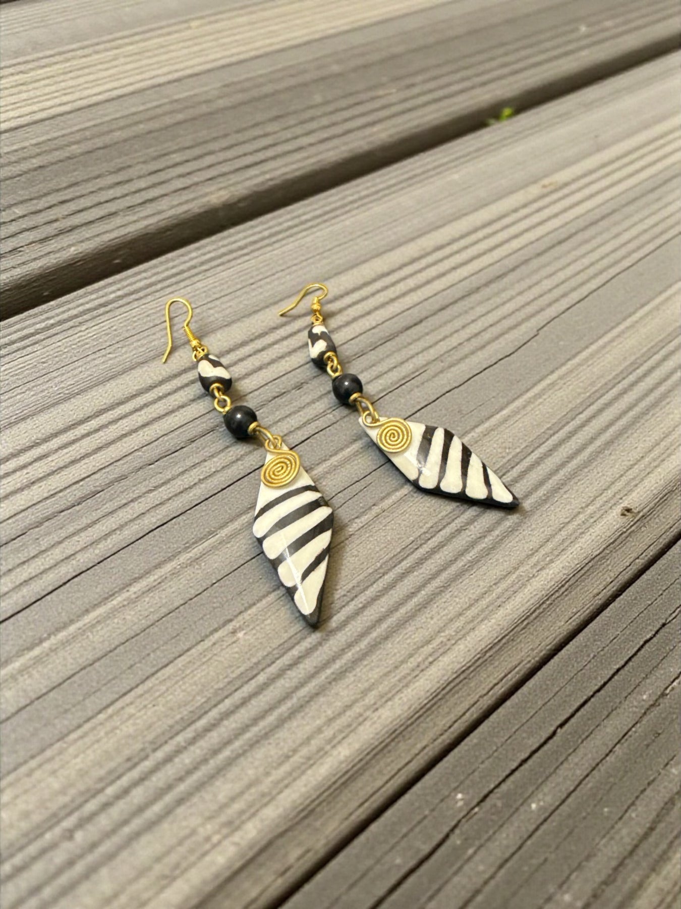 These striking earrings combine bold African patterns with elegant hand-shaped brass detailing. Each pair is crafted using carved horn pieces featuring natural black-and-white stripe patterns, symbolizing balance, strength, and connection to the earth. The design is elevated with handcrafted brass spirals and accent beads that add cultural depth and movement.