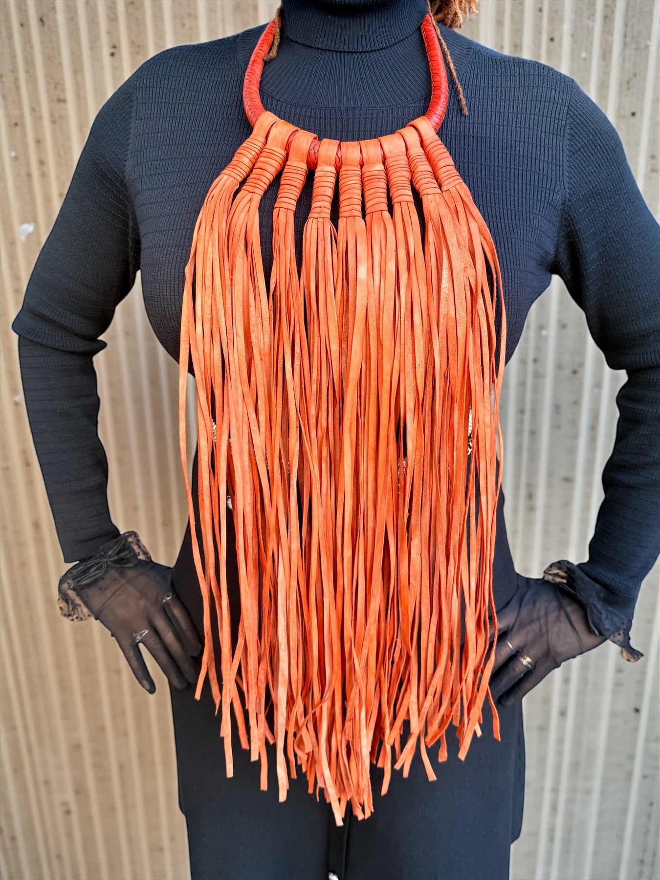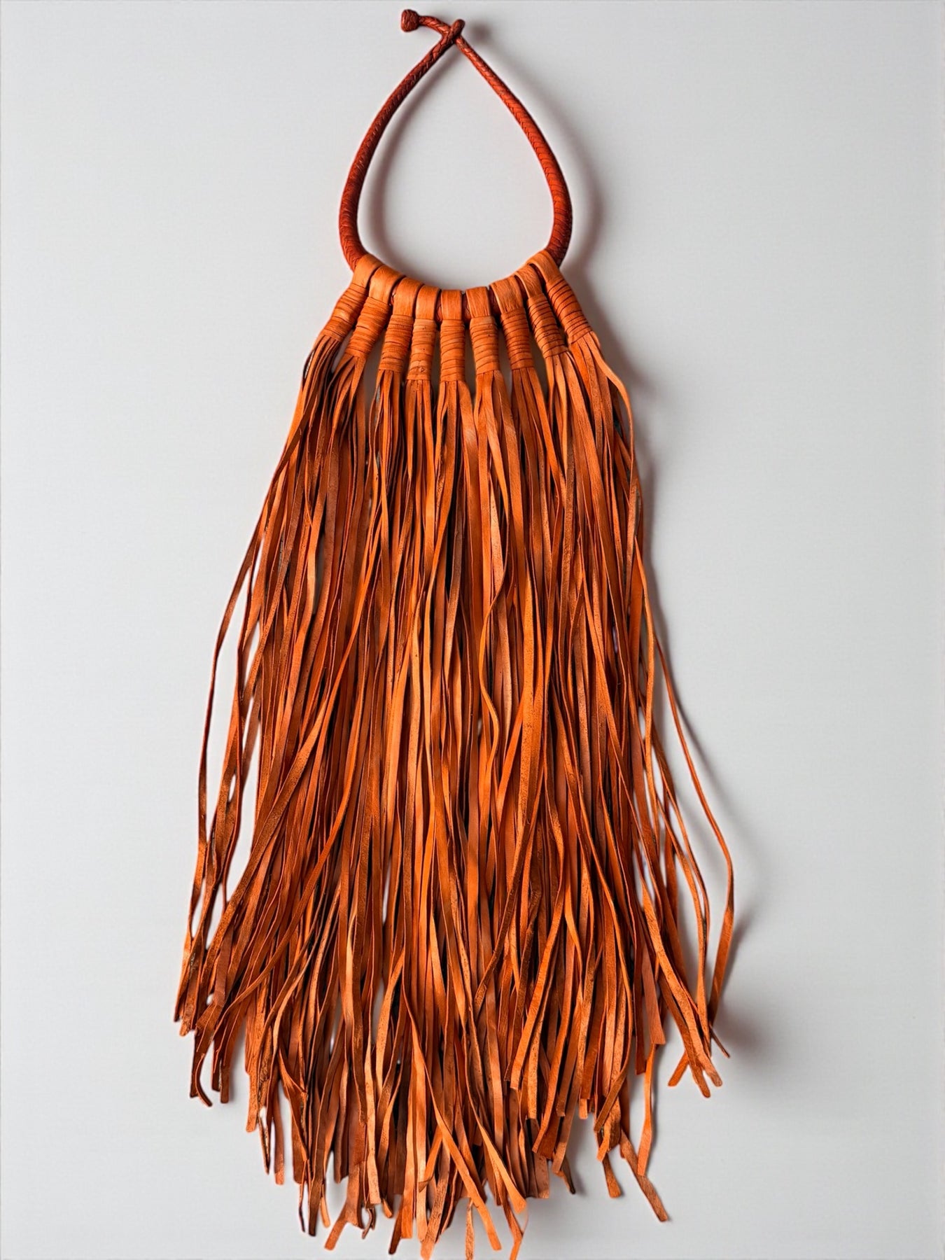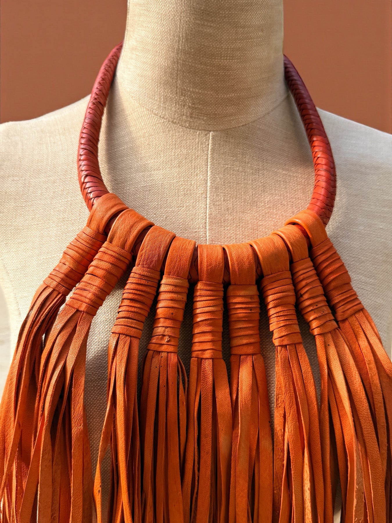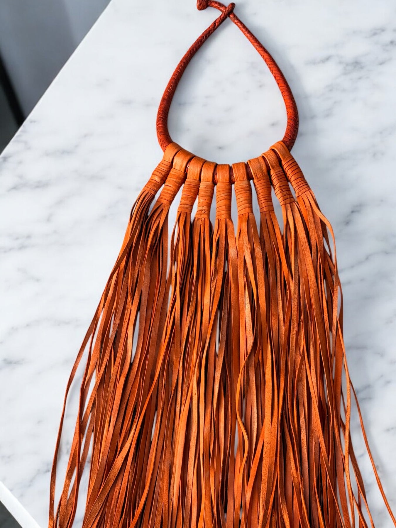 The Sunfire Leather Fringe Statement Necklace is a handcrafted wearable art piece designed to move with you and command attention. Made with long, flowing strips of soft leather in a rich warm orange tone, this necklace adds dramatic texture and cultural depth to any look.