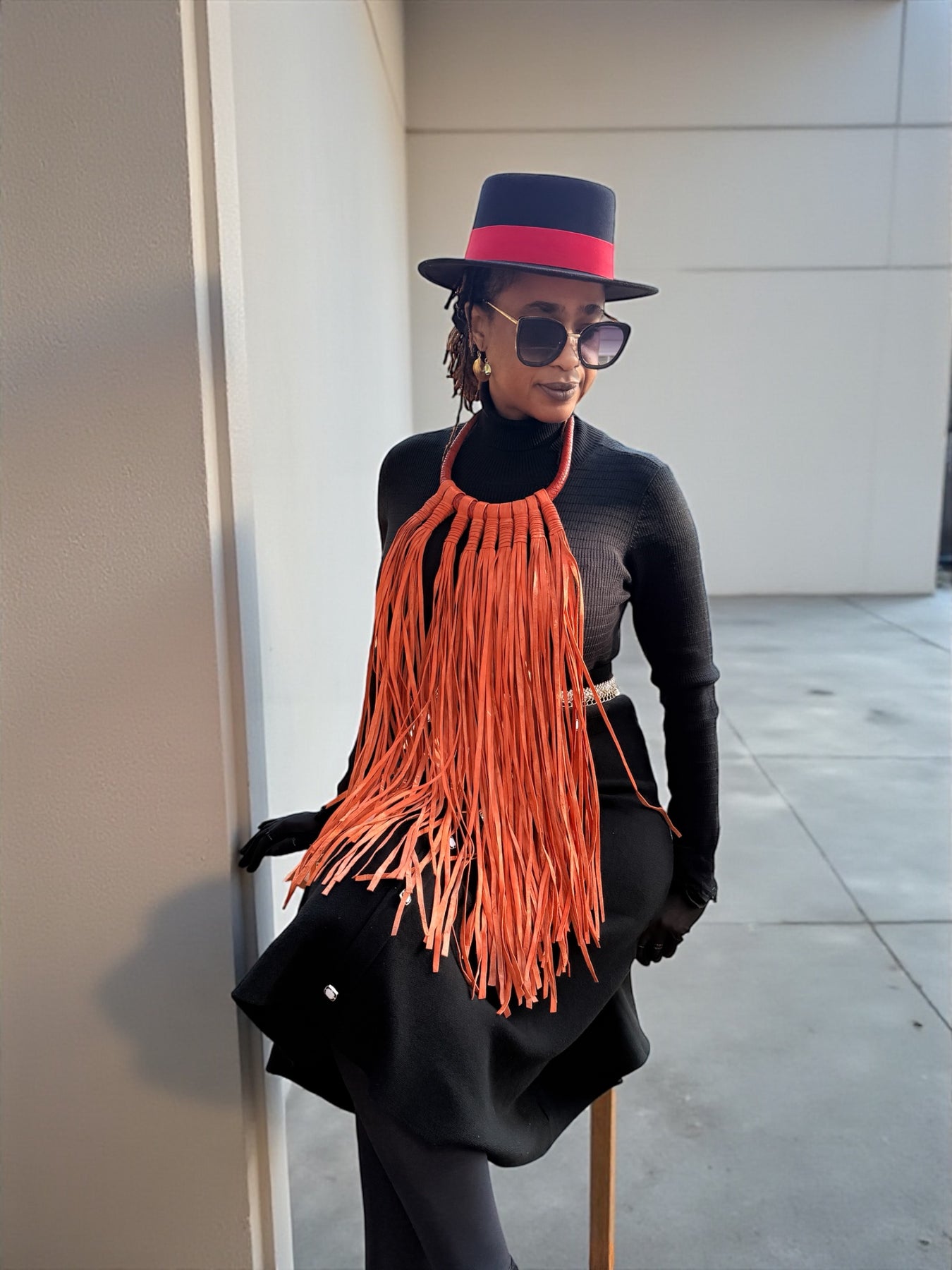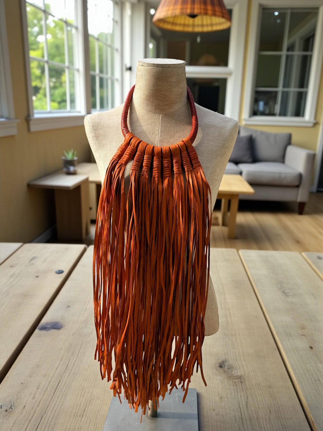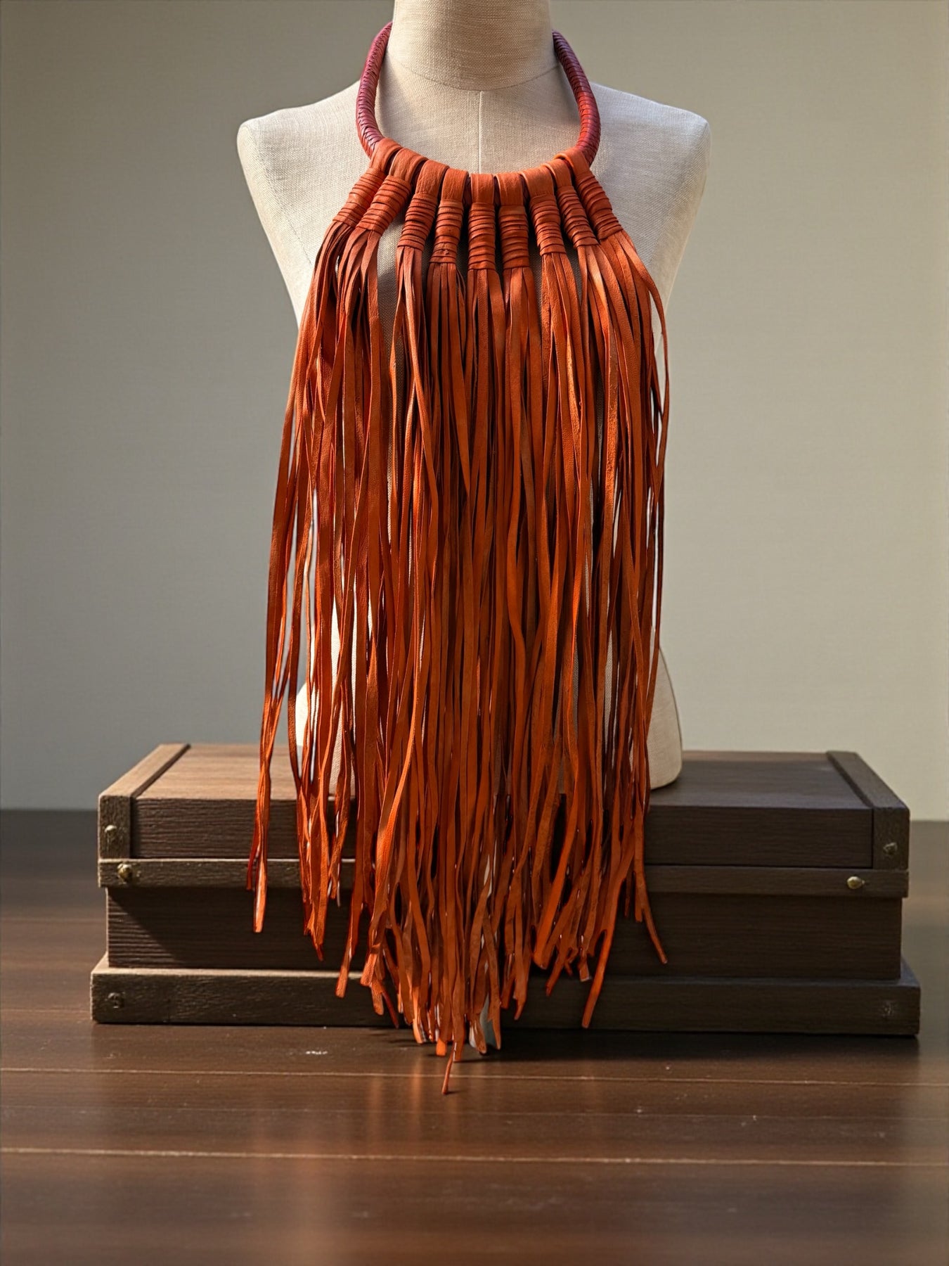 The Sunfire Leather Fringe Statement Necklace is a handcrafted wearable art piece designed to move with you and command attention. Made with long, flowing strips of soft leather in a rich warm orange tone, this necklace adds dramatic texture and cultural depth to any look.