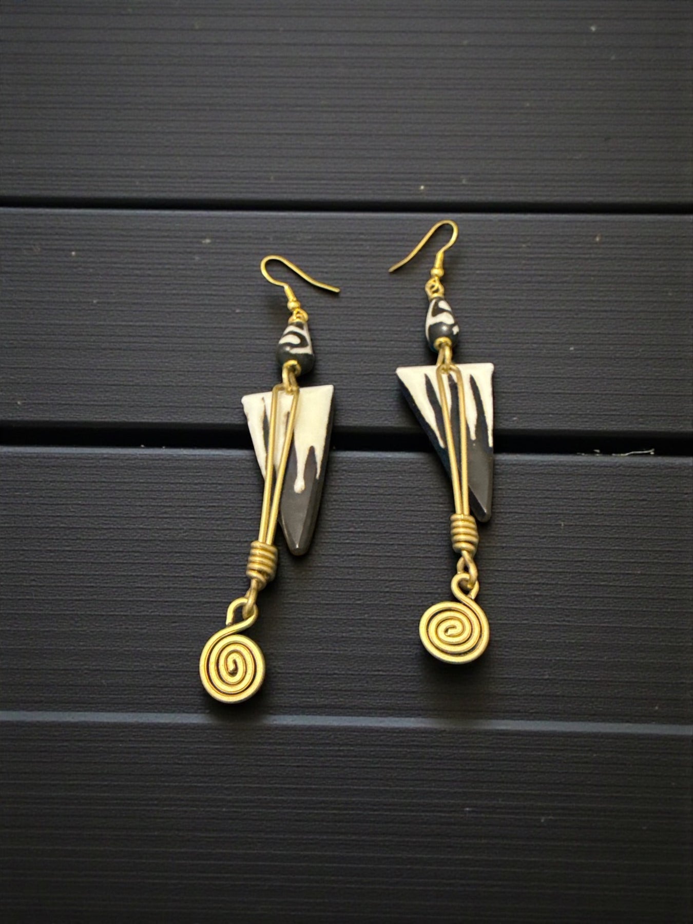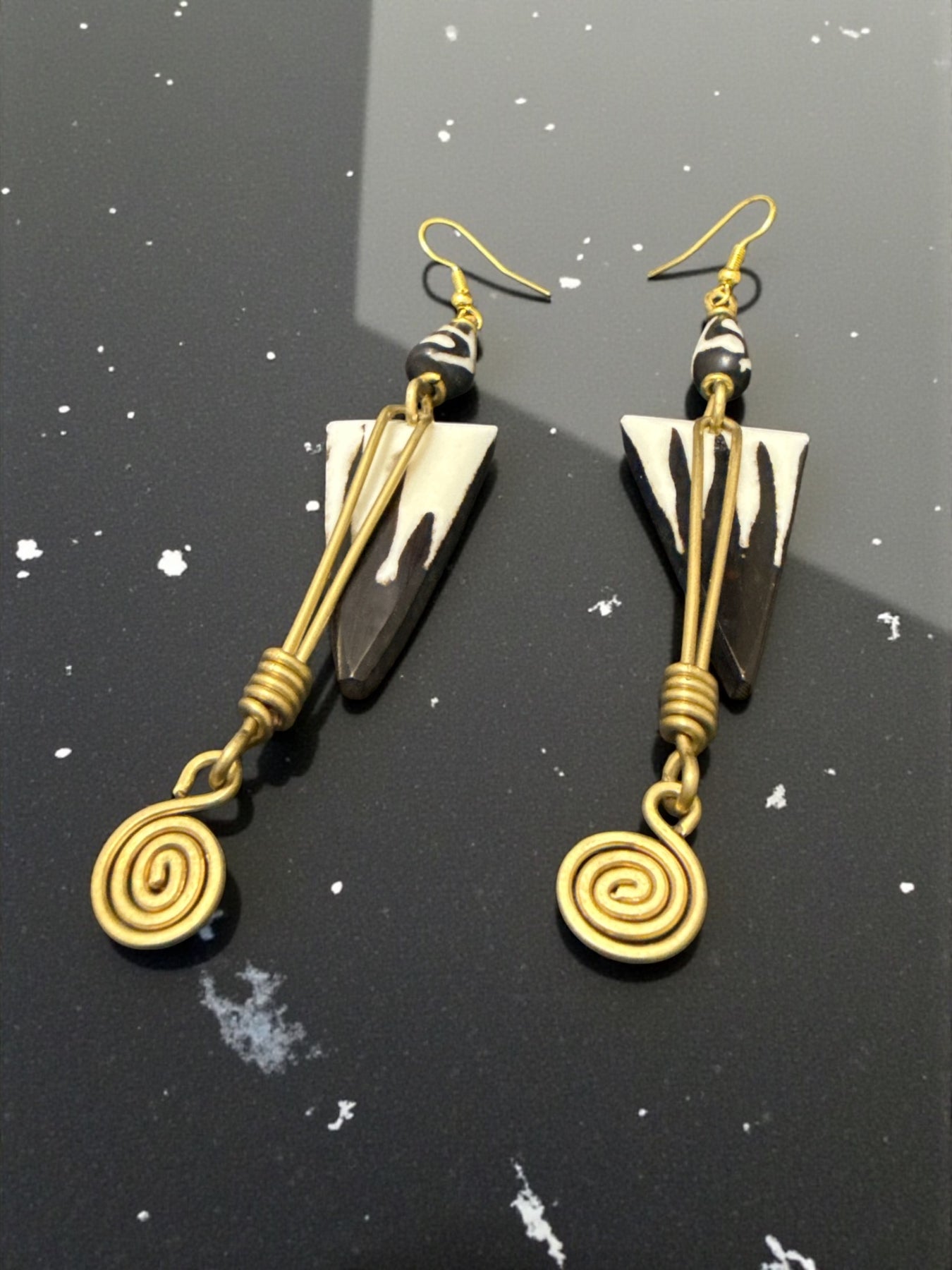 A bold fusion of tradition and modern artistry, these handcrafted earrings feature striking black-and-white African bone accents paired with a cascading brass spiral. Each element is shaped and finished by hand, giving every pair a distinctive character. Lightweight and expressive, they add cultural depth and eye-catching movement to any look.