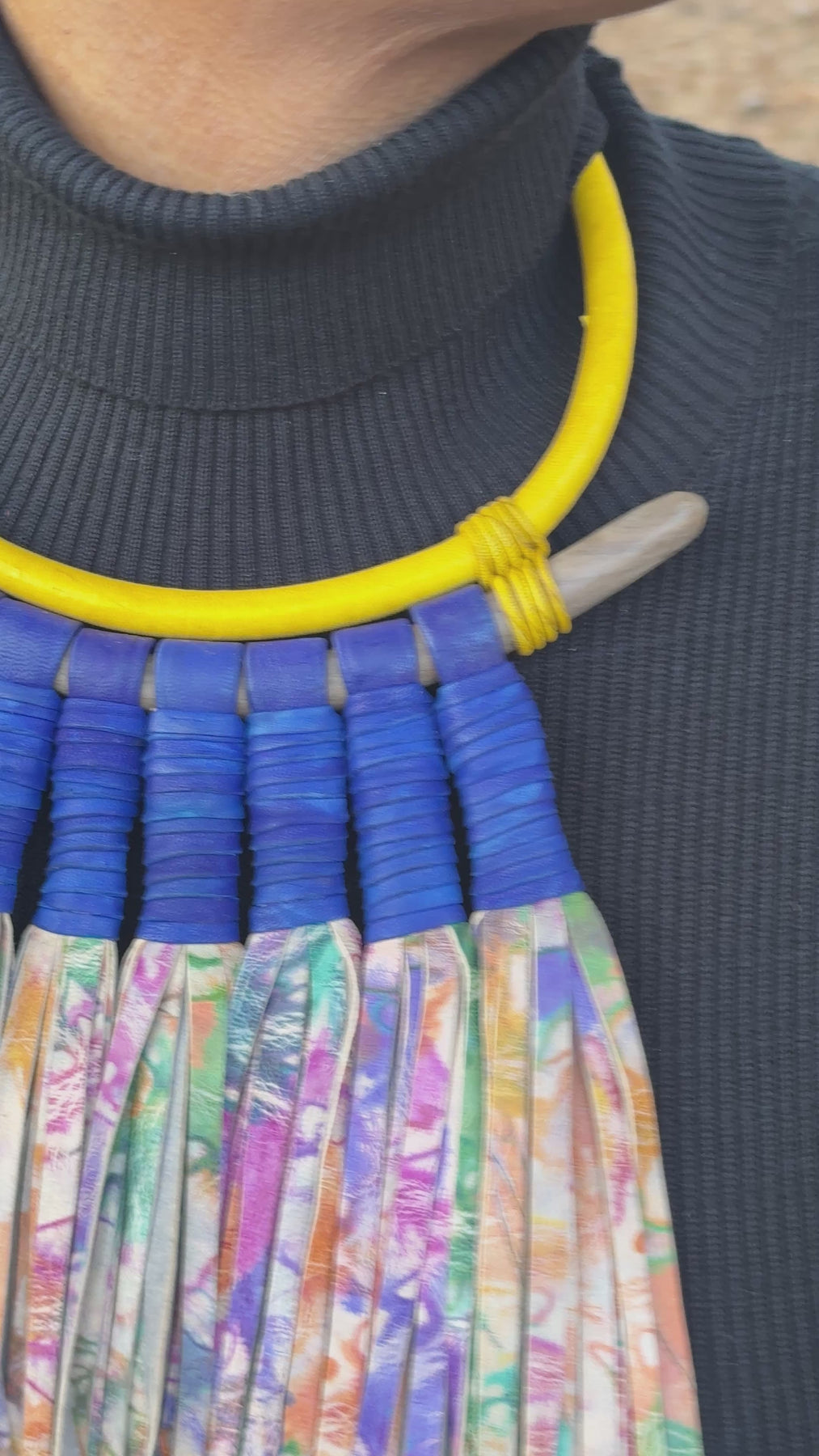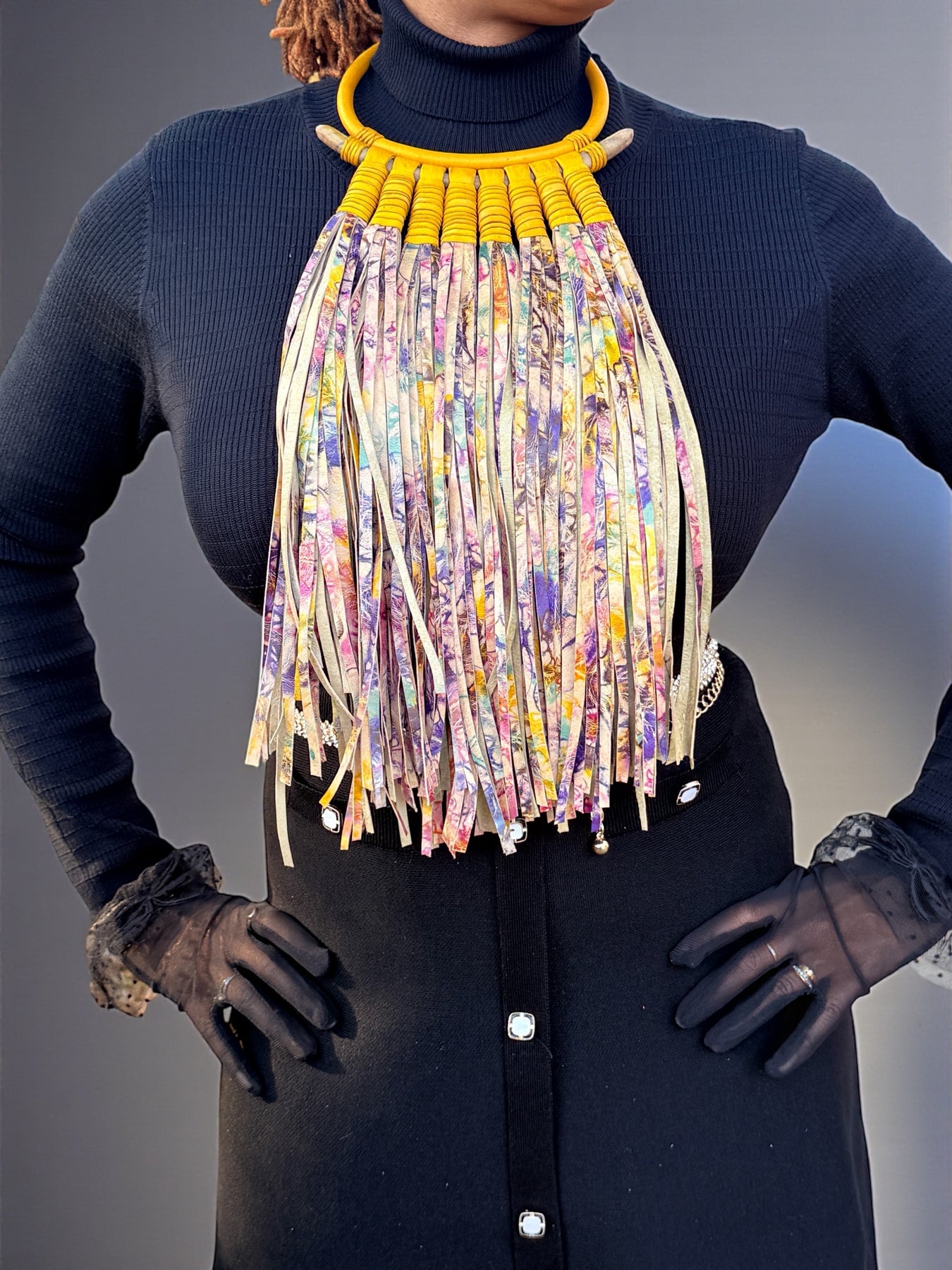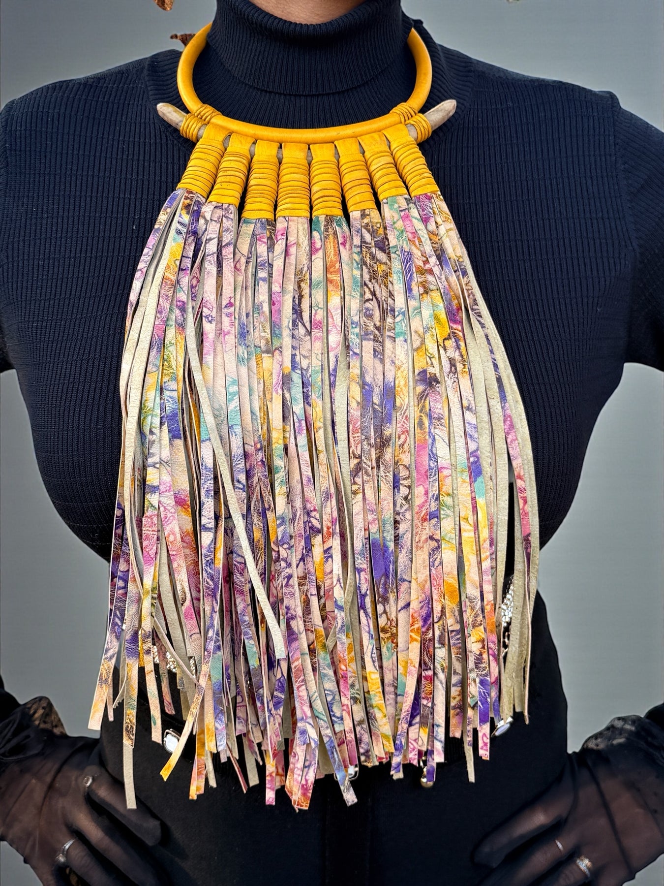 The fringe moves freely with the body, creating rhythm and texture, while the collar anchors the design with bold structure. Color combinations, collar details, and fringe patterns vary across styles, making each necklace visually distinct while maintaining a cohesive statement silhouette.