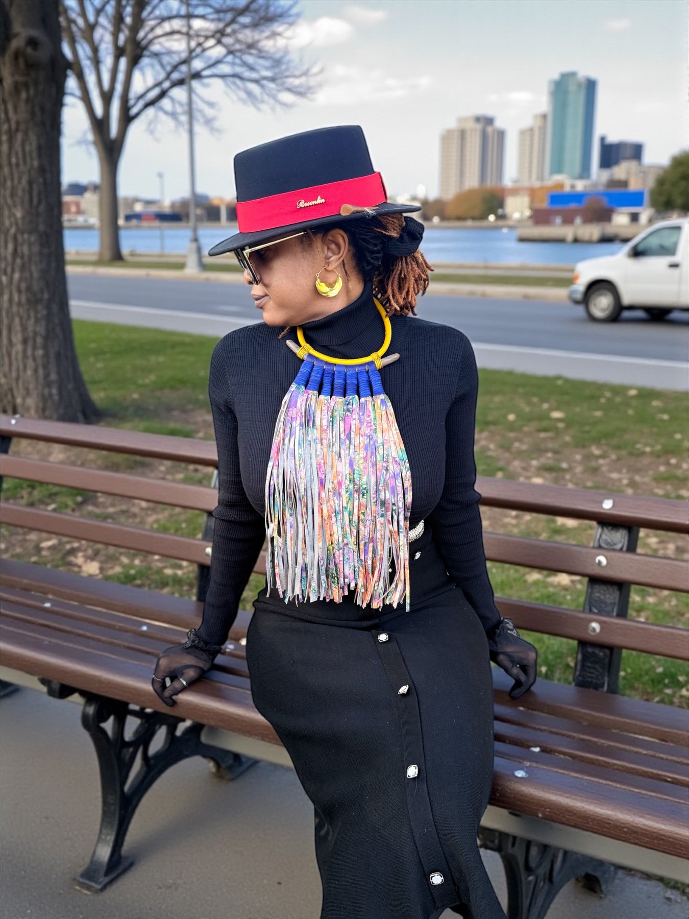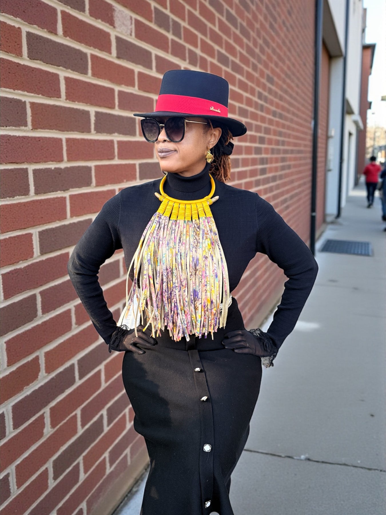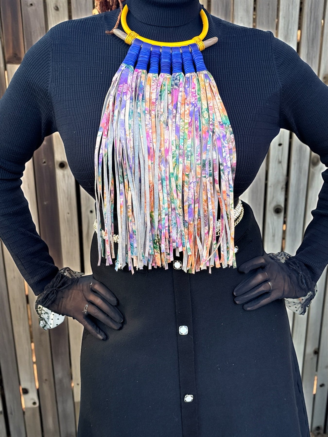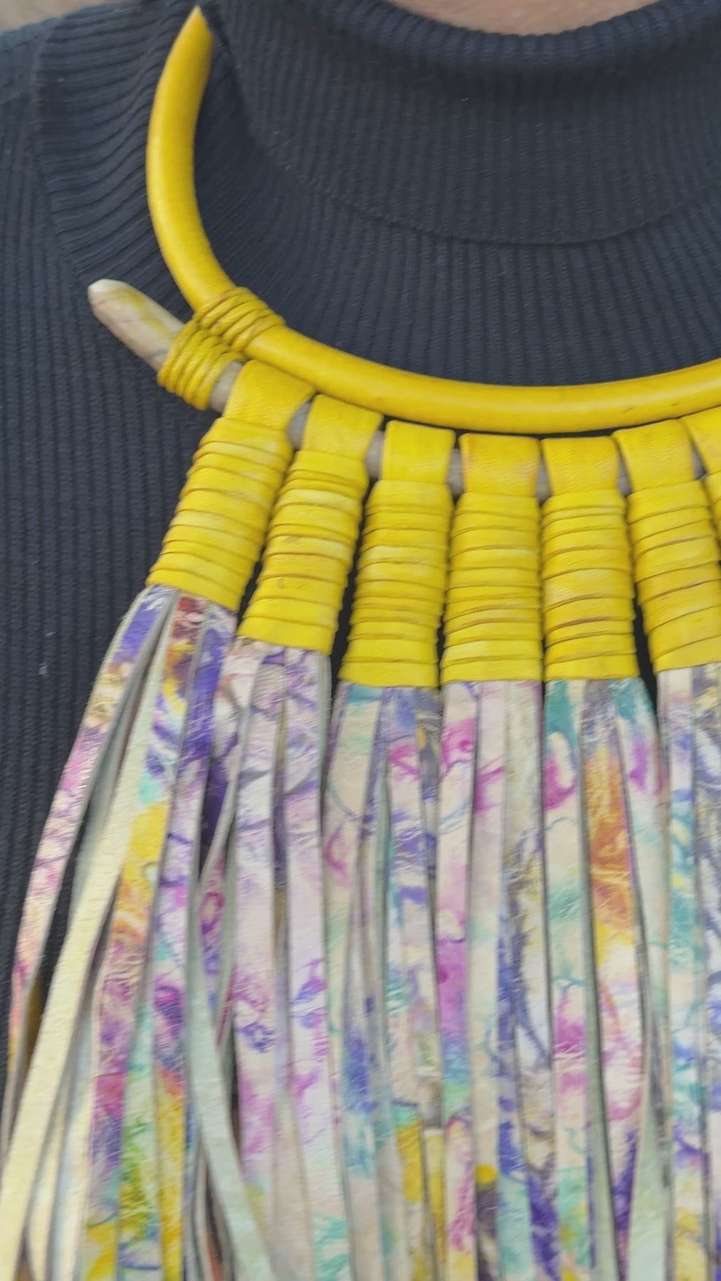 The fringe moves freely with the body, creating rhythm and texture, while the collar anchors the design with bold structure. Color combinations, collar details, and fringe patterns vary across styles, making each necklace visually distinct while maintaining a cohesive statement silhouette.