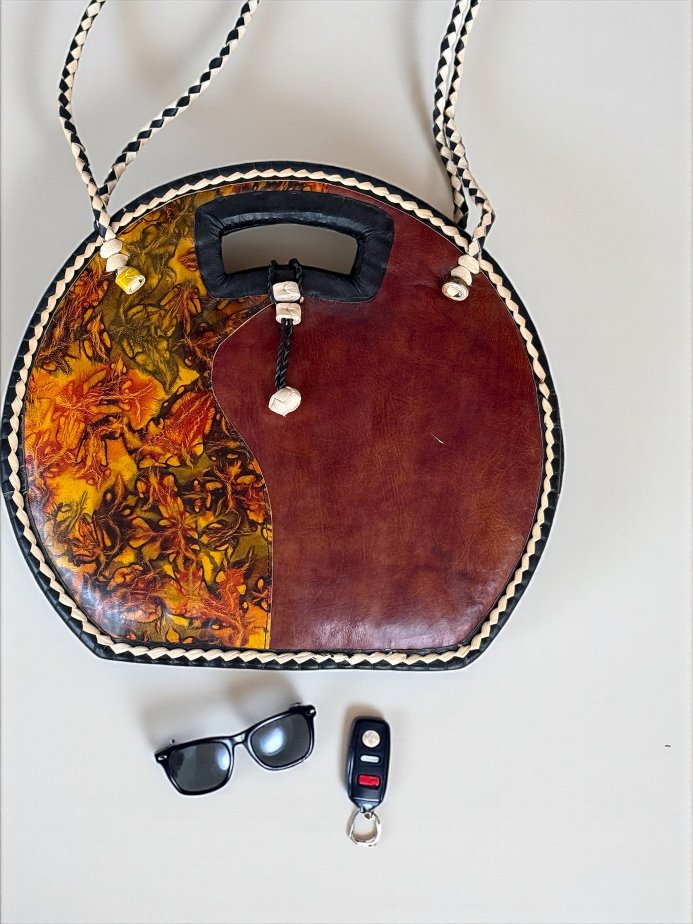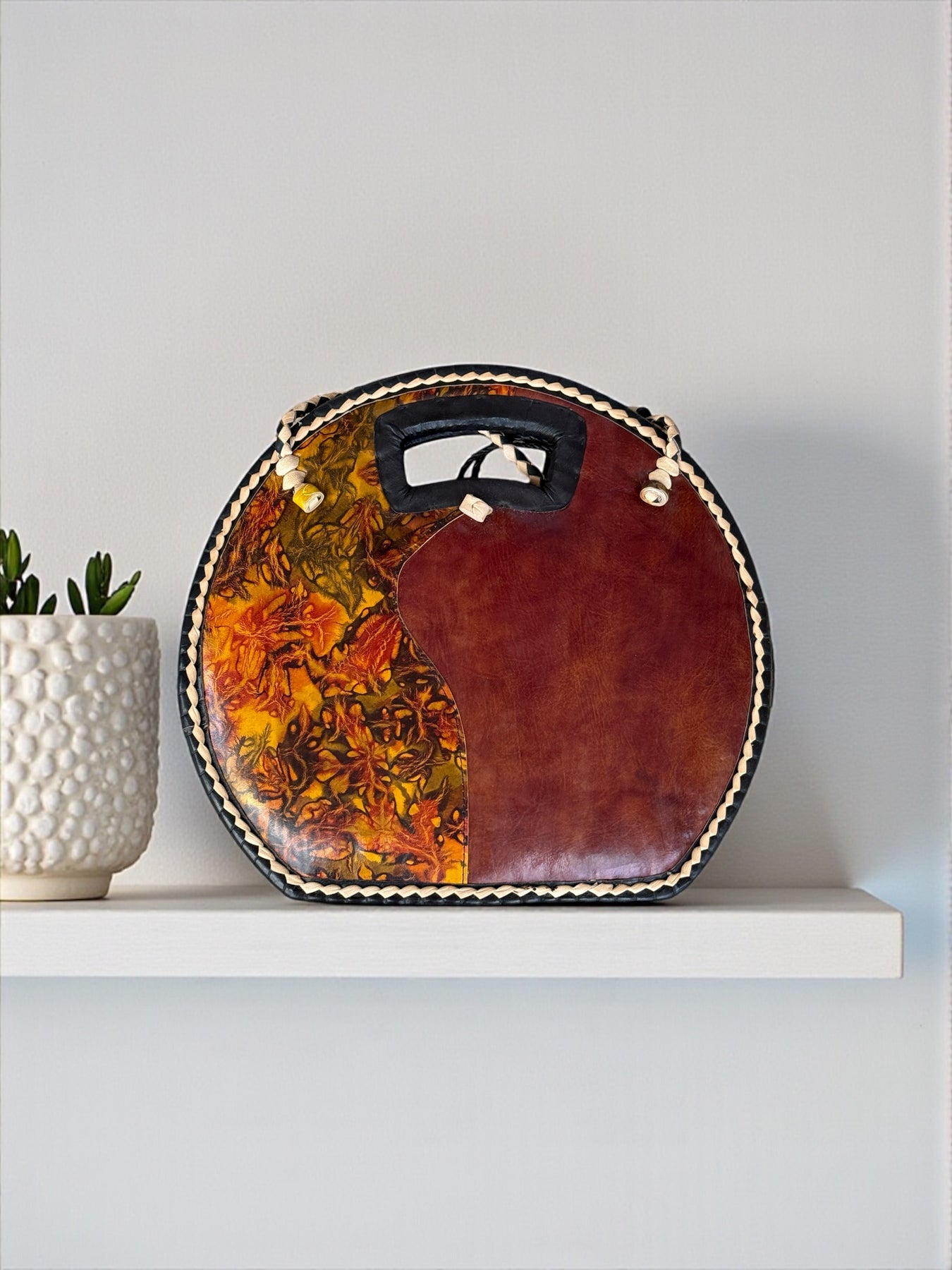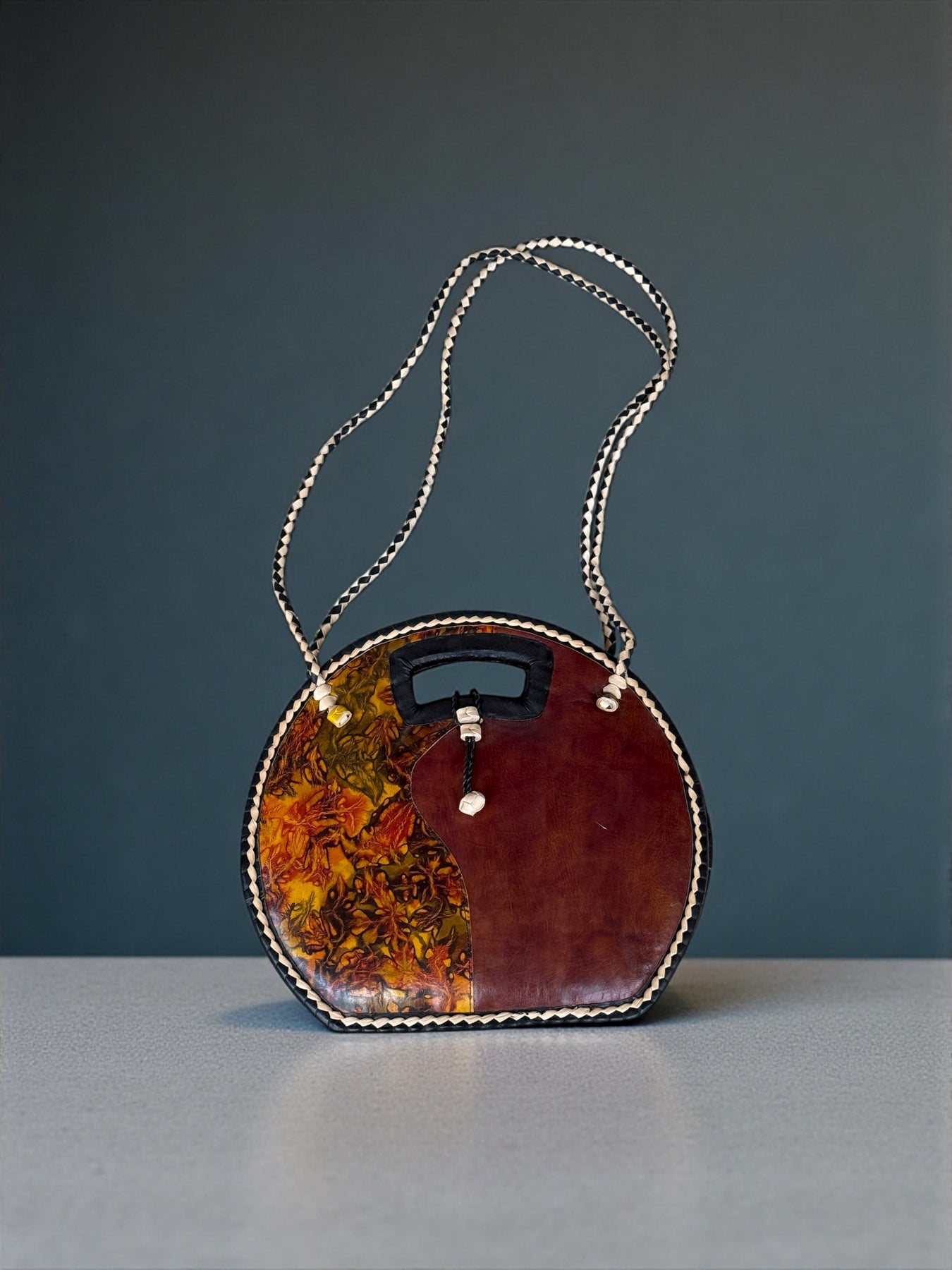 This round tote combines rich leather with handwoven rafia, creating a bold and stylish statement bag. The front features a dramatic patterned leather panel with warm earth tones and artistic marbling, while the braided edges and carved handle bring a beautiful handmade finish.