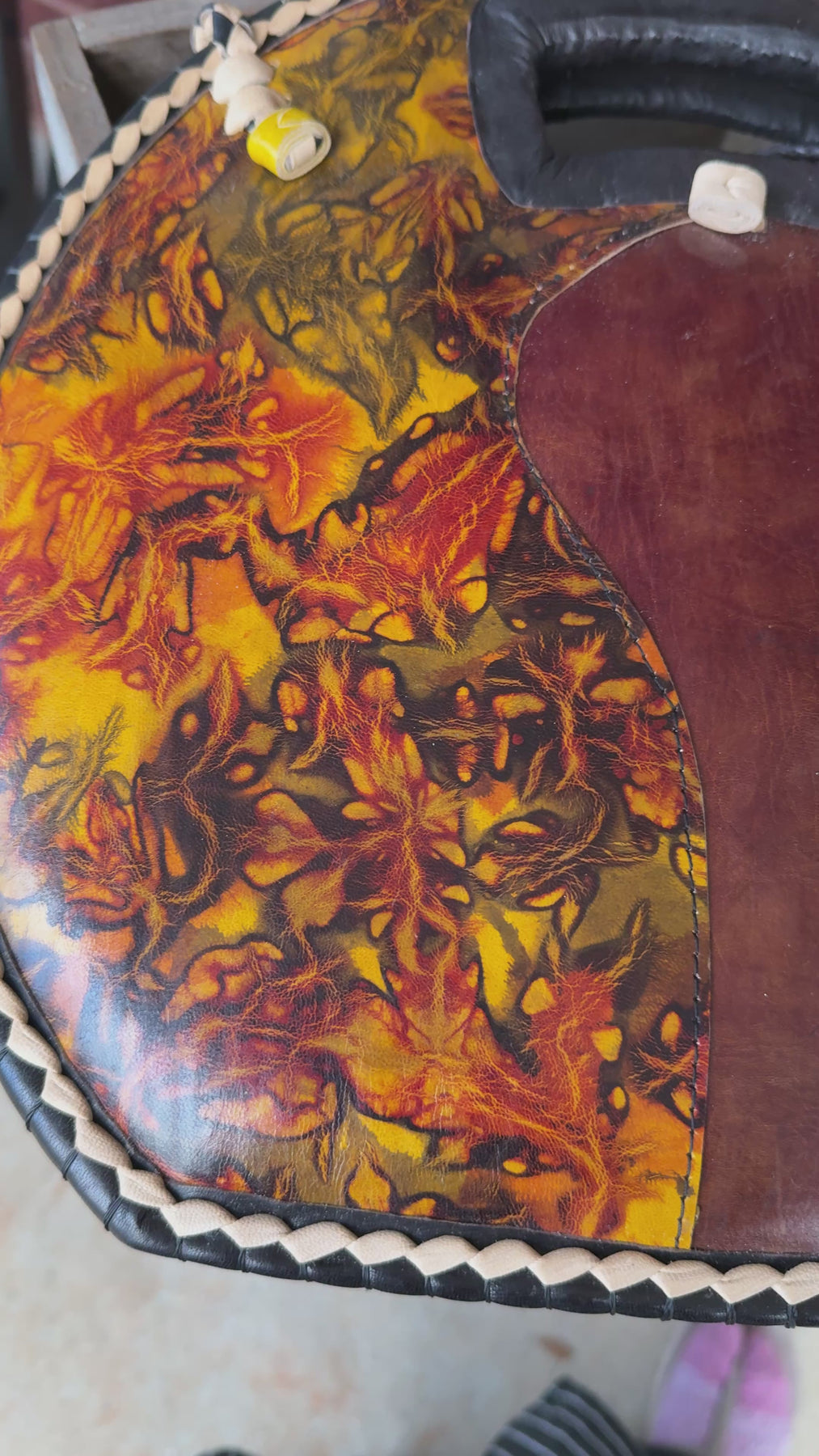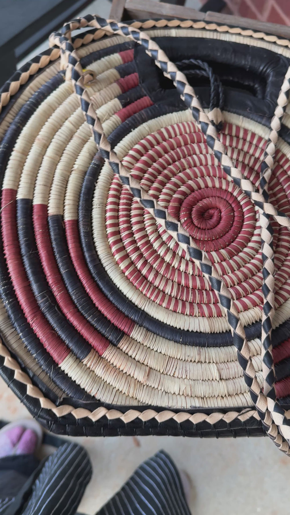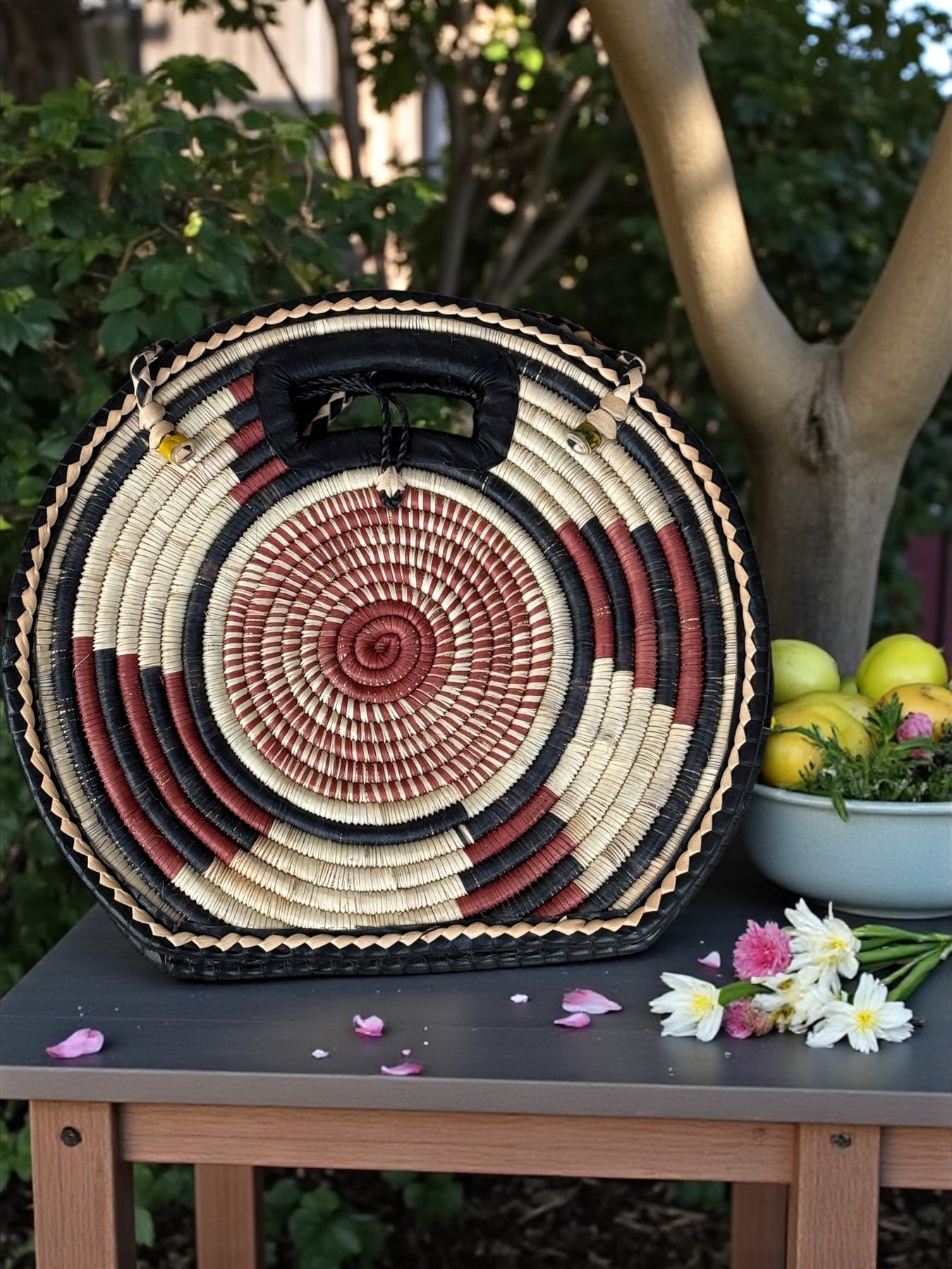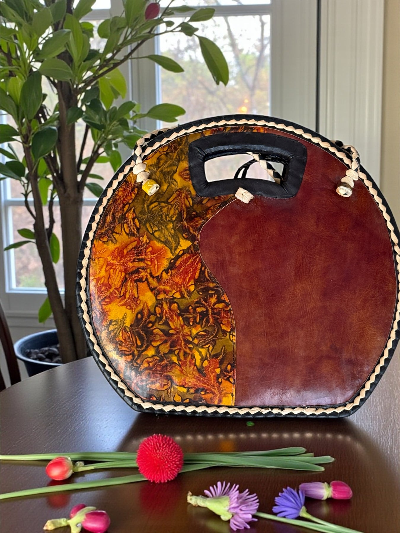 This round tote combines rich leather with handwoven rafia, creating a bold and stylish statement bag. The front features a dramatic patterned leather panel with warm earth tones and artistic marbling, while the braided edges and carved handle bring a beautiful handmade finish.