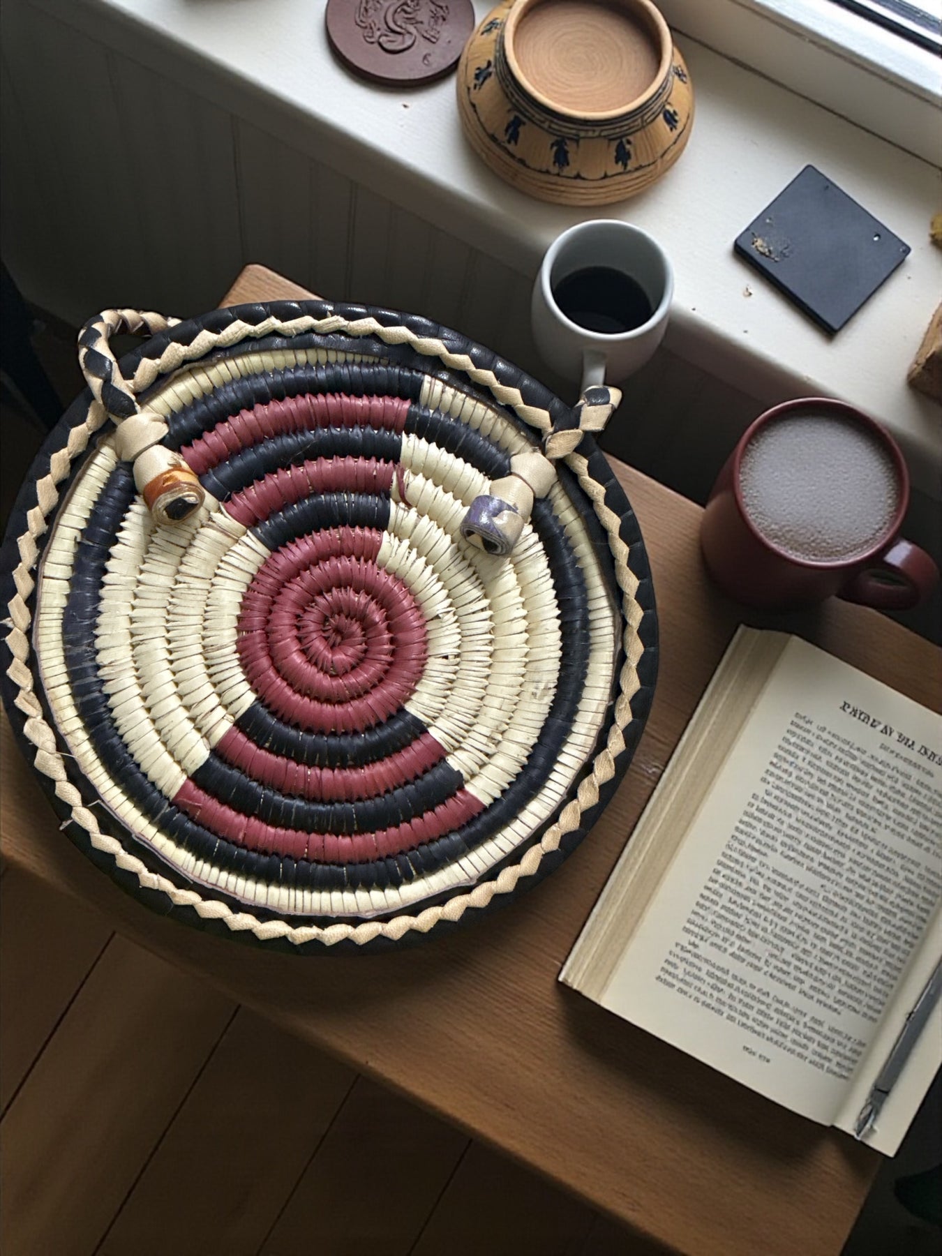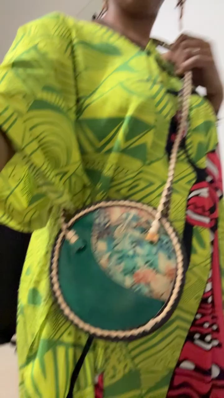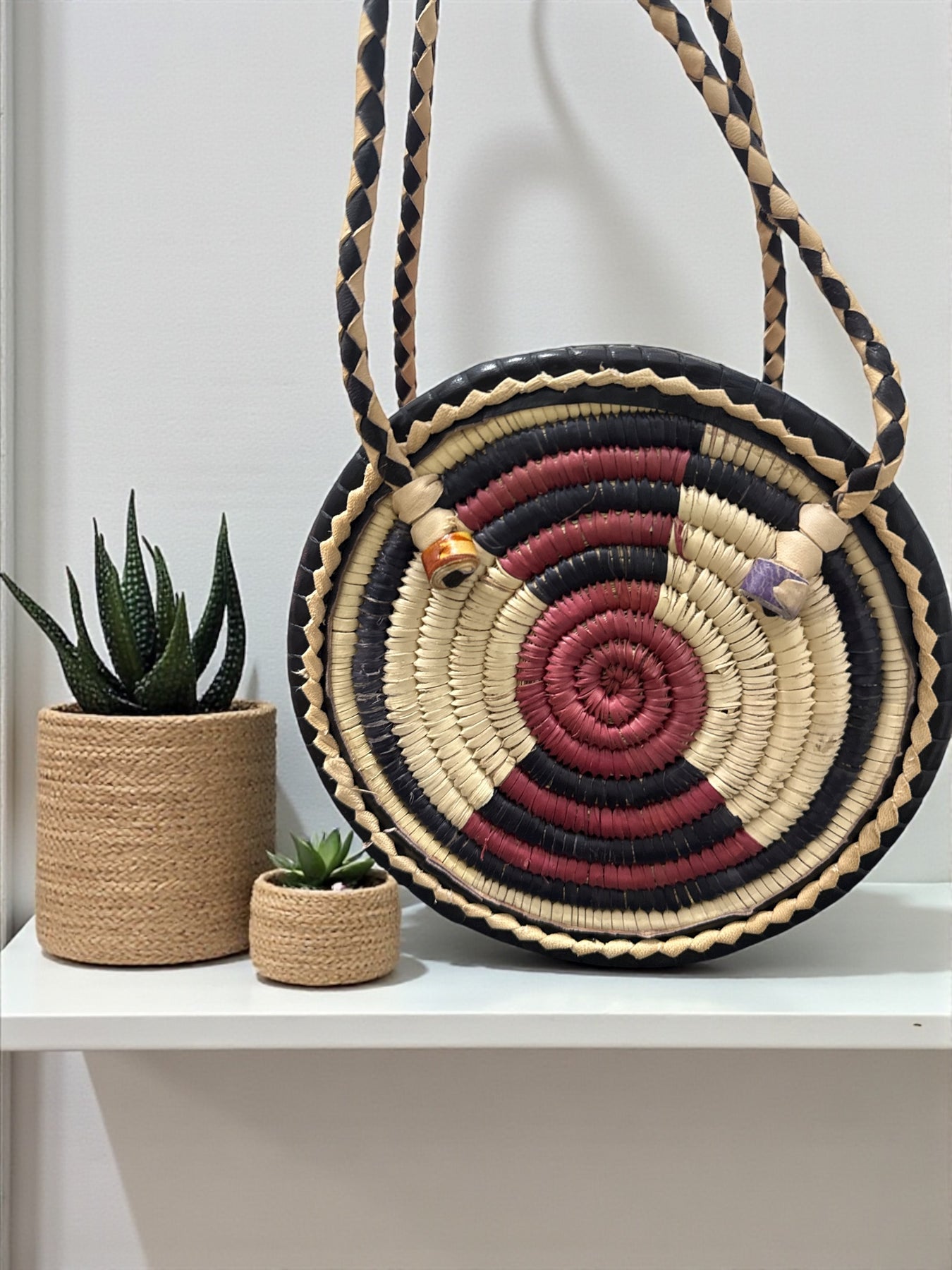 A true statement piece, this round artisan crossbody blends vibrant tie-dye leather with traditional rafia weaving to create a bag full of culture, elegance, and craftsmanship. Handmade in Burkina Faso, each design reflects the creativity and skill of local artisans who transform natural materials into wearable art.