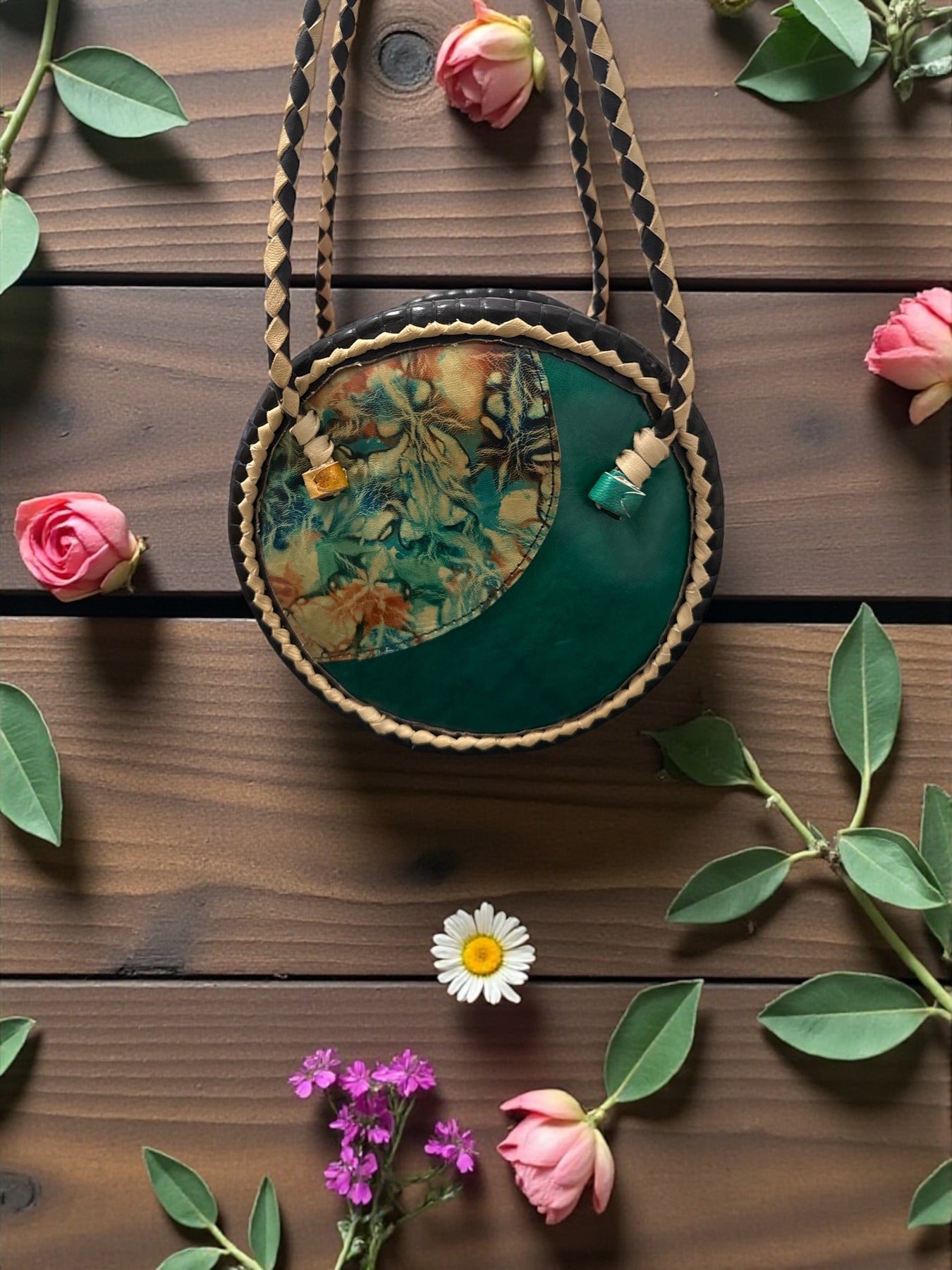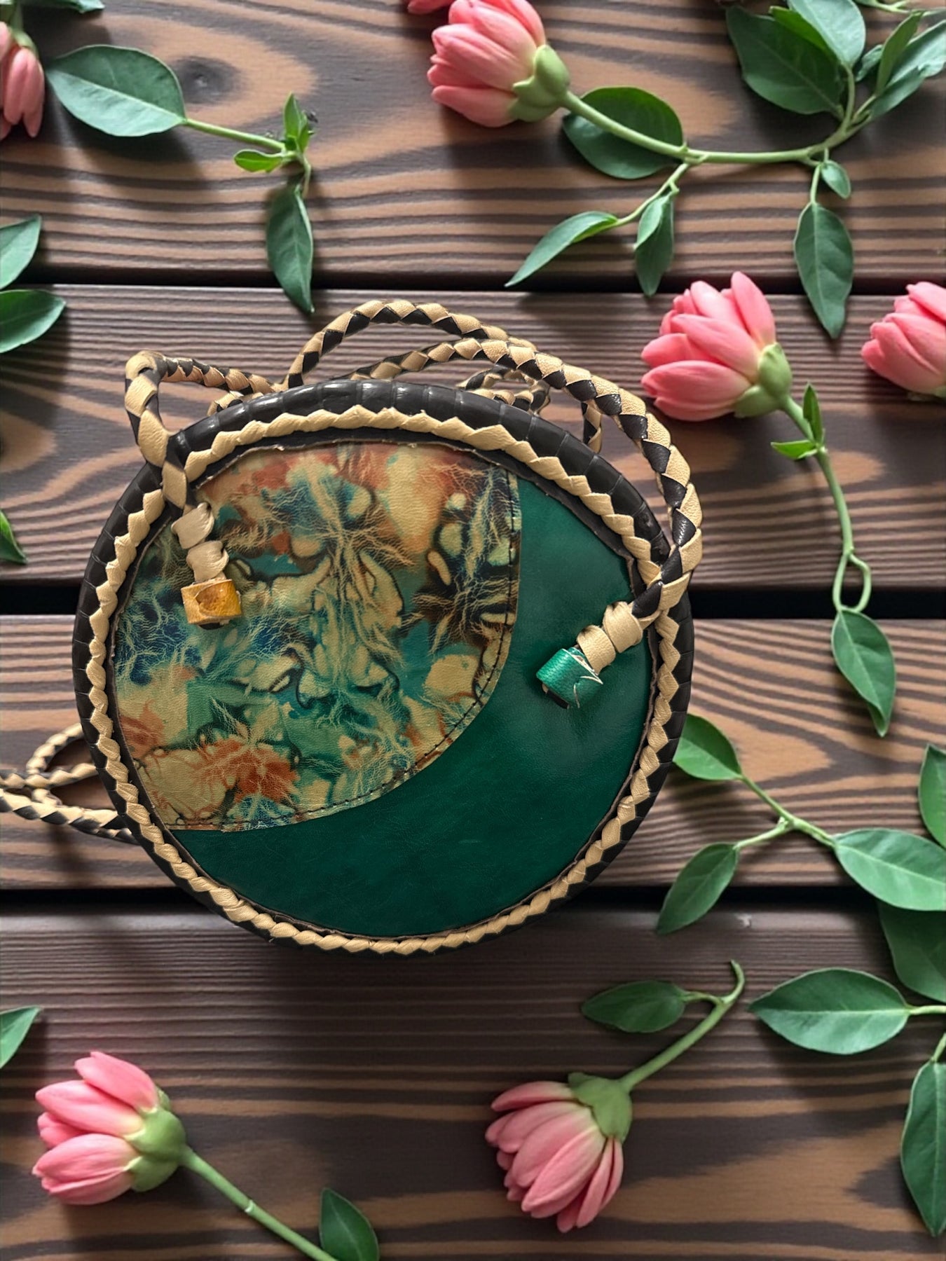 The striking green and multicolor tie-dye pattern is paired with smooth leather and bordered with braided detailing, giving this bag a bold yet timeless finish. Compact, lightweight, and eye-catching, it’s the perfect size for essentials while still making a beautifully unique fashion statement.