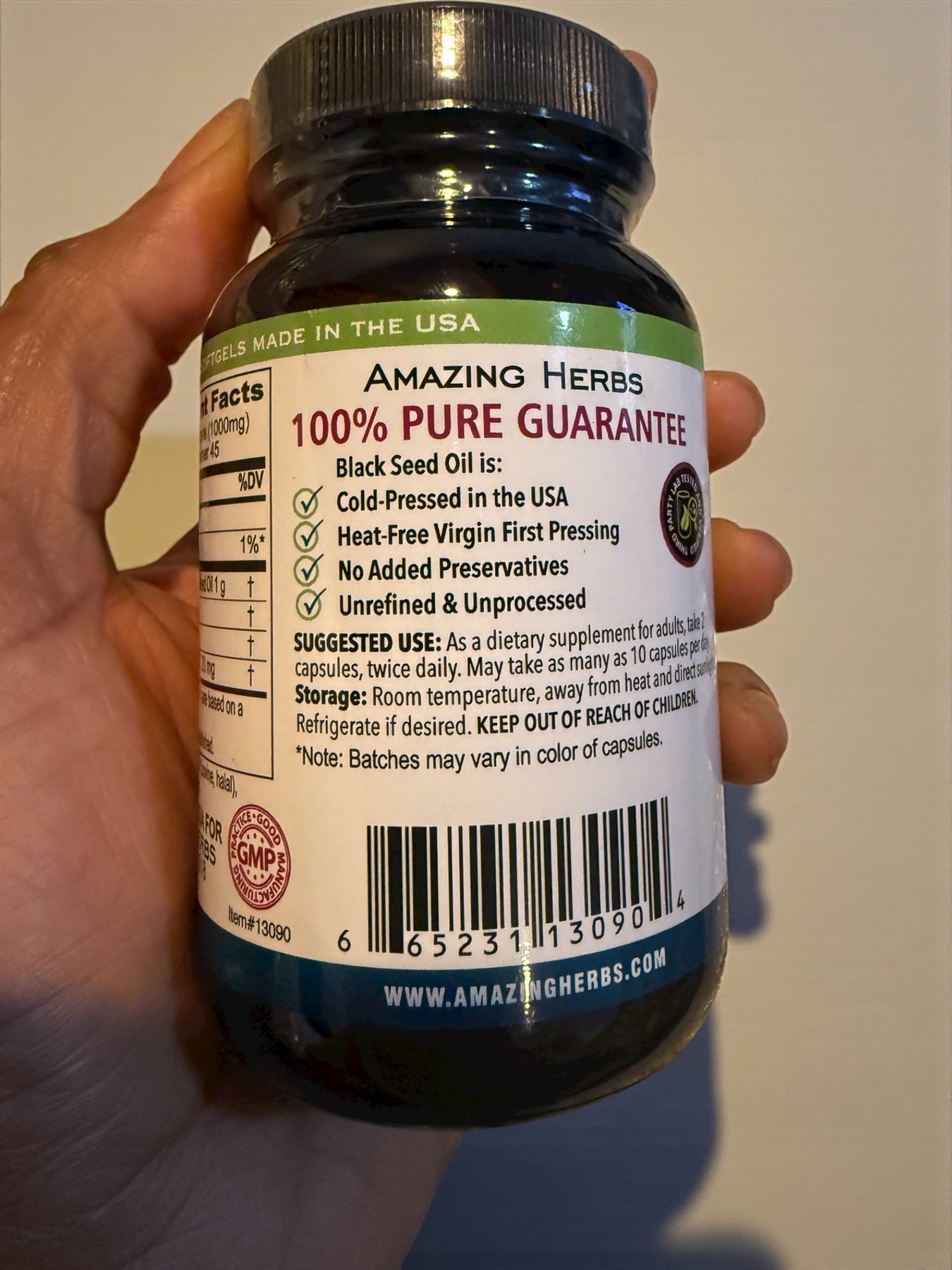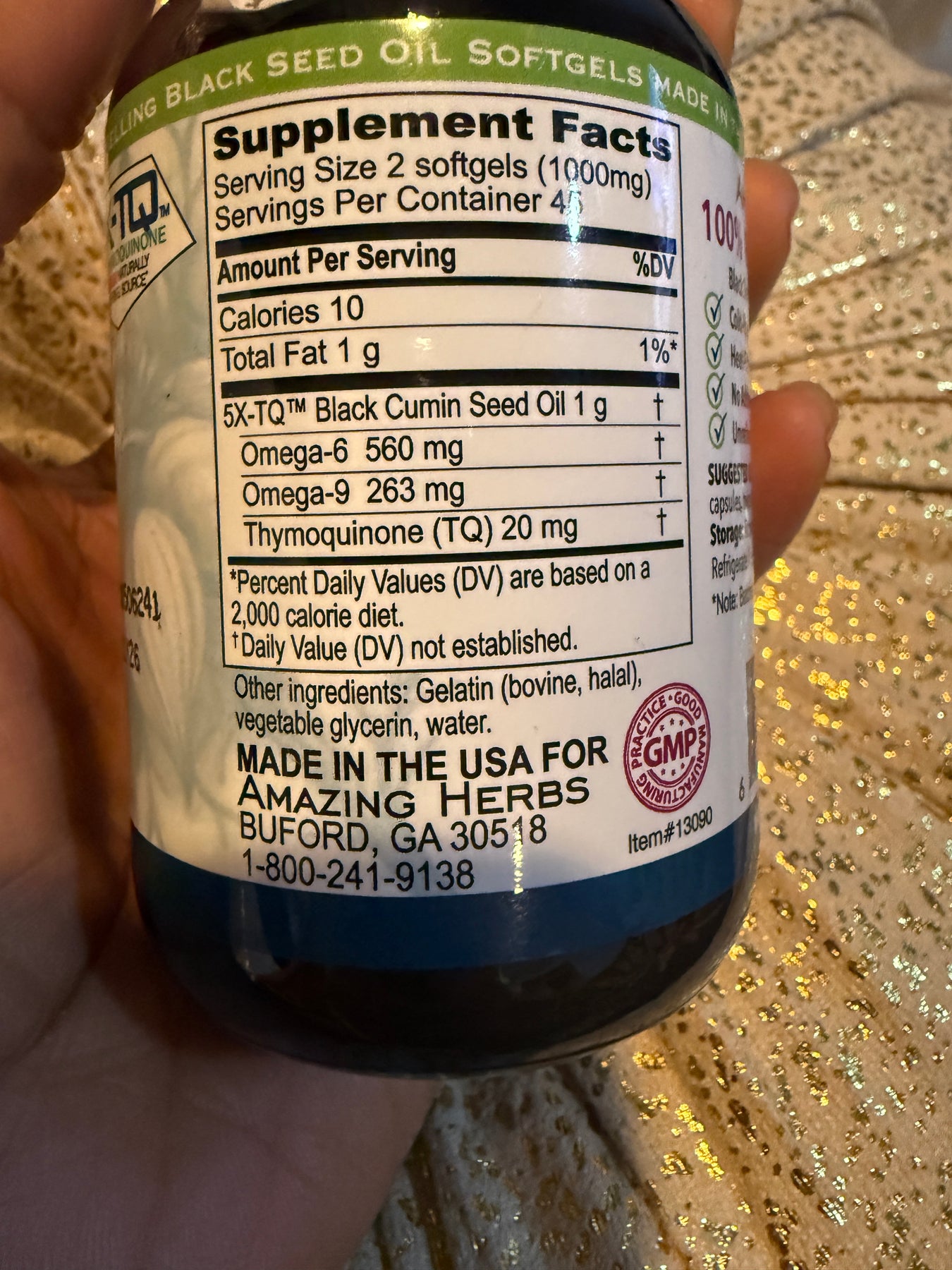Main ingredients: Black cumin seed oil, gelatin (bovine, halal), vegetable glycerin, water.