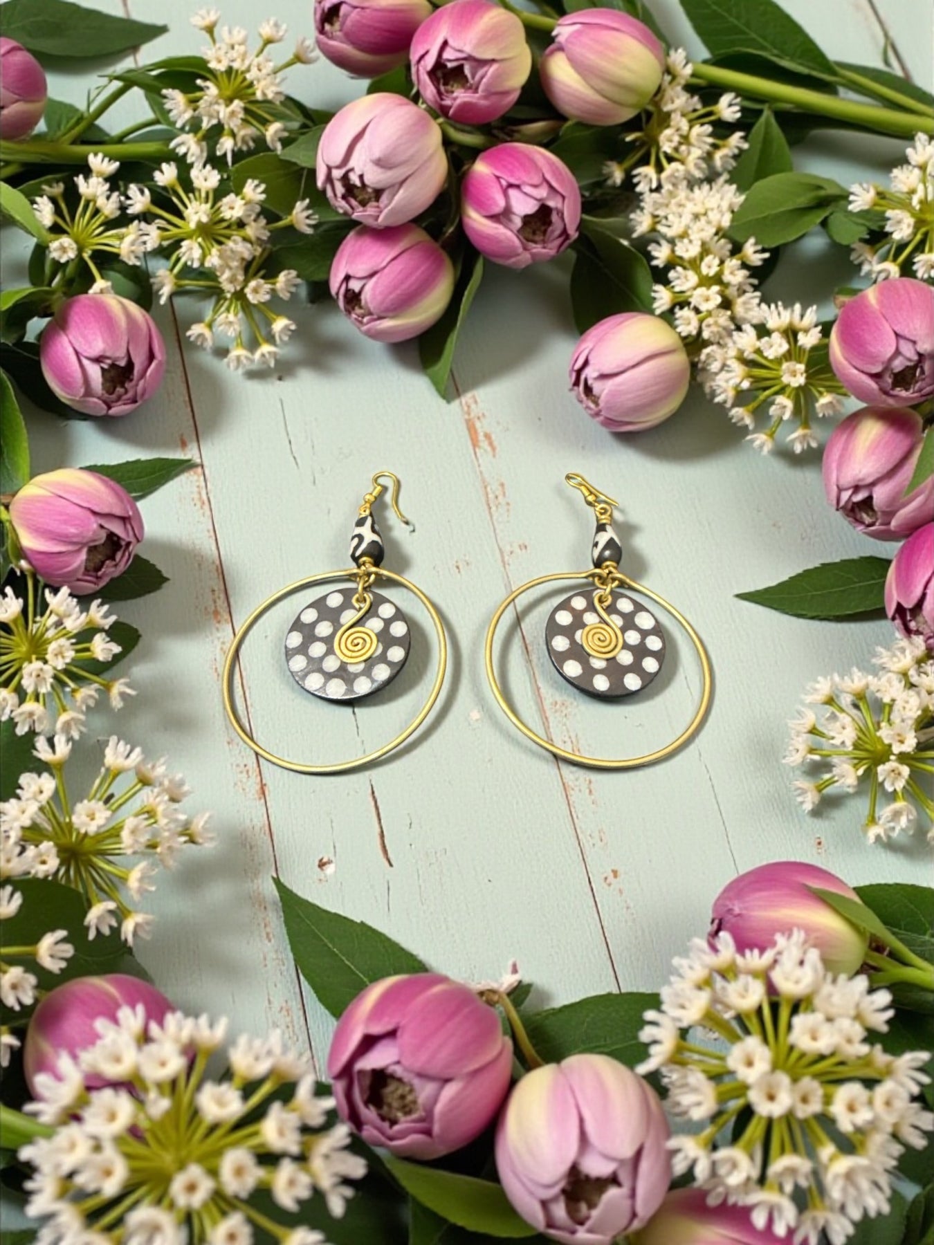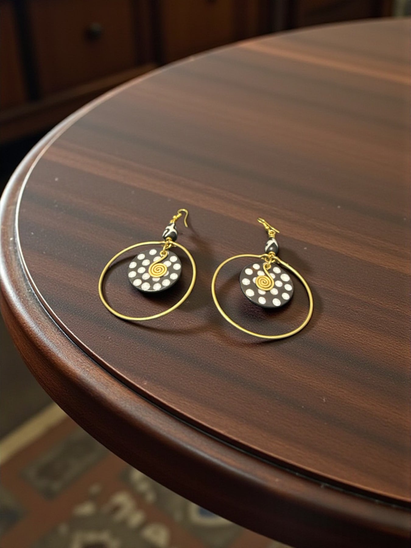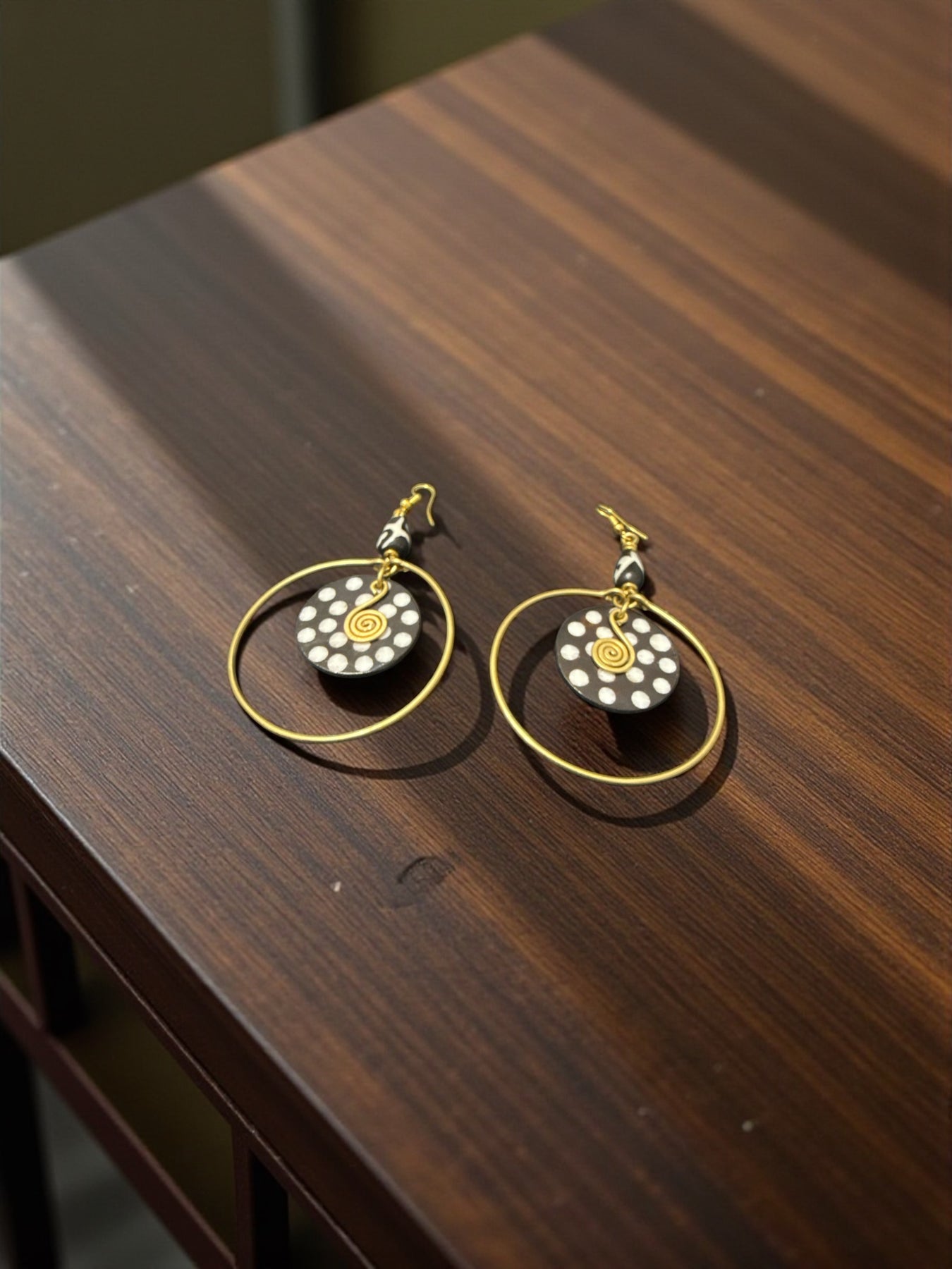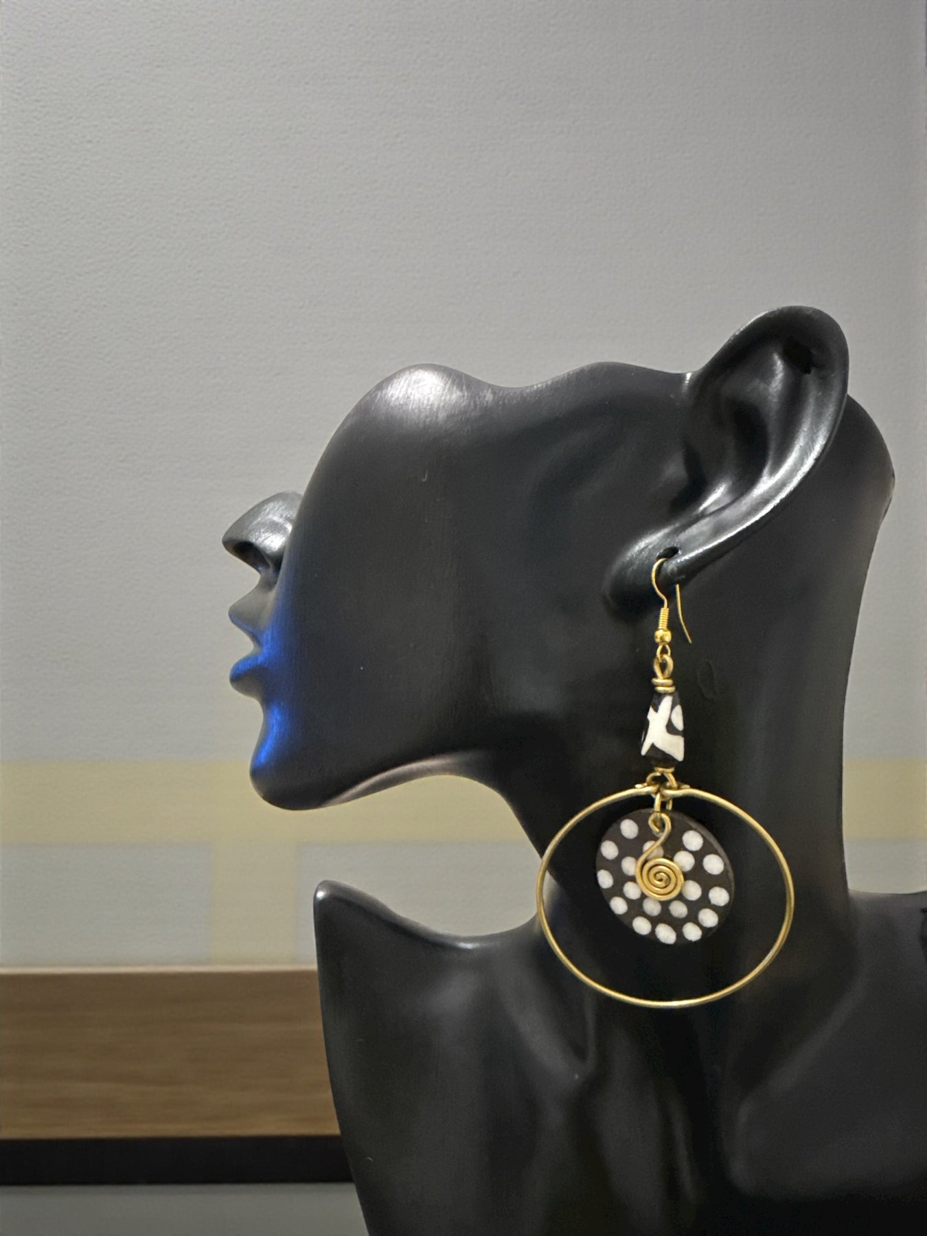 These handcrafted statement earrings blend bold geometry, natural African artistry, and modern elegance. Designed with a carved dotted pendant framed inside a gold-tone hoop, this pair brings movement, culture, and character to any look.