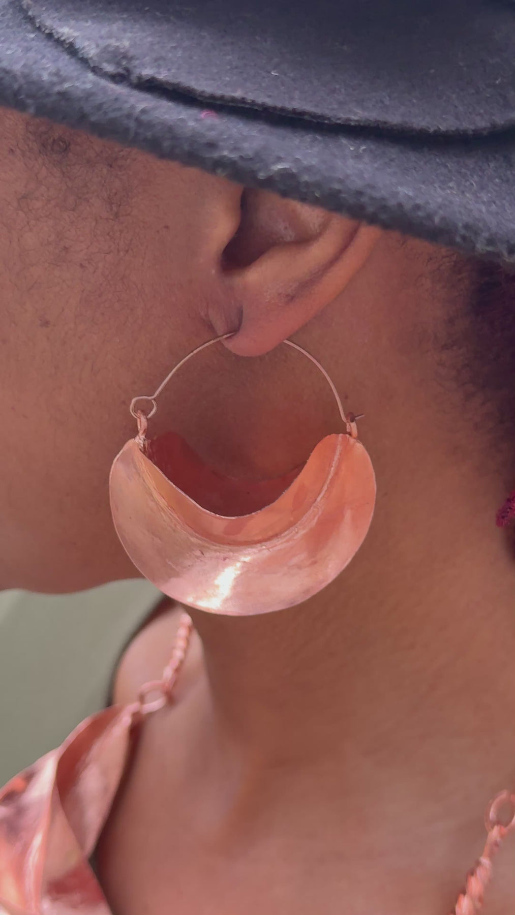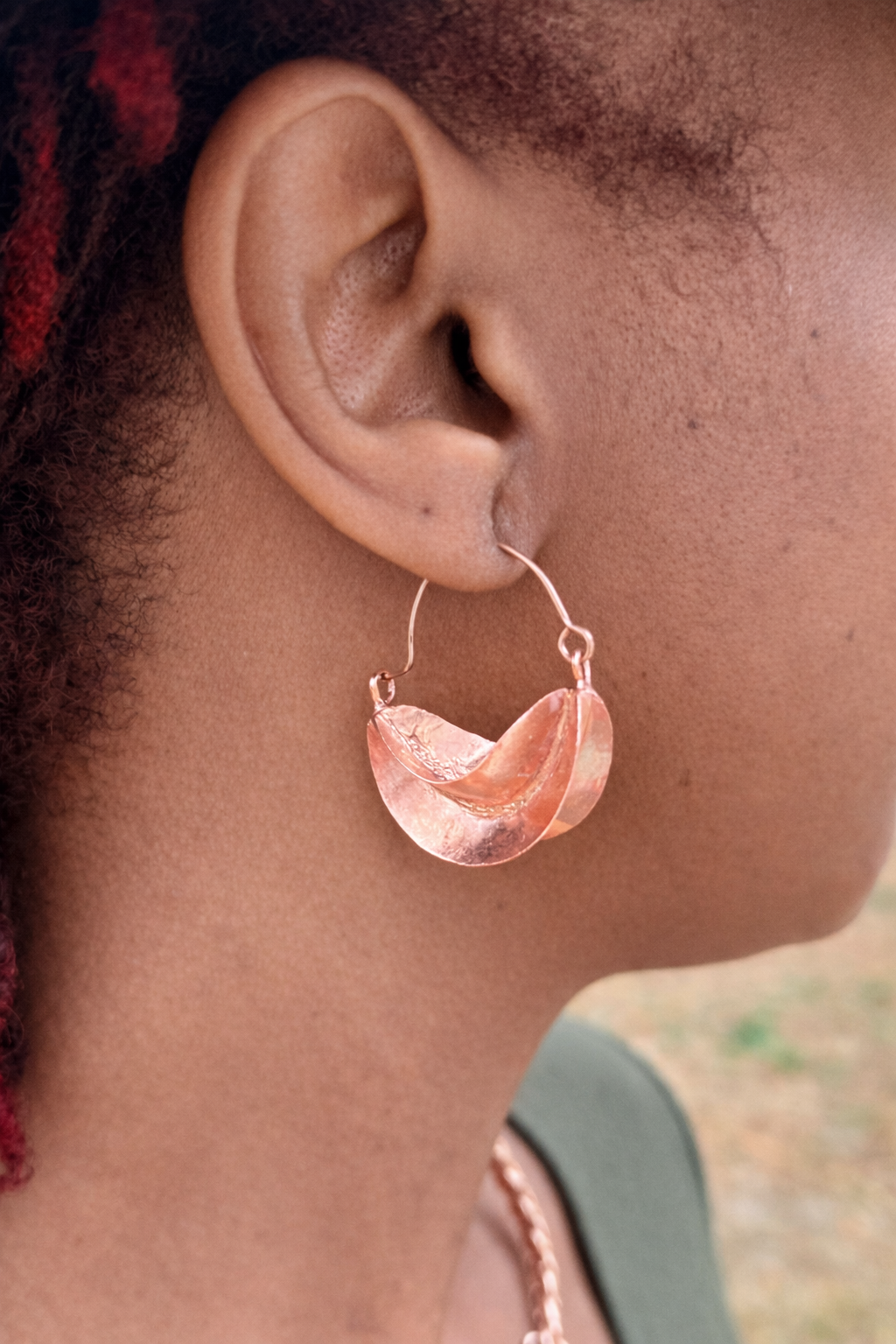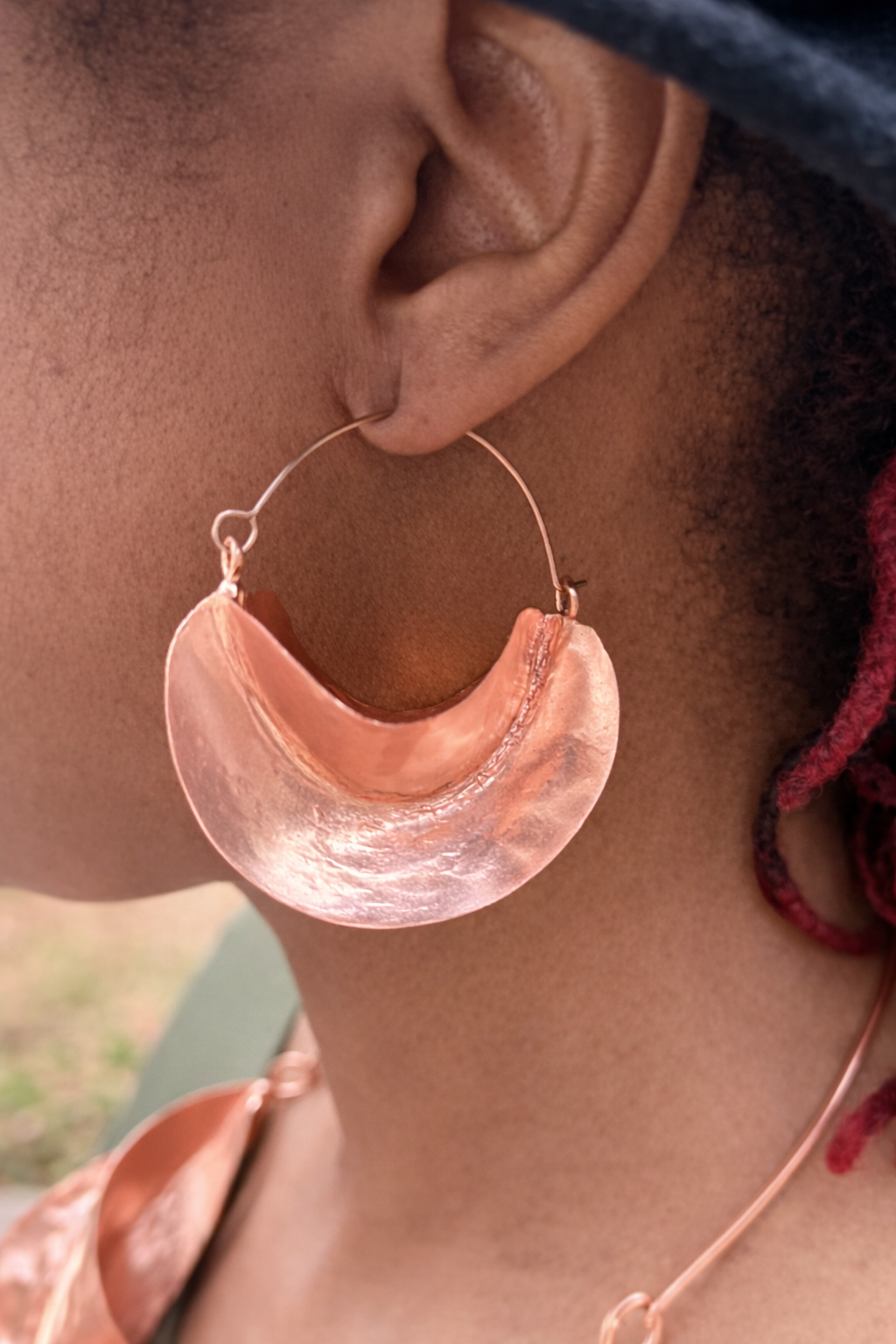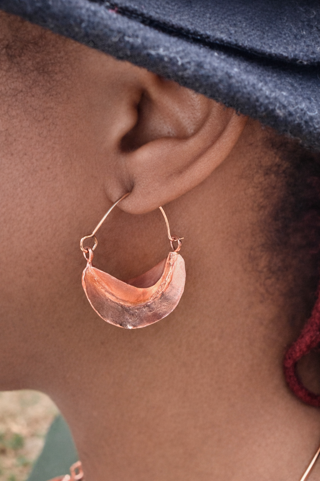 Rooted in traditional Fulani design, these handcrafted copper earrings feature a timeless crescent silhouette suspended on classic hoops. The sculpted form and warm copper tone create a bold yet refined statement that pairs effortlessly with everyday wear or elevated looks.