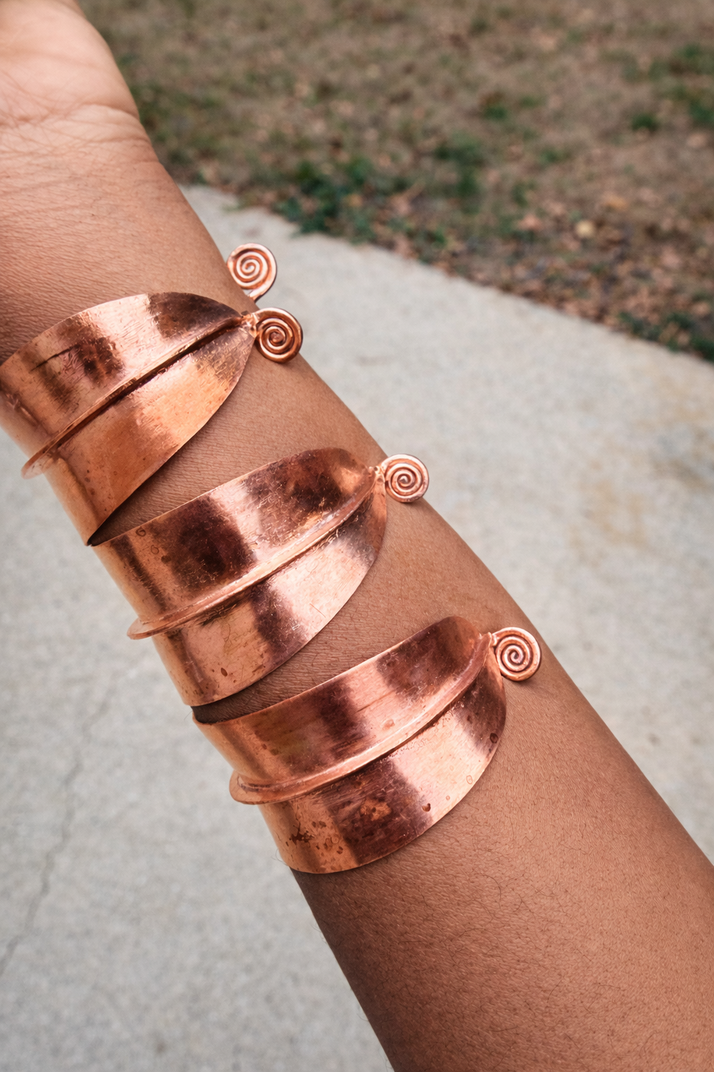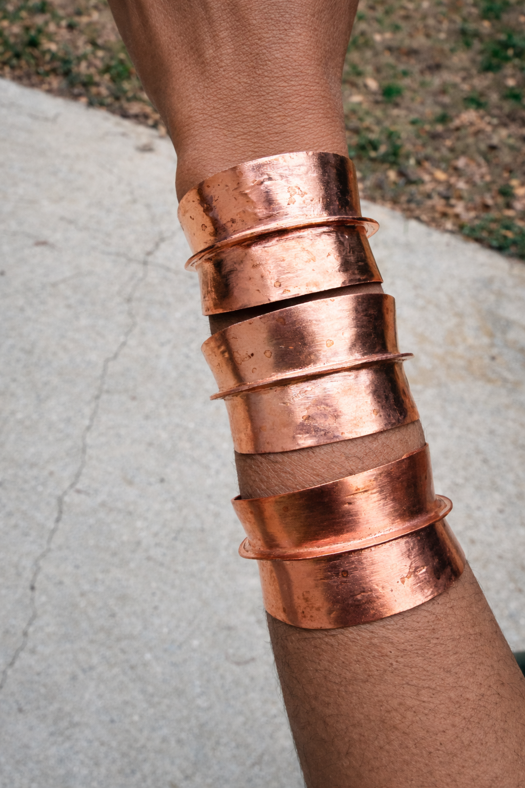 Inspired by traditional Fulani adornment, this handcrafted copper cuff is a bold yet timeless statement piece. The wide, sculpted band wraps the wrist with a strong presence while maintaining a clean, minimal silhouette that complements both everyday and elevated looks.