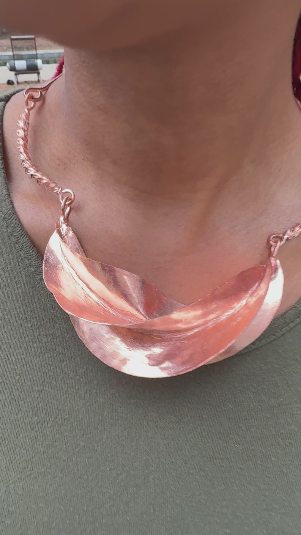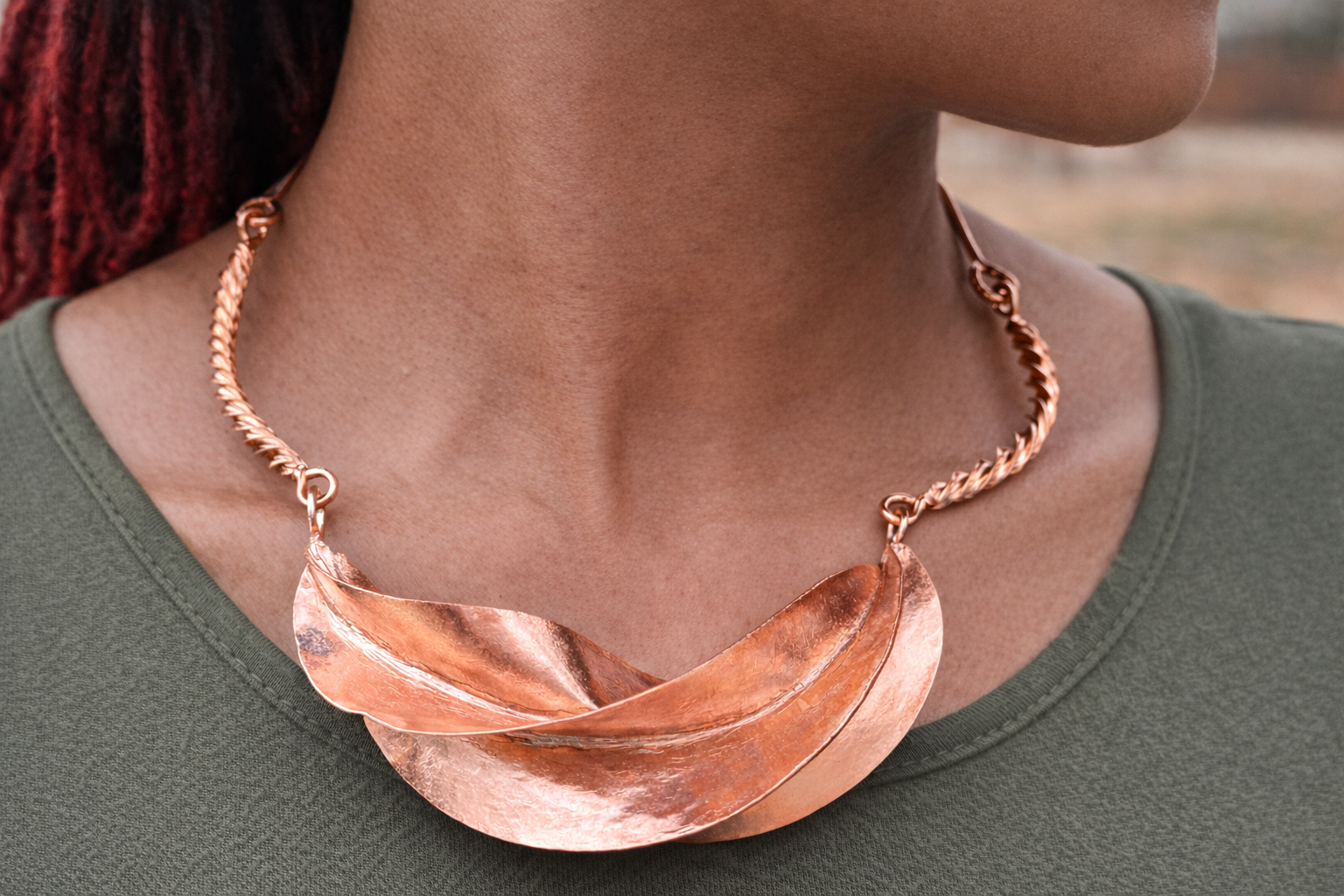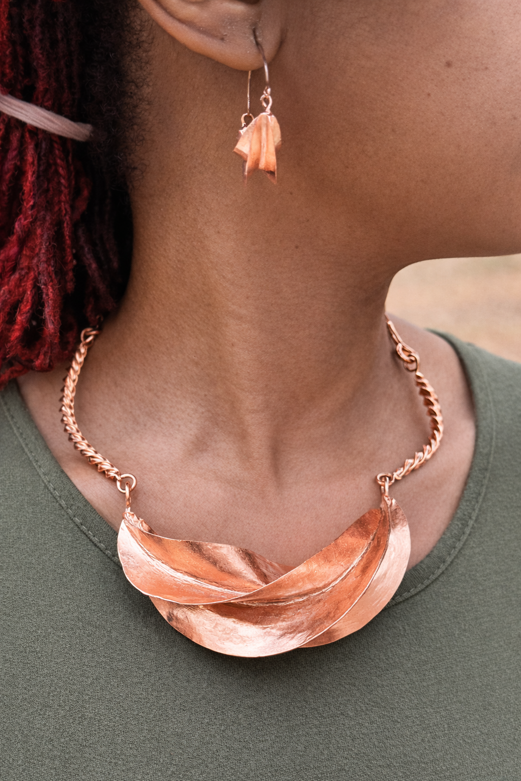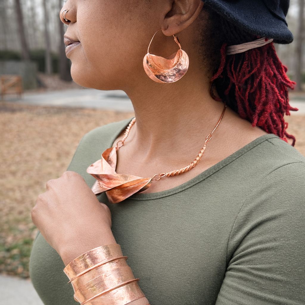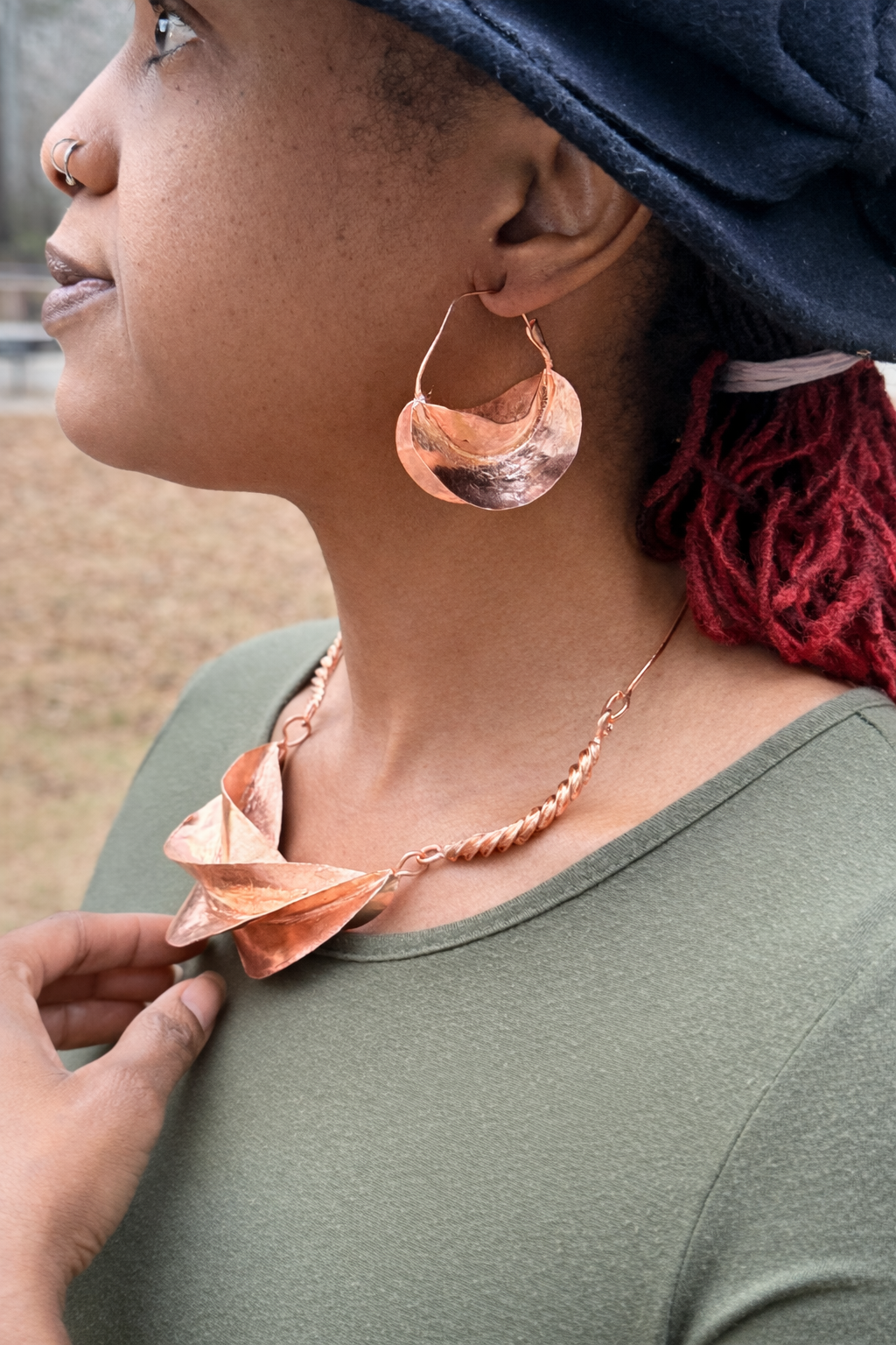 Each copper element is hand-shaped and textured, creating natural depth, movement, and light reflection. The twisted copper chain detail adds strength and visual contrast, making this piece both artistic and wearable.