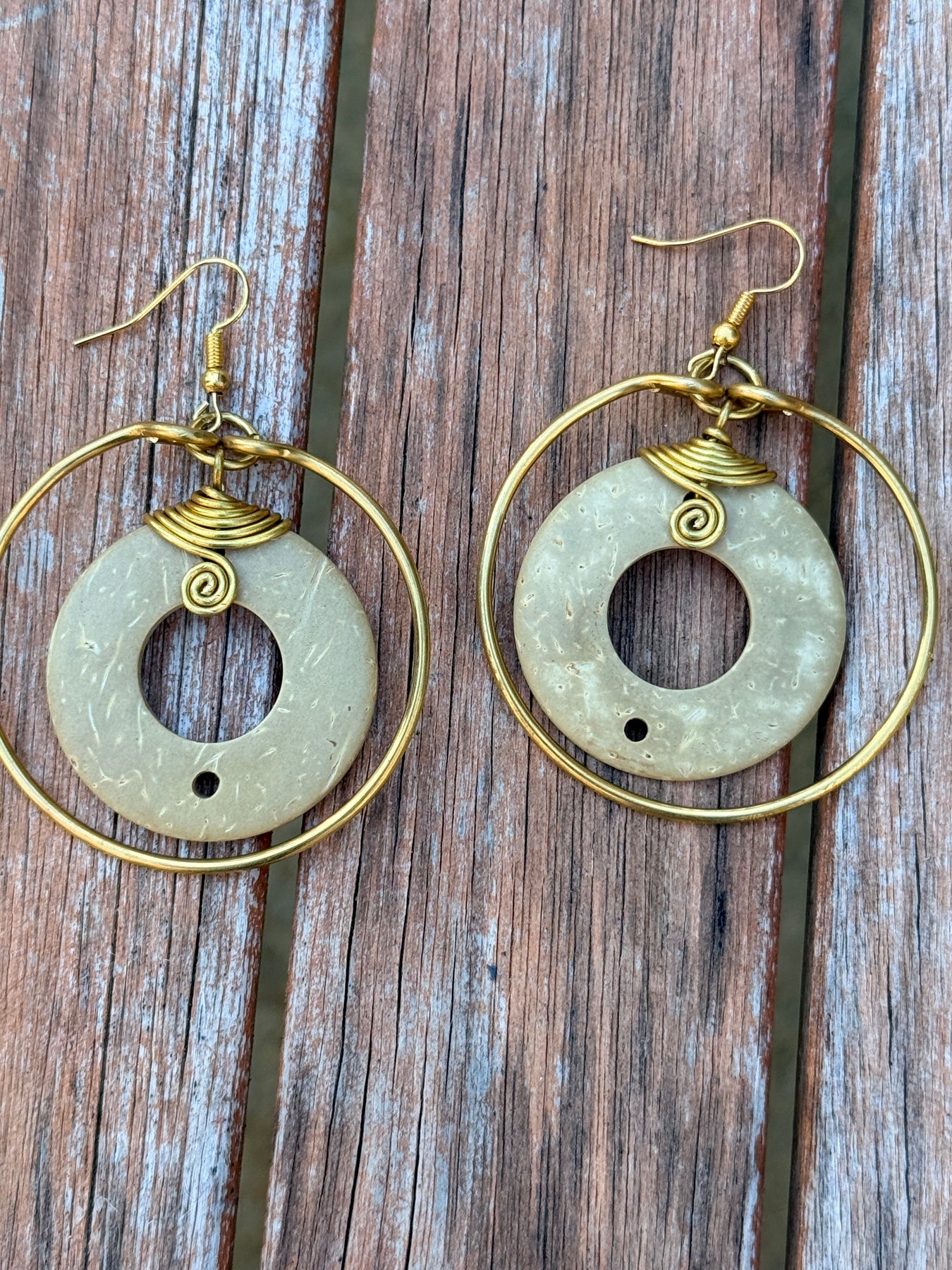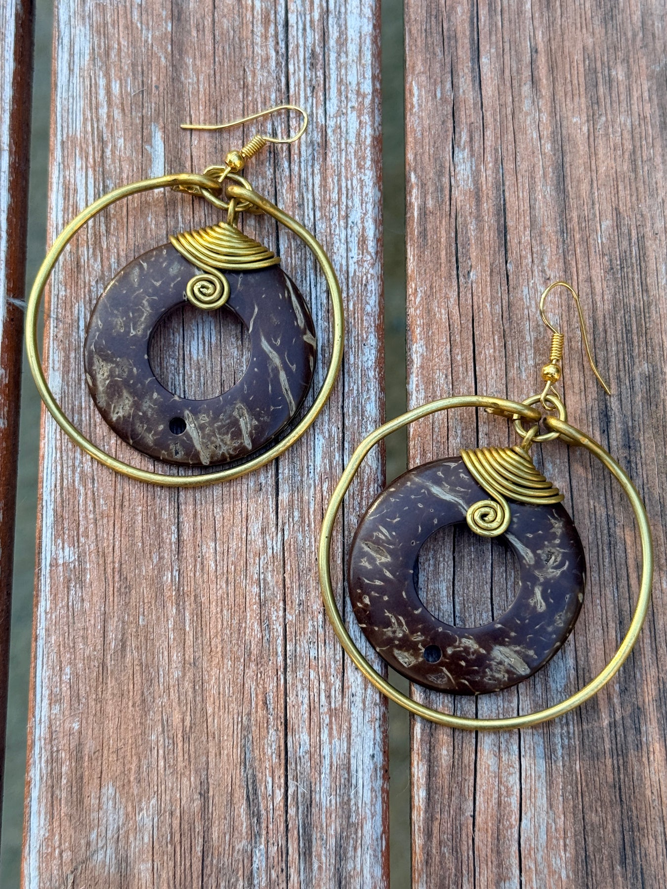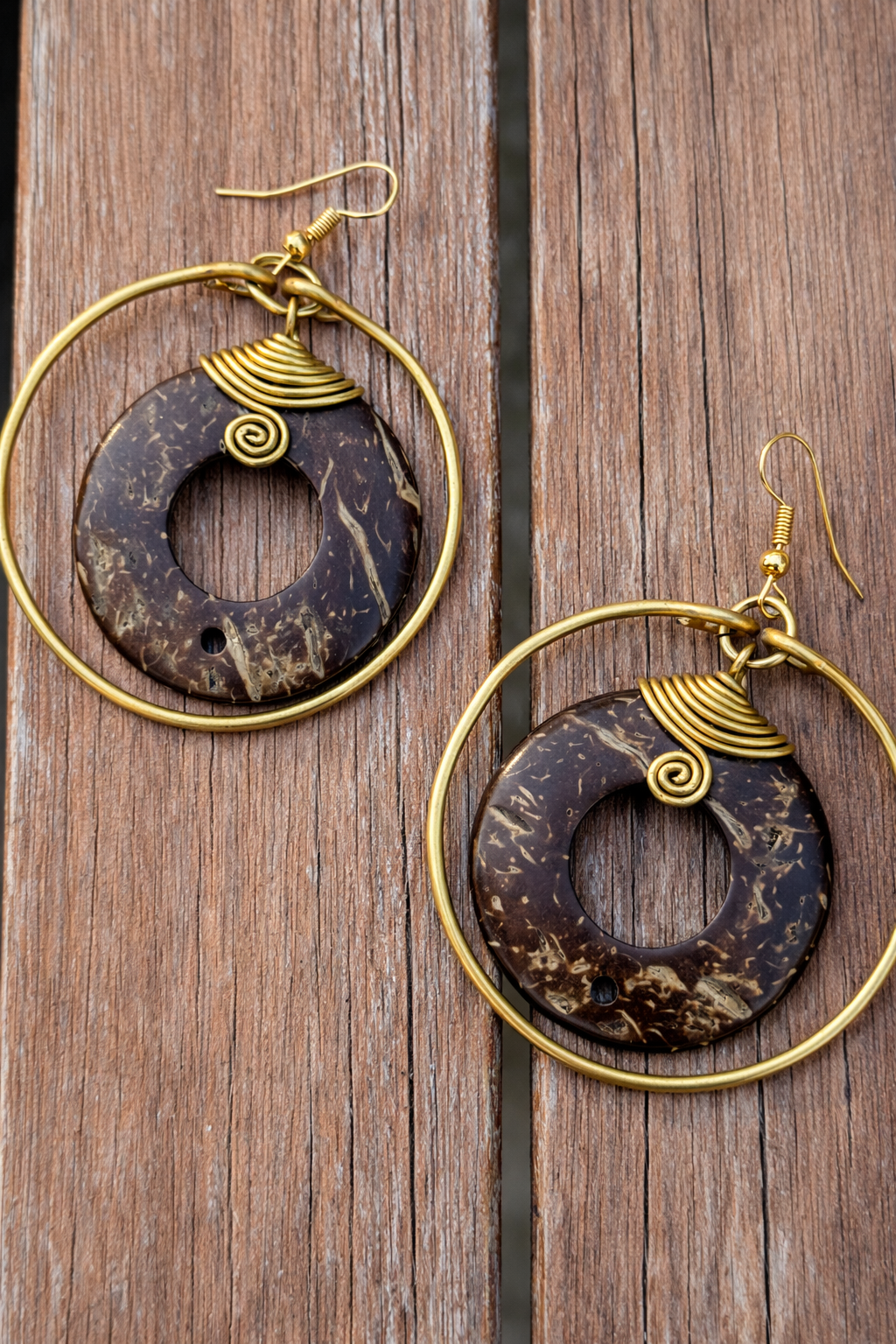 These statement earrings are handcrafted using natural coconut shell and wrapped in warm brass wire, creating a striking fusion of texture and movement. The open-circle design symbolizes wholeness and continuity, while the spiral brass detail reflects growth and feminine strength.