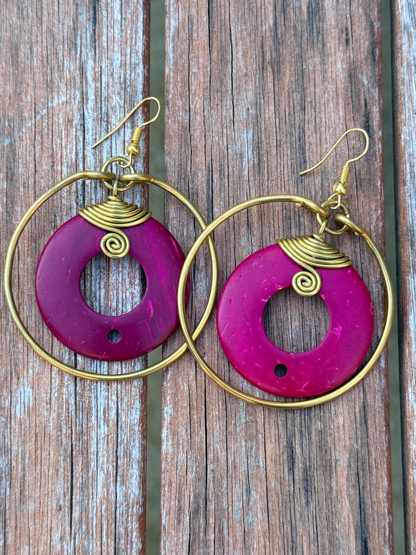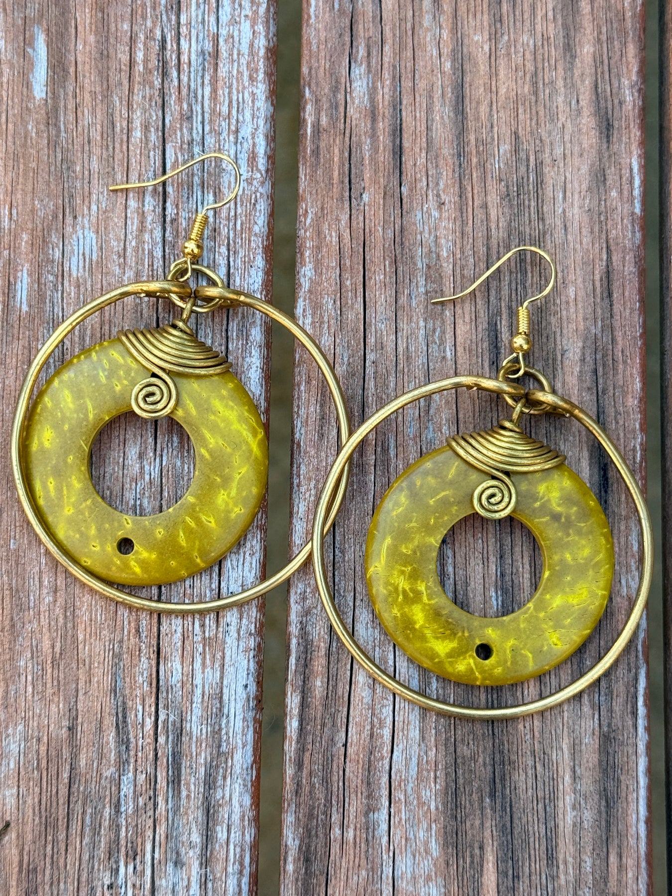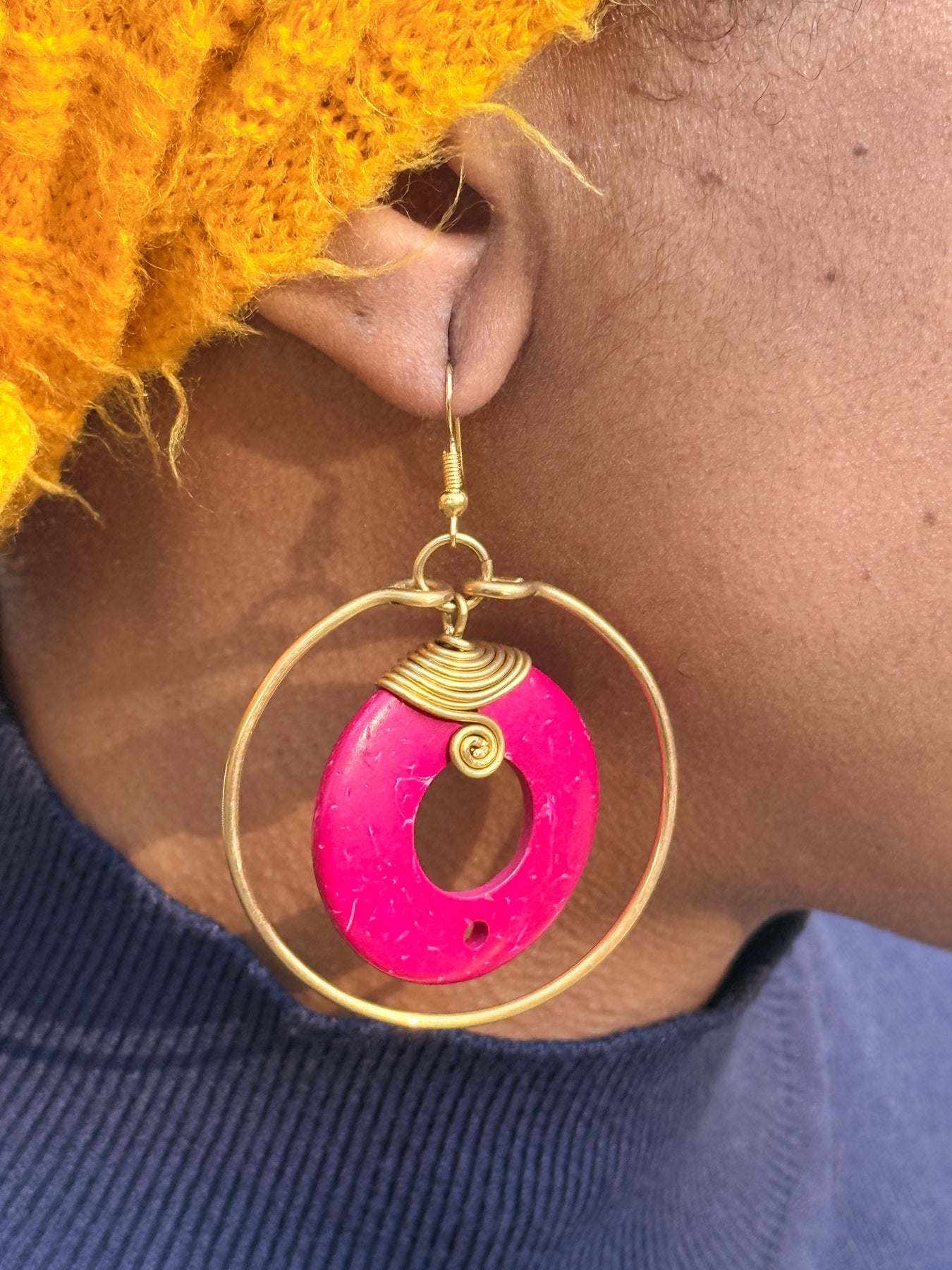 These statement earrings are handcrafted using natural coconut shell and wrapped in warm brass wire, creating a striking fusion of texture and movement. The open-circle design symbolizes wholeness and continuity, while the spiral brass detail reflects growth and feminine strength.