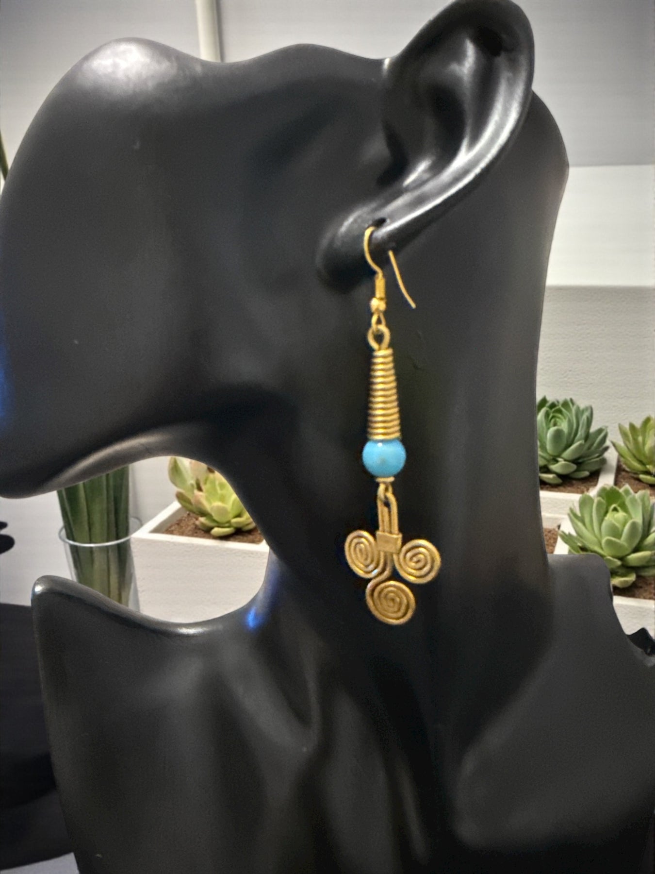 These elegant handmade earrings feature the timeless African tri-spiral motif, symbolizing unity, balance, and connection. Each pair is crafted with a tapered brass-wrapped cone, a smooth round glass bead, and three hand-shaped spirals that create a distinctive and meaningful finish. Lightweight yet full of character, these earrings bring cultural artistry into everyday style.