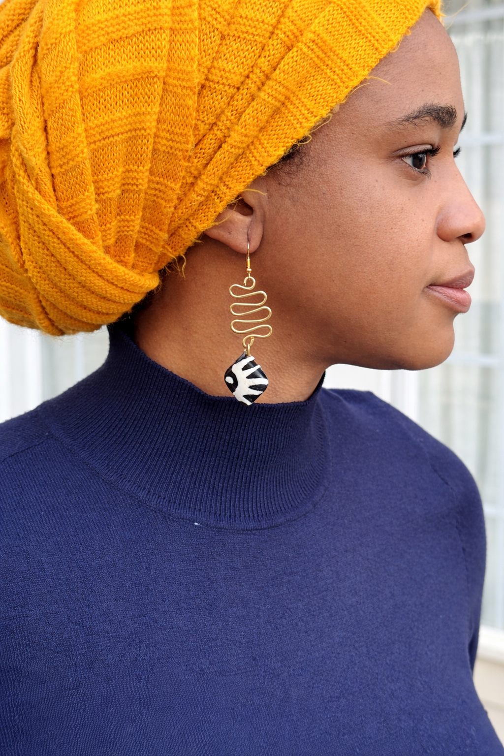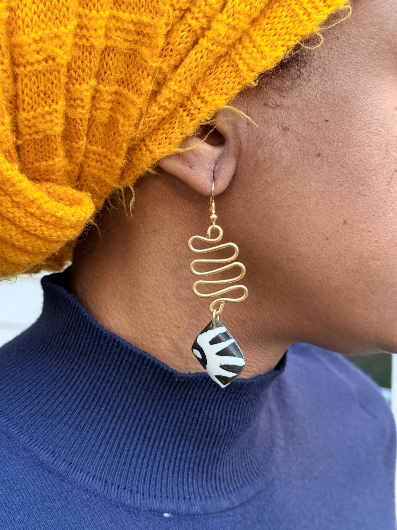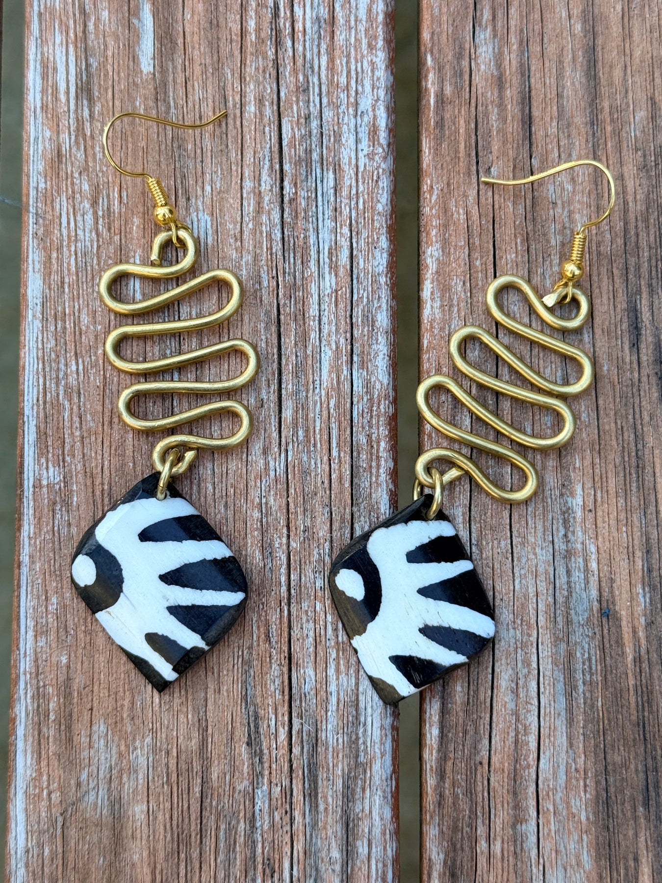 These handcrafted spiral earrings are designed to command attention while honoring African-inspired artistry. The fluid brass coil represents continuity and movement — a reminder that life flows in cycles. Anchored by a striking zebra-patterned bead, this piece balances strength and elegance in one powerful silhouette.