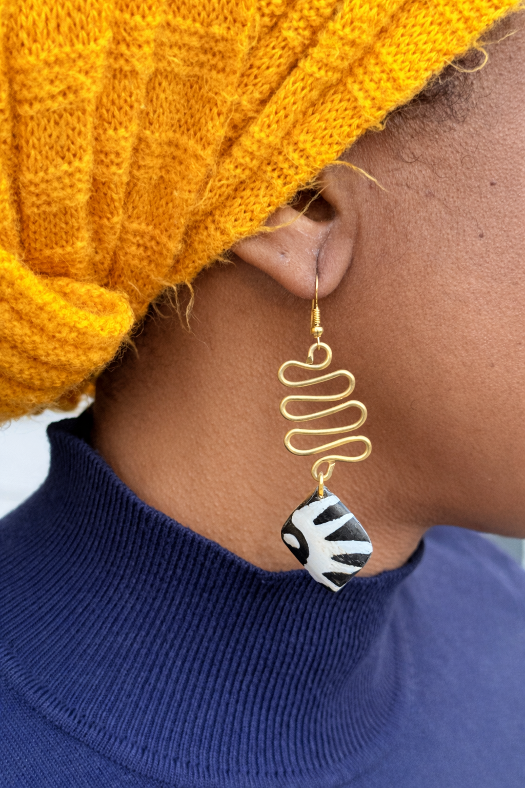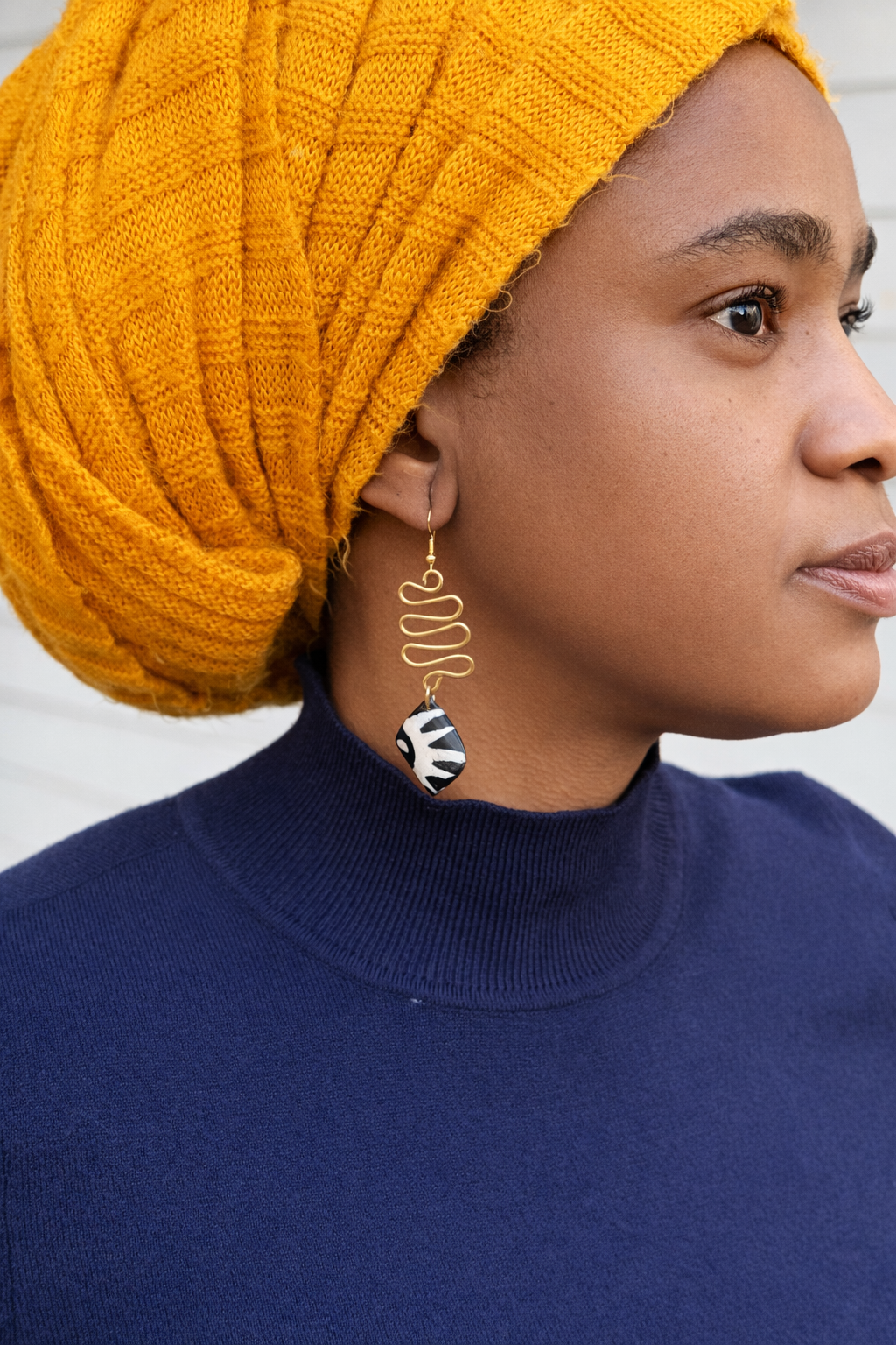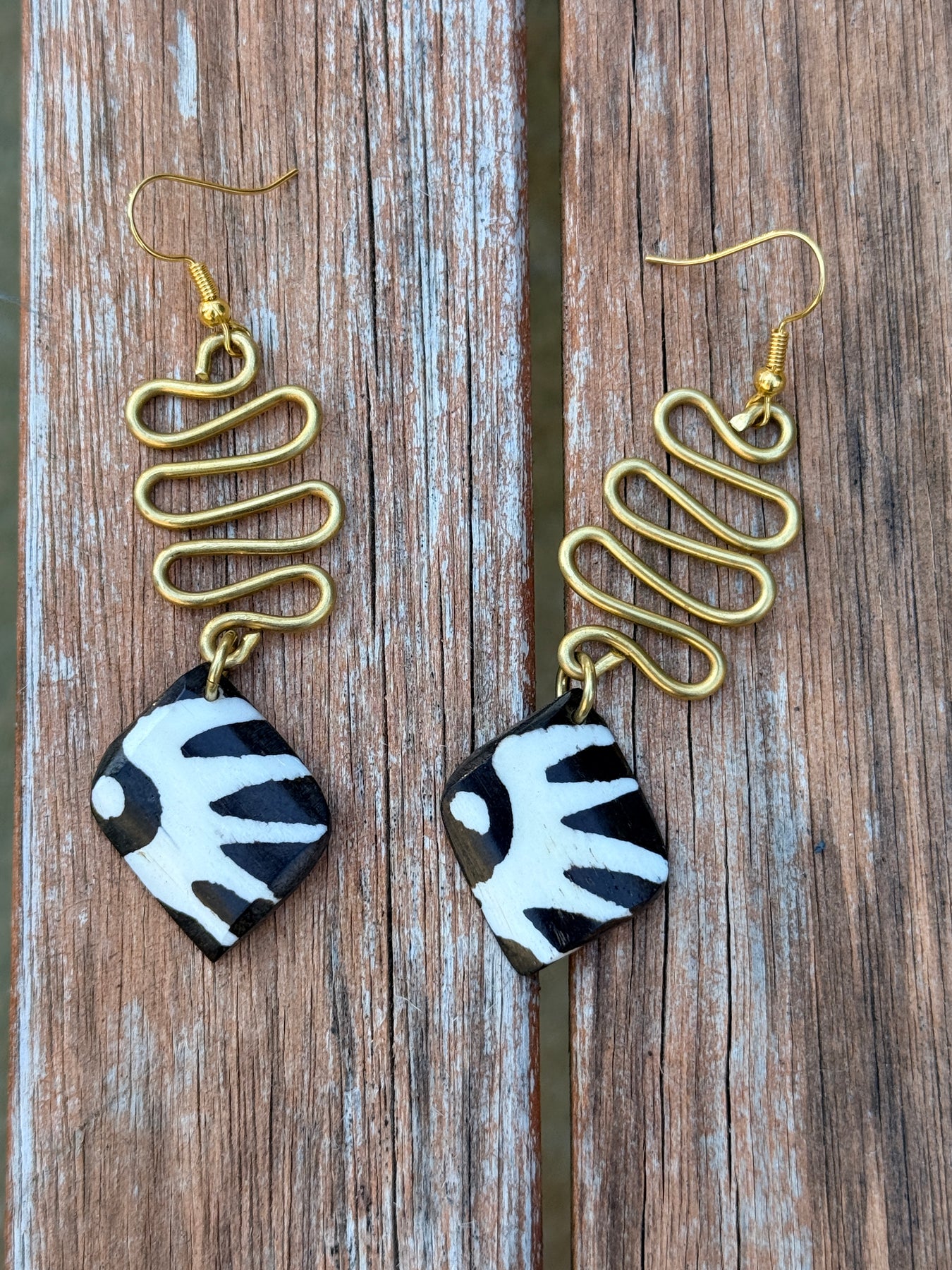 These handcrafted spiral earrings are designed to command attention while honoring African-inspired artistry. The fluid brass coil represents continuity and movement — a reminder that life flows in cycles. Anchored by a striking zebra-patterned bead, this piece balances strength and elegance in one powerful silhouette.