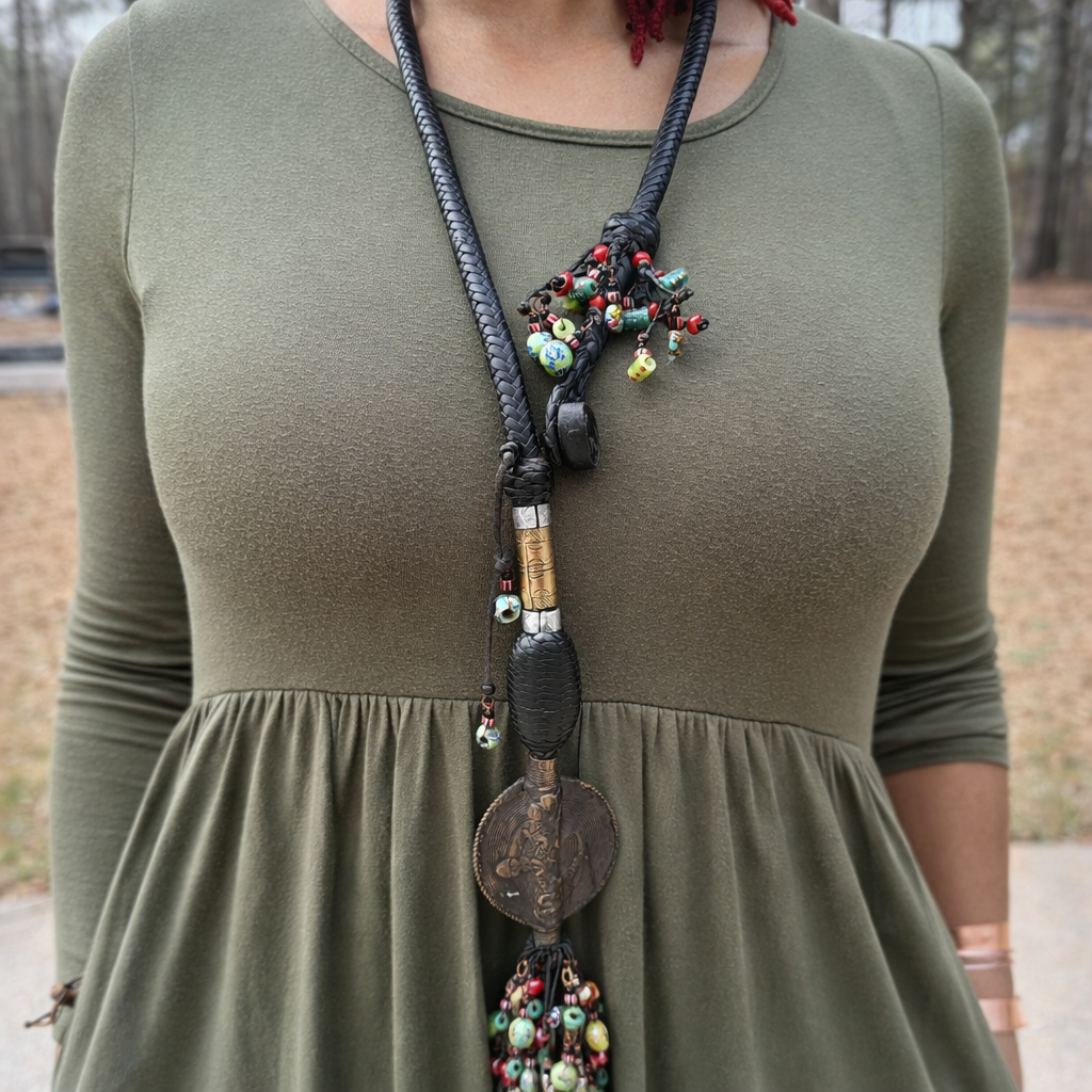 Introducing the Nyara Heritage Necklace-Belt, a versatile and inspiring piece of African artistry. Handcrafted by skilled Malian artisans, this accessory is designed to celebrate your beauty and individuality. Its multifunctional design allows it to be styled as a bold statement necklace or a chic waist belt, perfect for waist sizes 31 inches and smaller.